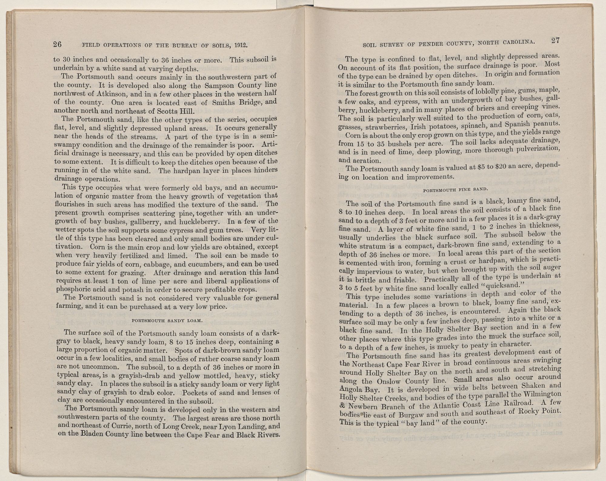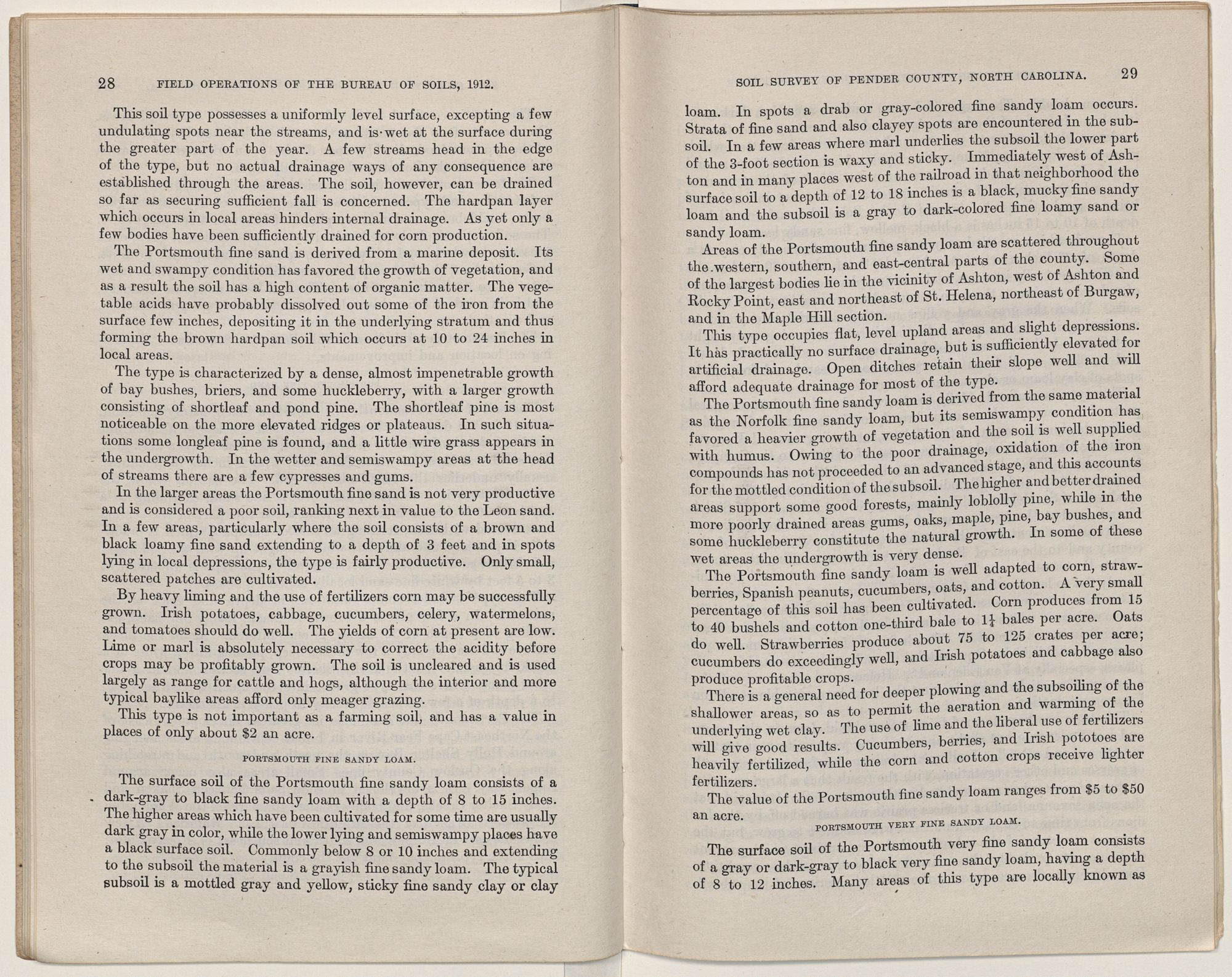 The Portsmouth types have dark to black surface soils and mottled gray and yellow subsoils. A part of this series remains in a semi-swampy condition, the surface drainage being poorly established. Strawberries make their best development upon the sandy loams,