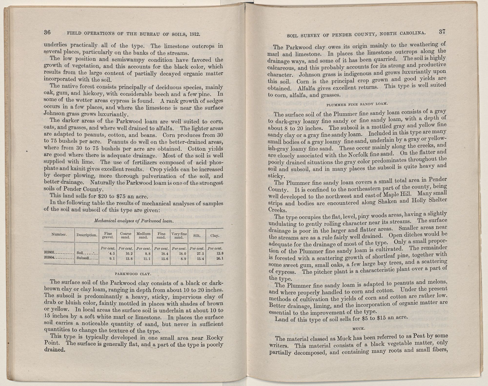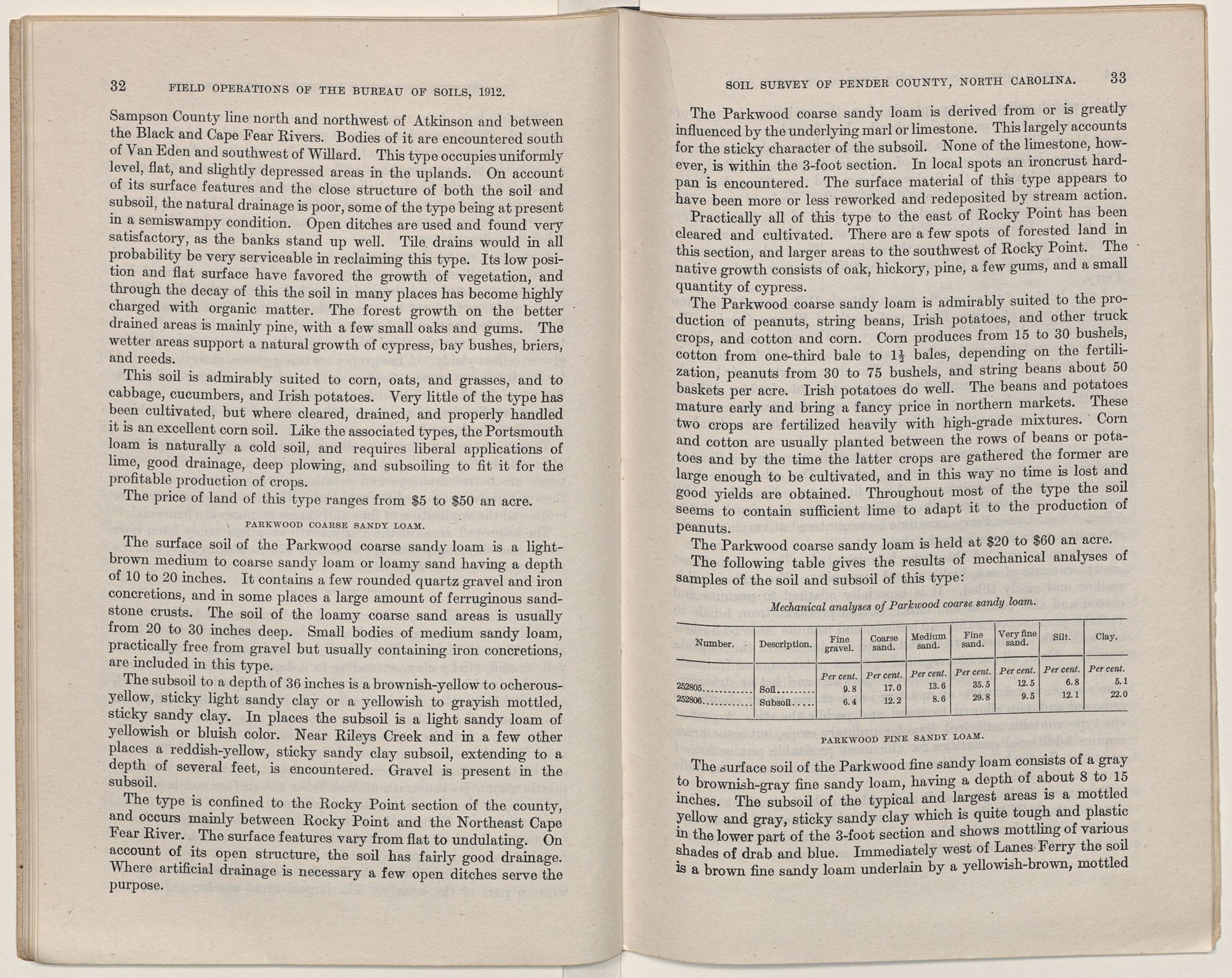 The darker areas of the Parkwood loam are well suited to corn, oats, and grasses, and where well drained to alfalfa. The lighter areas are adapted to peanuts, cotton, and beans. Corn produces from 30 to 75 bushels per acre. Peanuts do well on the better-drained areas, where from 30 to 75 bushels per acre are obtained. Cotton yields are good where there is adequate drainage. Most of the soil is well supplied with lime. The use of fertilizers composed of acid phosphate and kainit gives excellent results. Crop yields can be increased by deeper plowing, more thorough pulverization of the soil, and better drainage. Naturally the Parkwood loam is one of the strongest soils of Pender County.