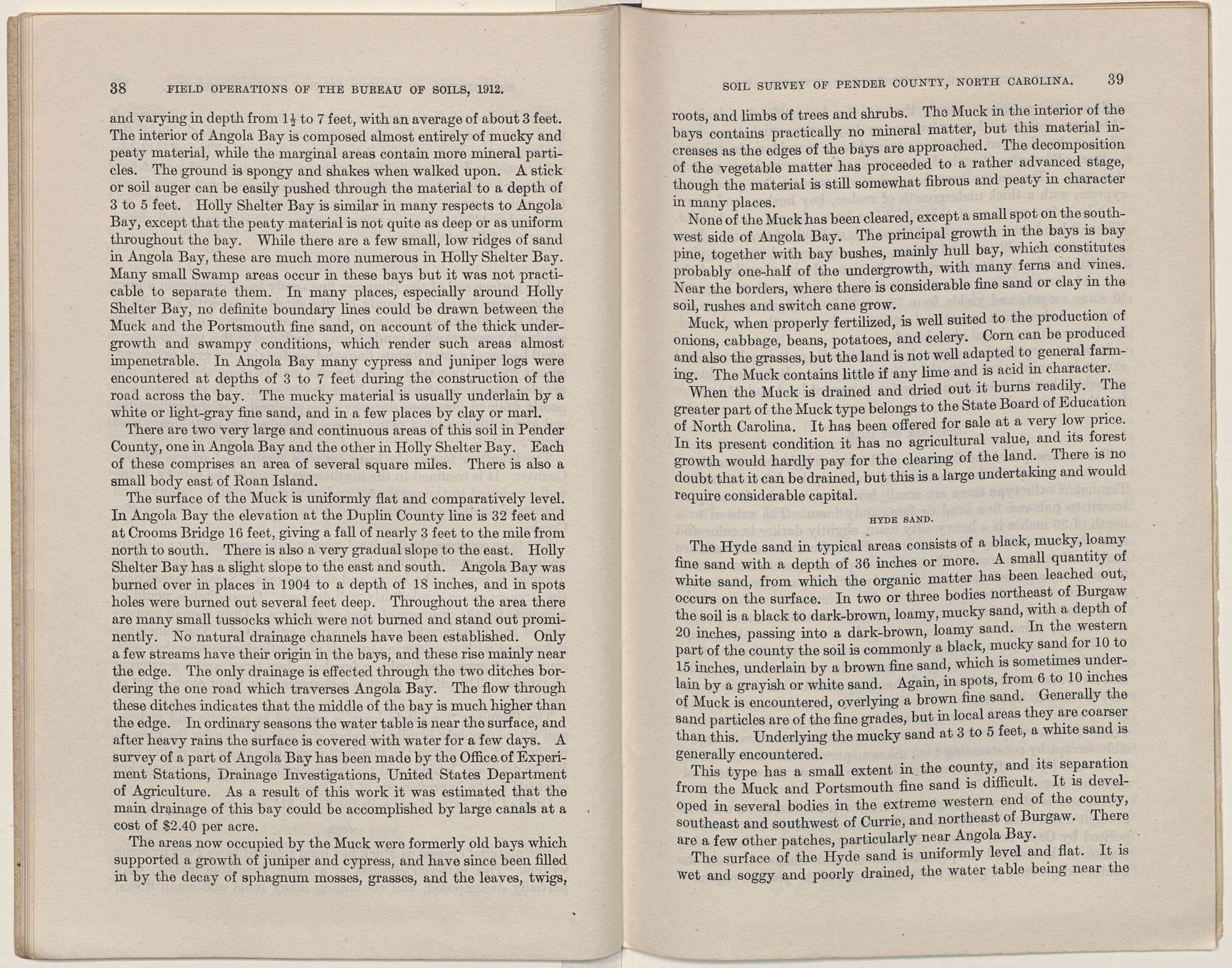 The surface of the Muck is uniformly flat and comparatively level. In Angola Bay the elevation at the Duplin County line is 32 feet and at Crooms Bridge 16 feet, giving a fall of nearly 3 feet to the mile from north to south. There is also a very gradual slope to the east. Holly Shelter Bay has a slight slope to the east and south. Angola Bay was burned over in places in 1904 to a depth of 18 inches, and in spots holes were burned out several feet deep. Throughout the area there are many small tussocks which were not burned and stand out prominently. No natural drainage channels have been established. Only a few streams have their origin in the bays, and these rise mainly near the edge. The only drainage is effected through the two ditches bordering the one road which traverses Angola Bay. The flow through these ditches indicates that the middle of the bay is much higher than the edge. In ordinary seasons the water table is near the surface, and after heavy rains the surface is covered with water for a few days. A survey of a part of Angola Bay has been made by the Office of Experiment Stations, Drainage Investigations, United States Department of Agriculture. As a result of this work it was estimated that the main drainage of this bay could be accomplished by large canals at a cost of $2.40 per acre.