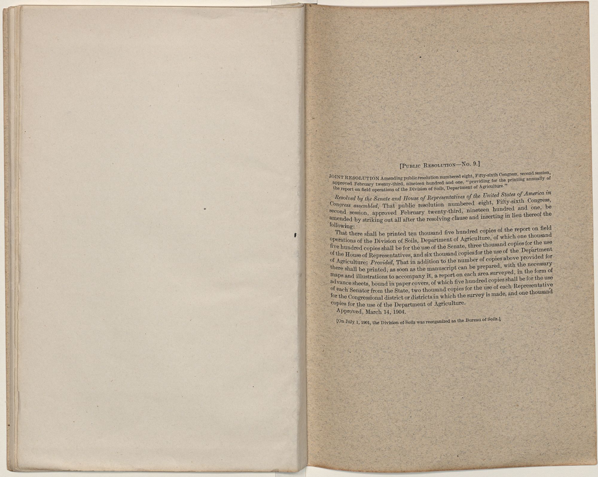 JOINT RESOLUTION Amending public resolution numbered eight, Fifty-sixth Congress, second session, approved February twenty-third, nineteen hundred and one, “providing for the printing annually of the report on field operations of the Division of Soils, Department of Agriculture.”