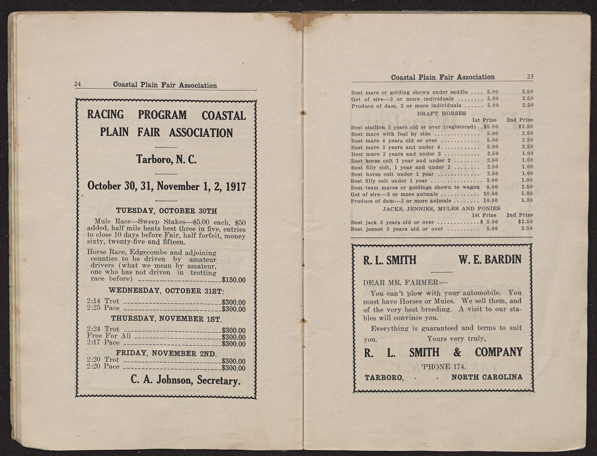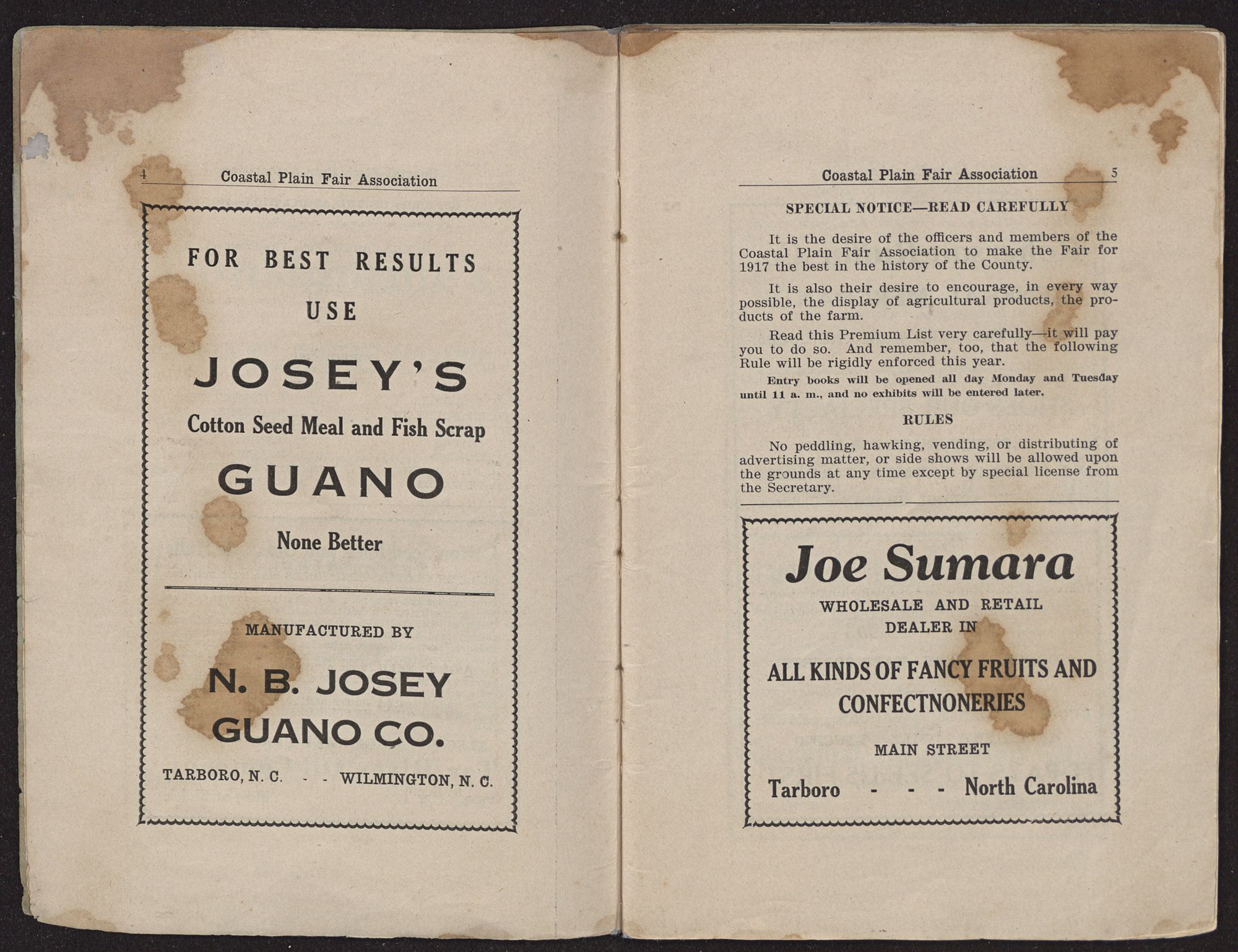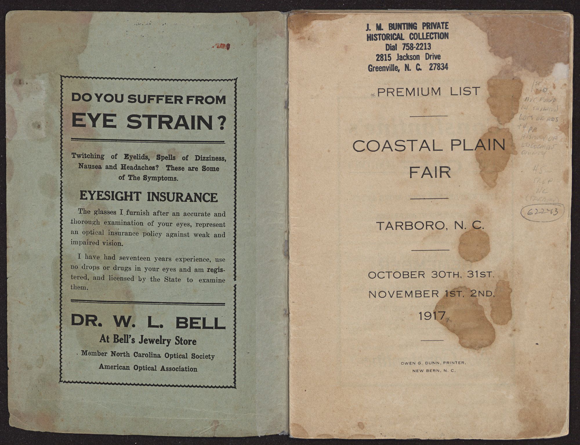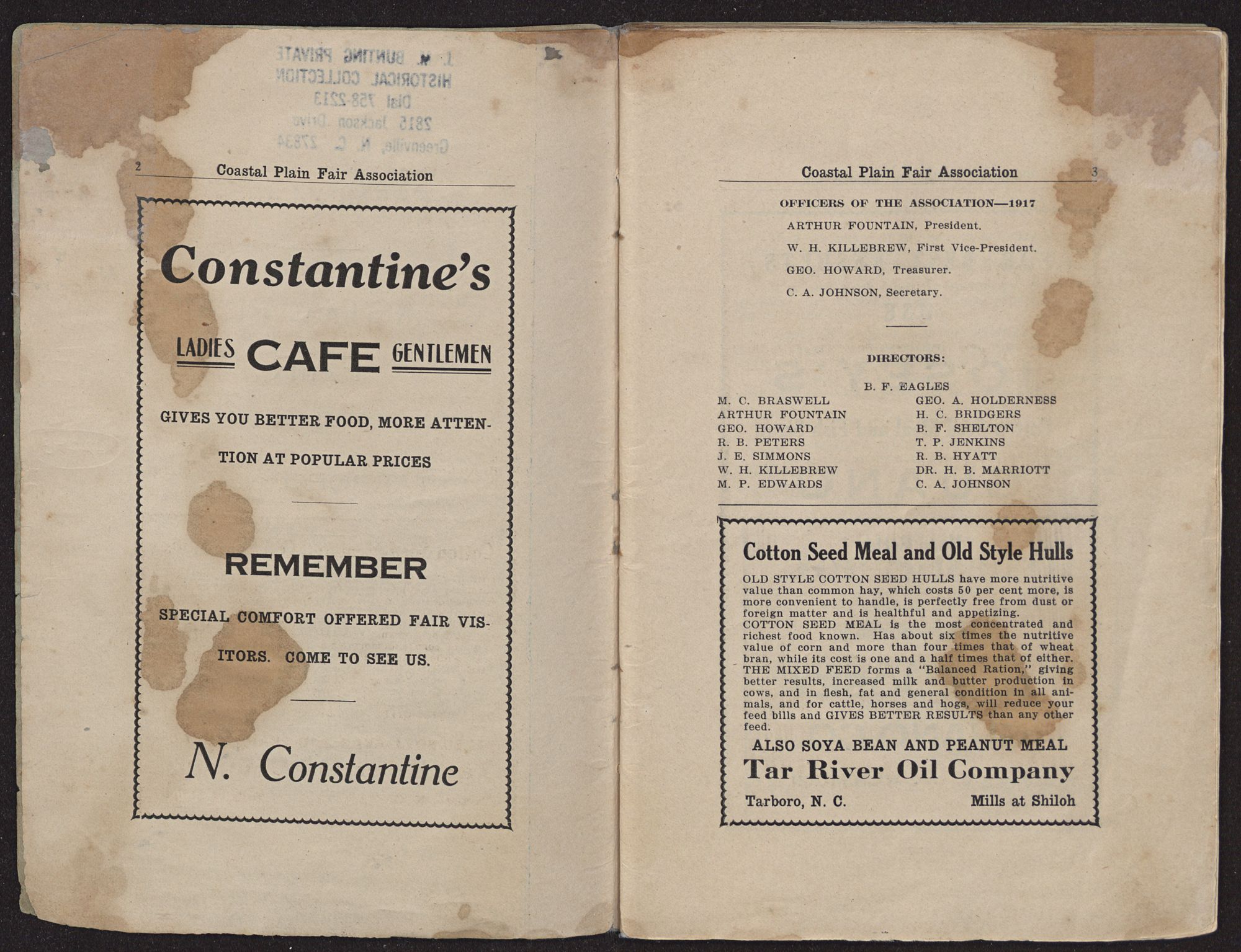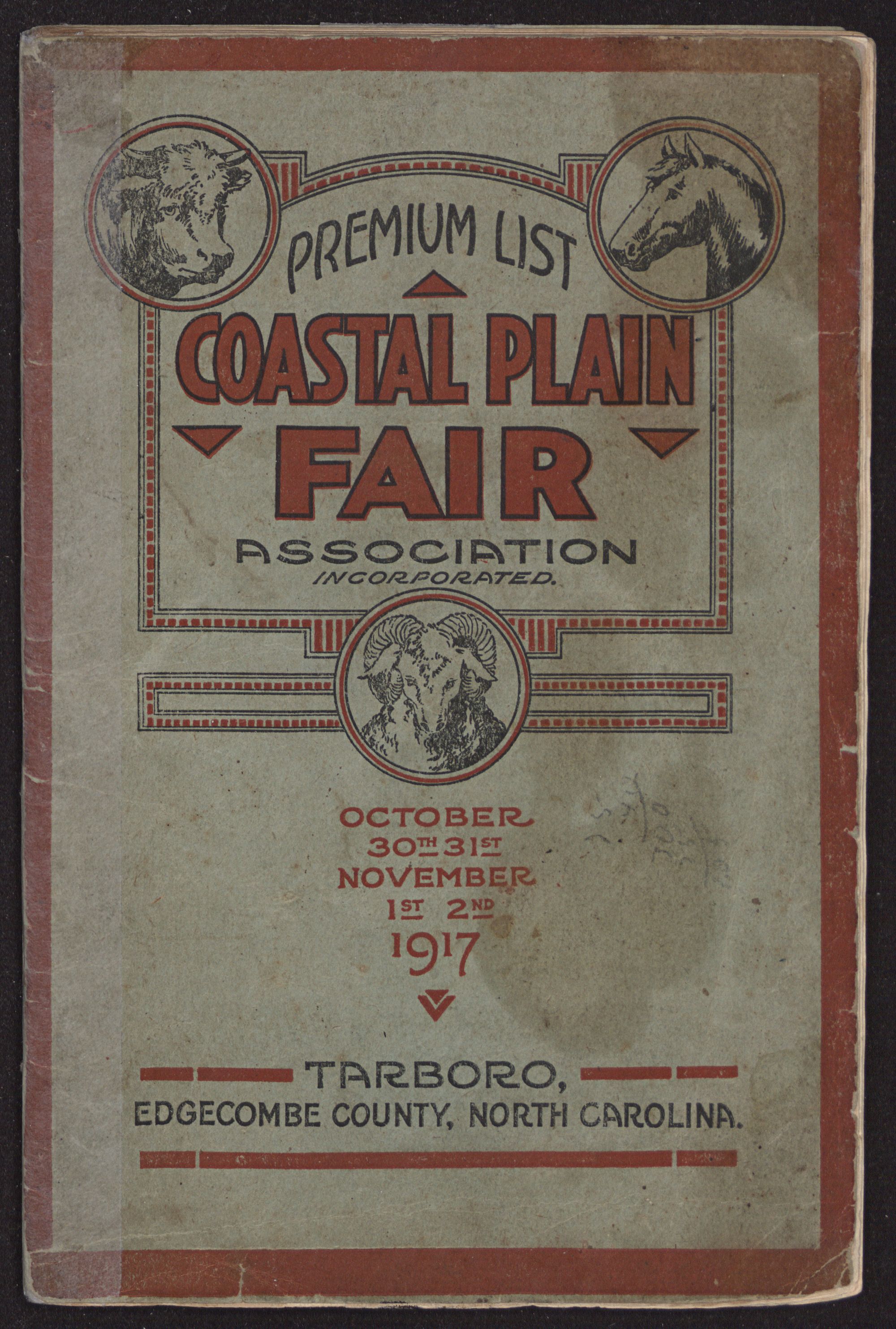 PREMIUM LISTCOASTAL PLAIN FAIR TARBORO, N. C. OCTOBER 30TH, 31ST. NOVEMBER 1ST, 2ND, 1917 OWEN G. DUNN, PRINTER.NEW BERN, N. C.Constantine's LADIES CAFE GENTLEMEN