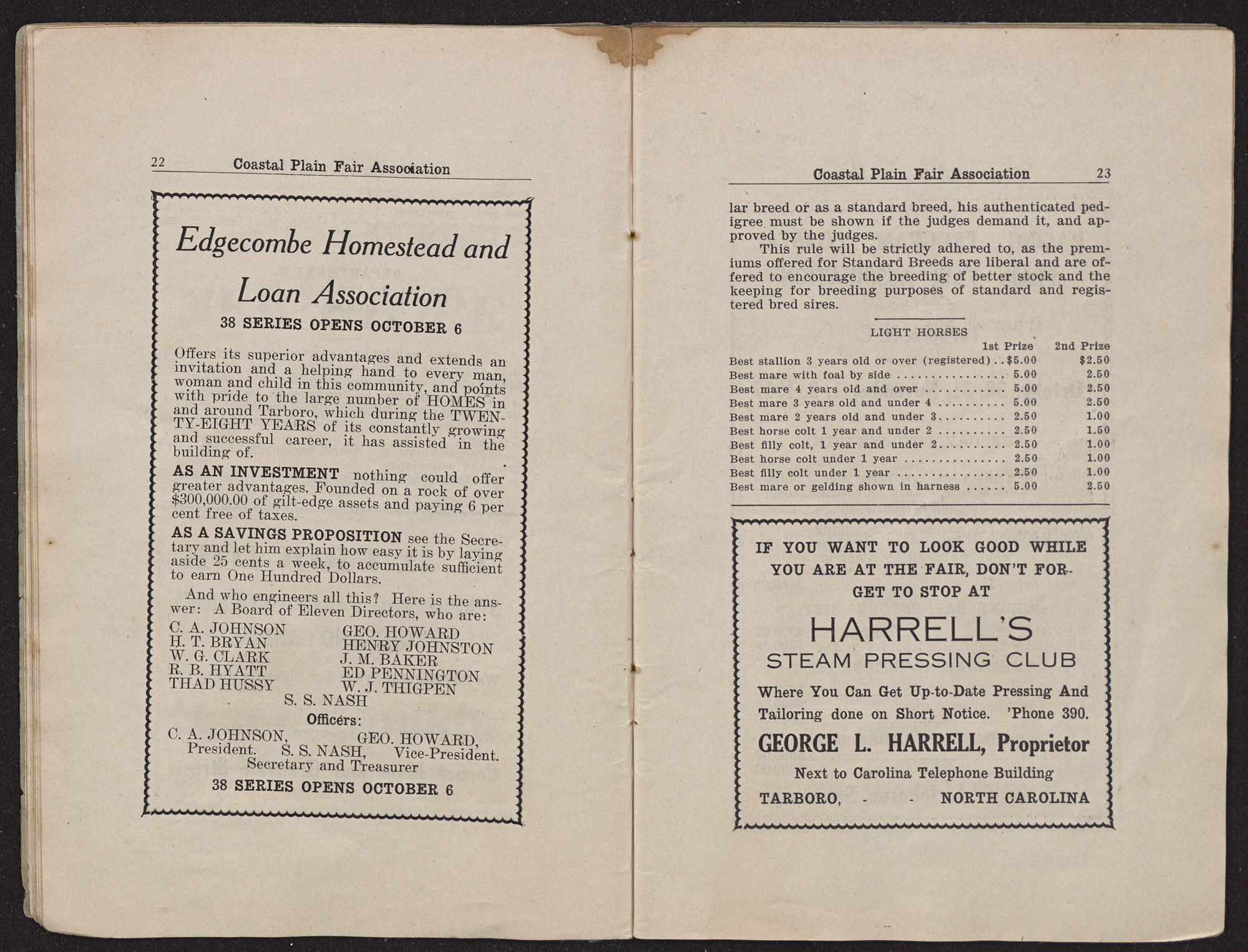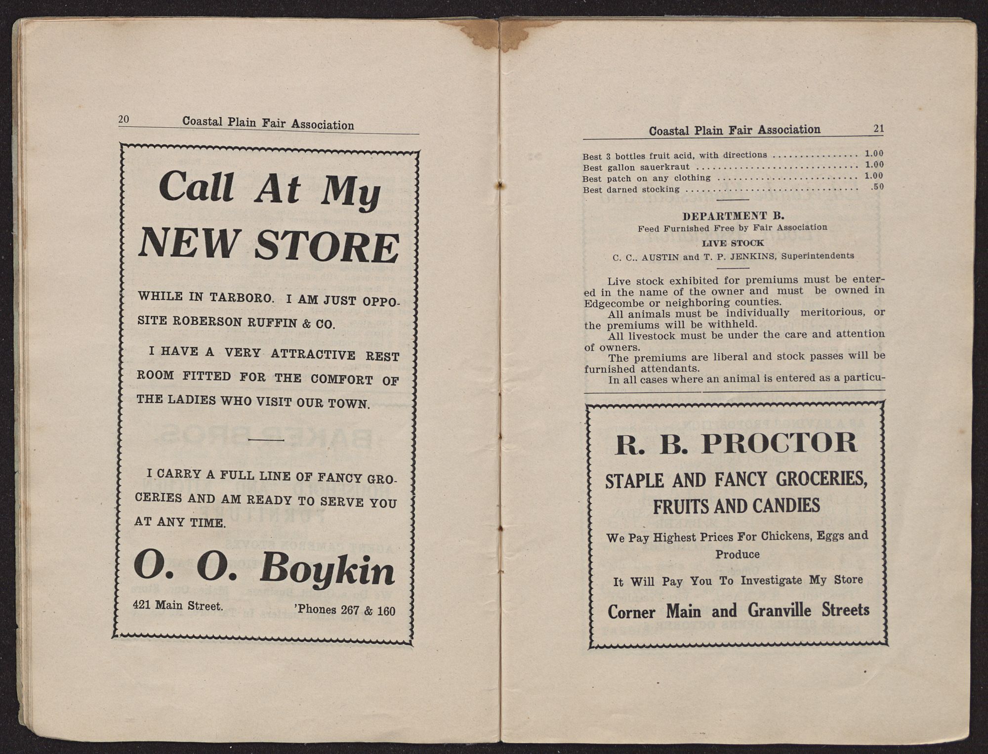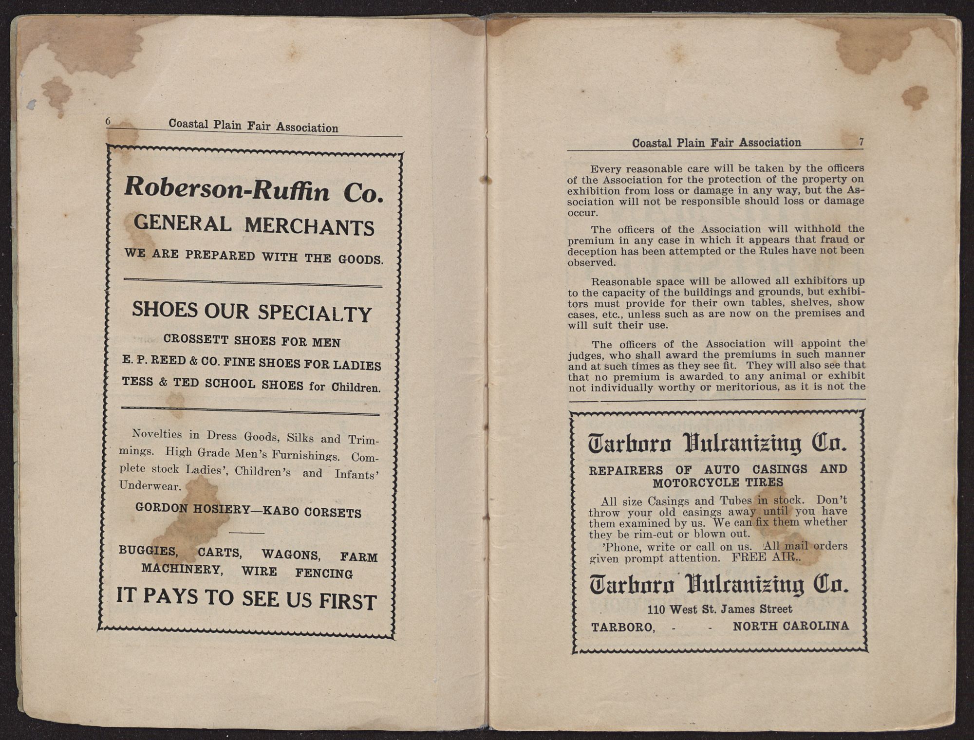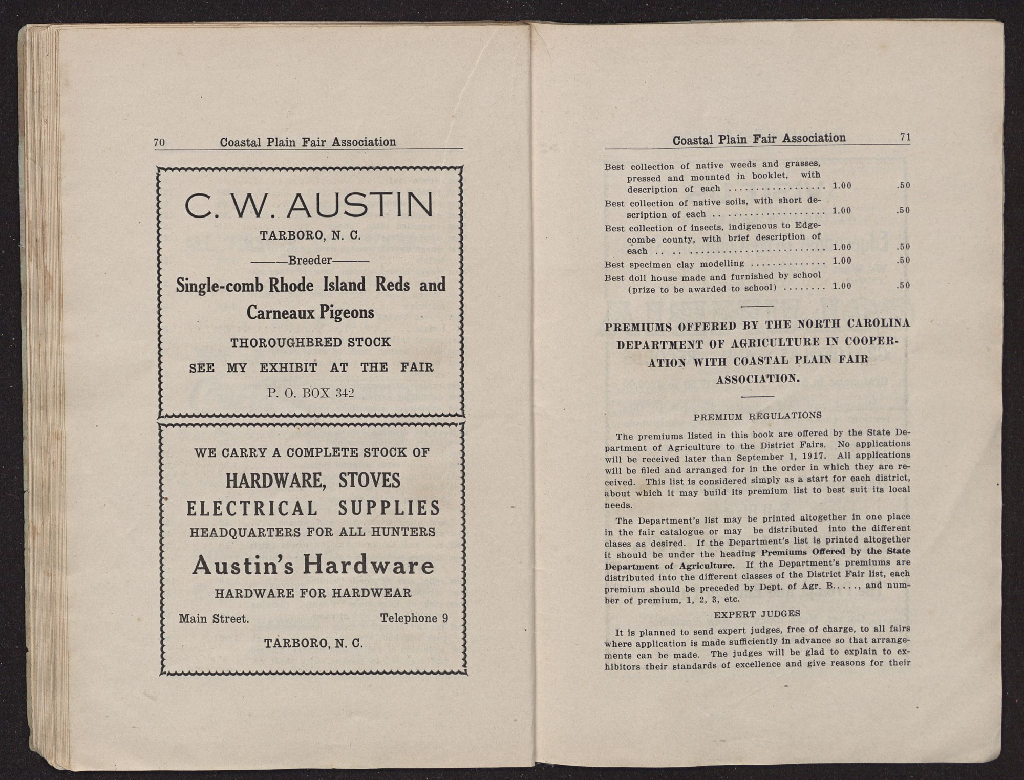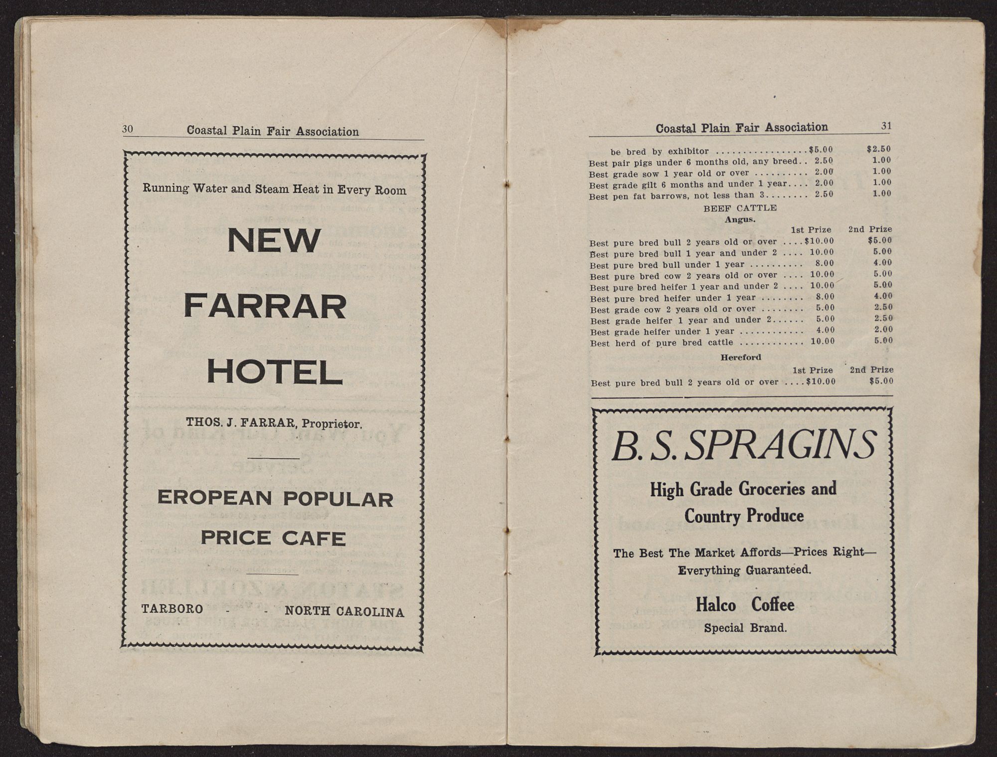PREMIUM LISTCOASTAL PLAIN FAIR TARBORO, N. C. OCTOBER 30TH, 31ST. NOVEMBER 1ST, 2ND, 1917 OWEN G. DUNN, PRINTER.NEW BERN, N. C.Constantine's LADIES CAFE GENTLEMEN