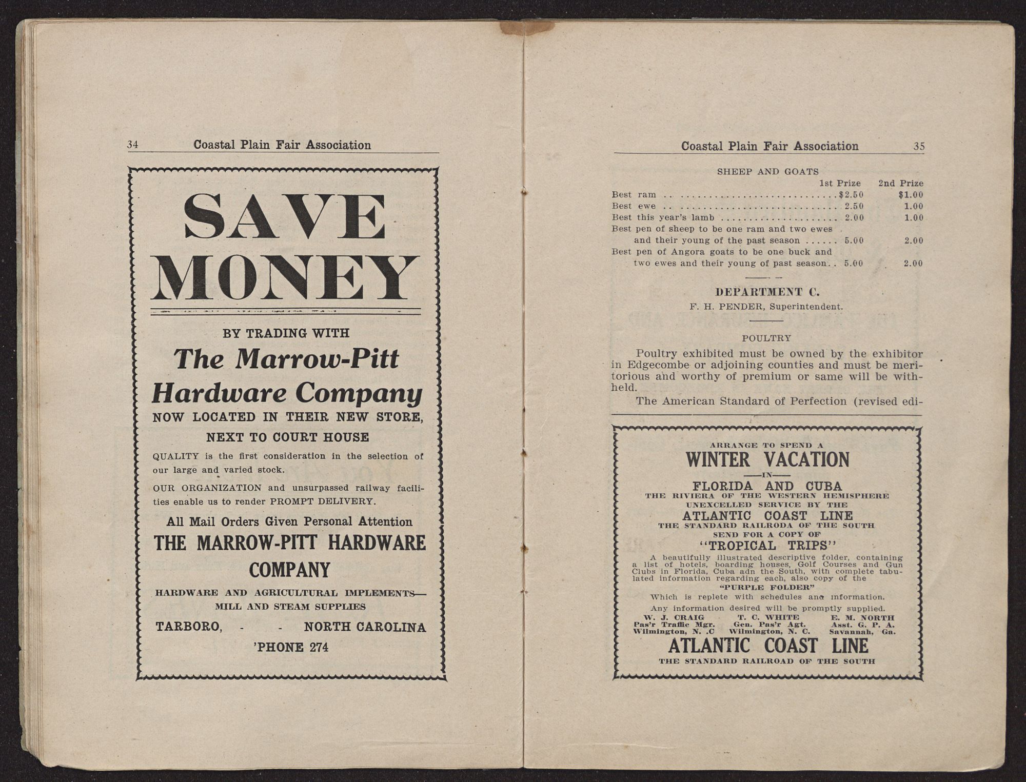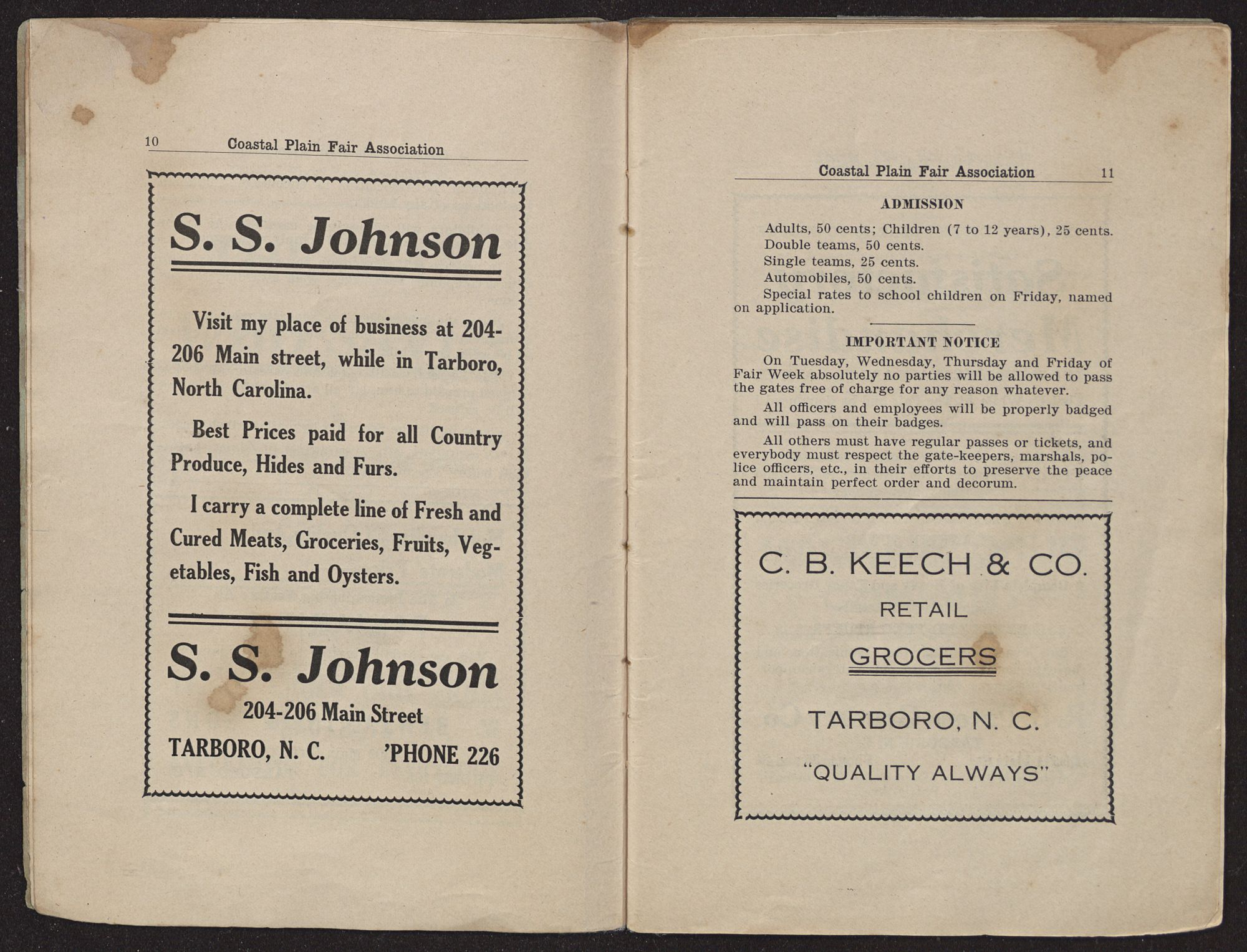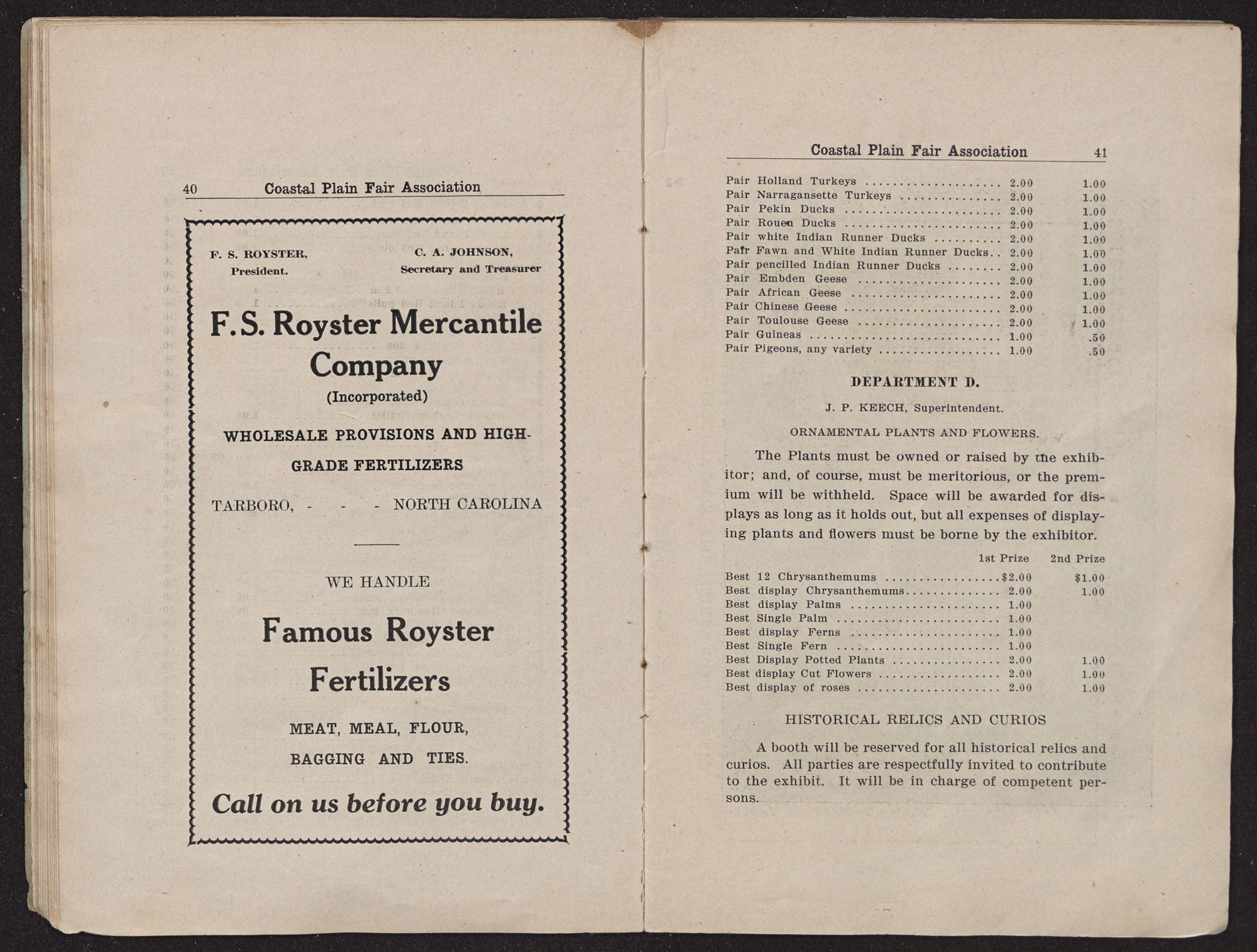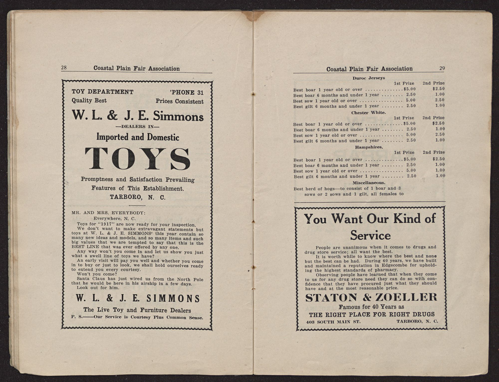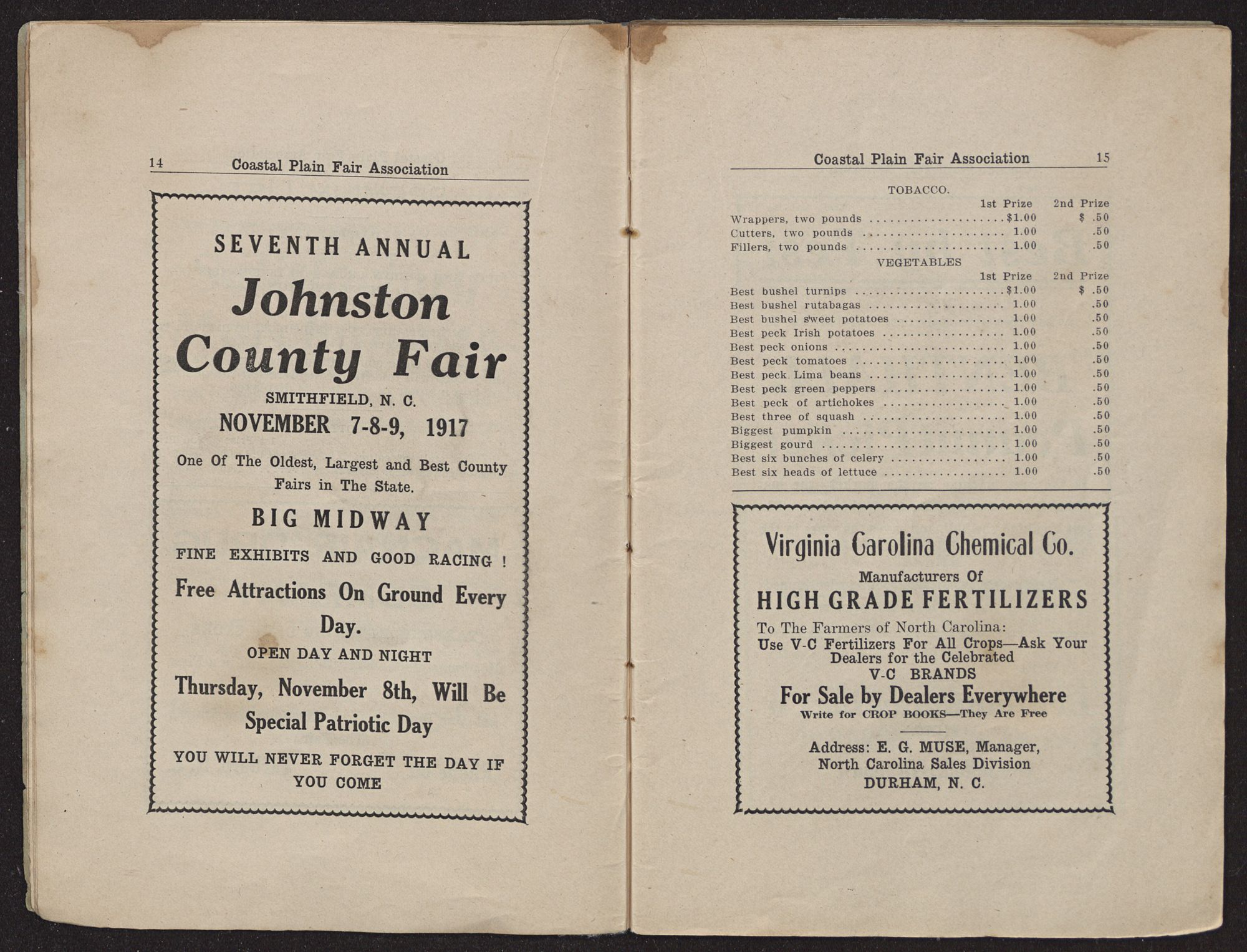 PREMIUM LISTCOASTAL PLAIN FAIR TARBORO, N. C. OCTOBER 30TH, 31ST. NOVEMBER 1ST, 2ND, 1917 OWEN G. DUNN, PRINTER.NEW BERN, N. C.Constantine's LADIES CAFE GENTLEMEN