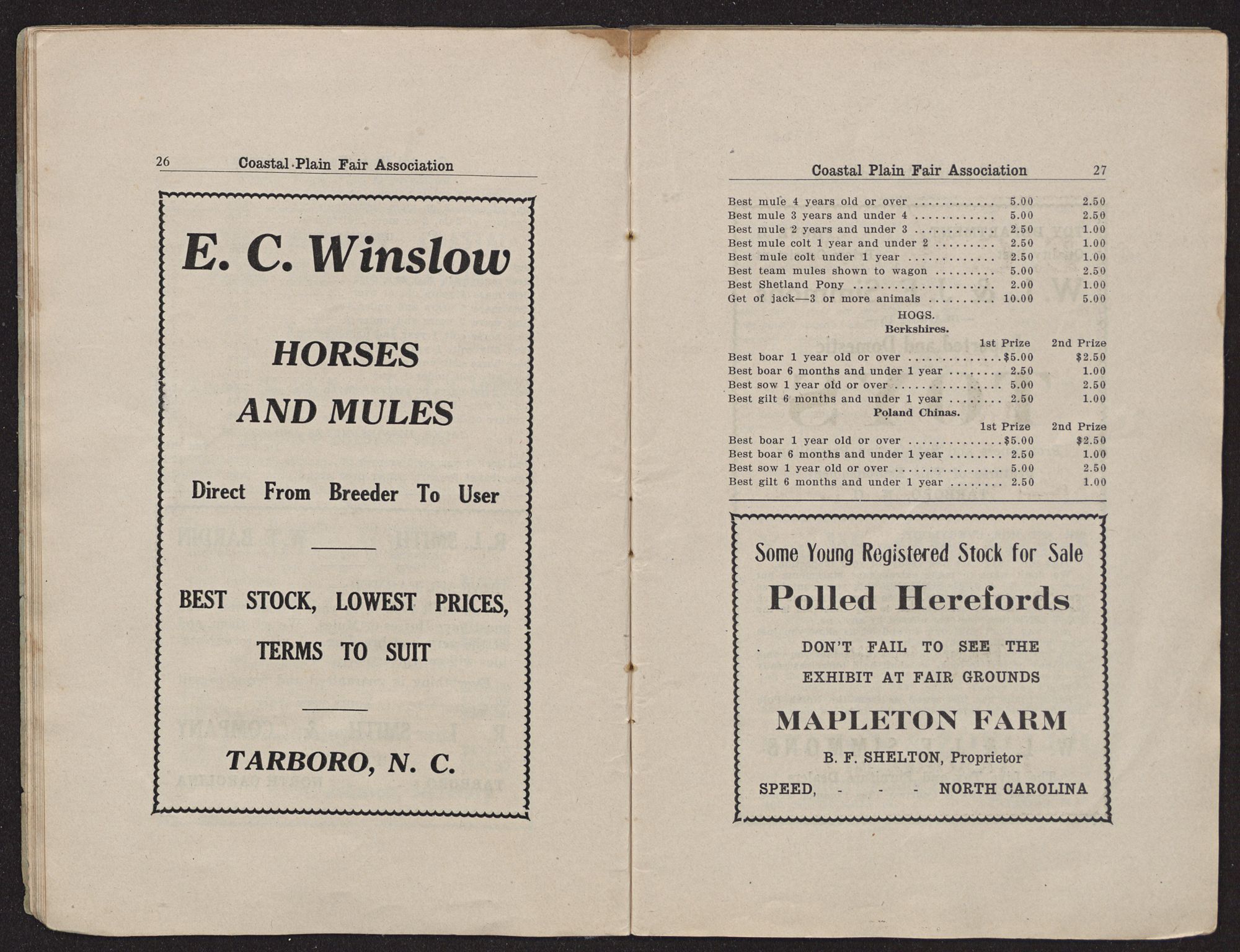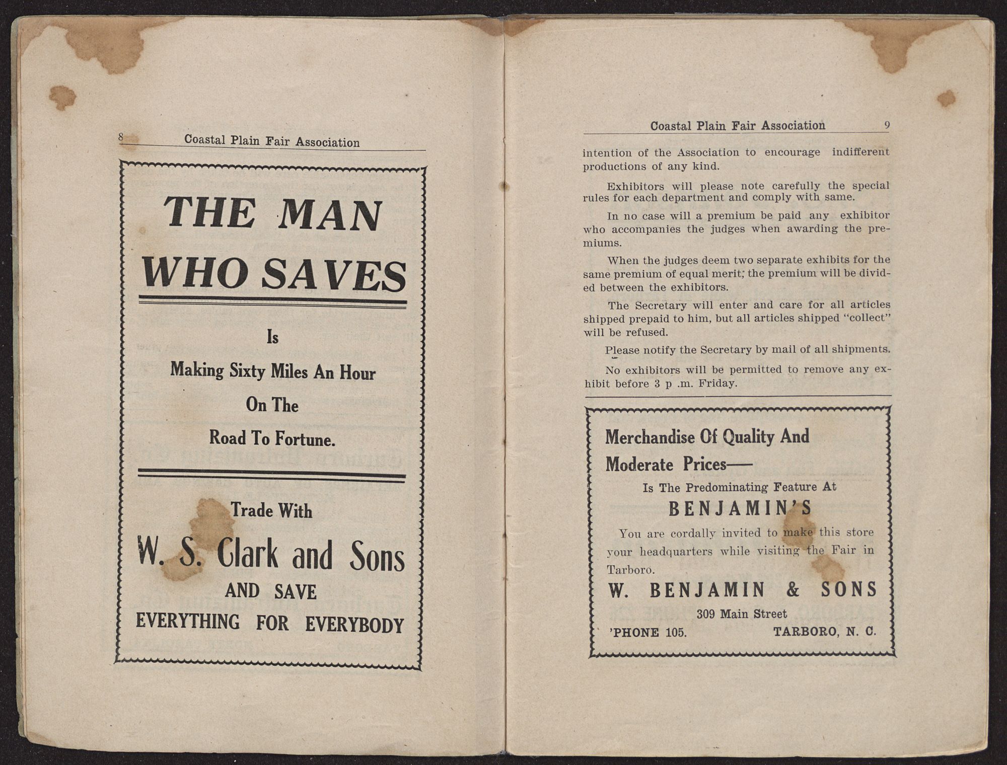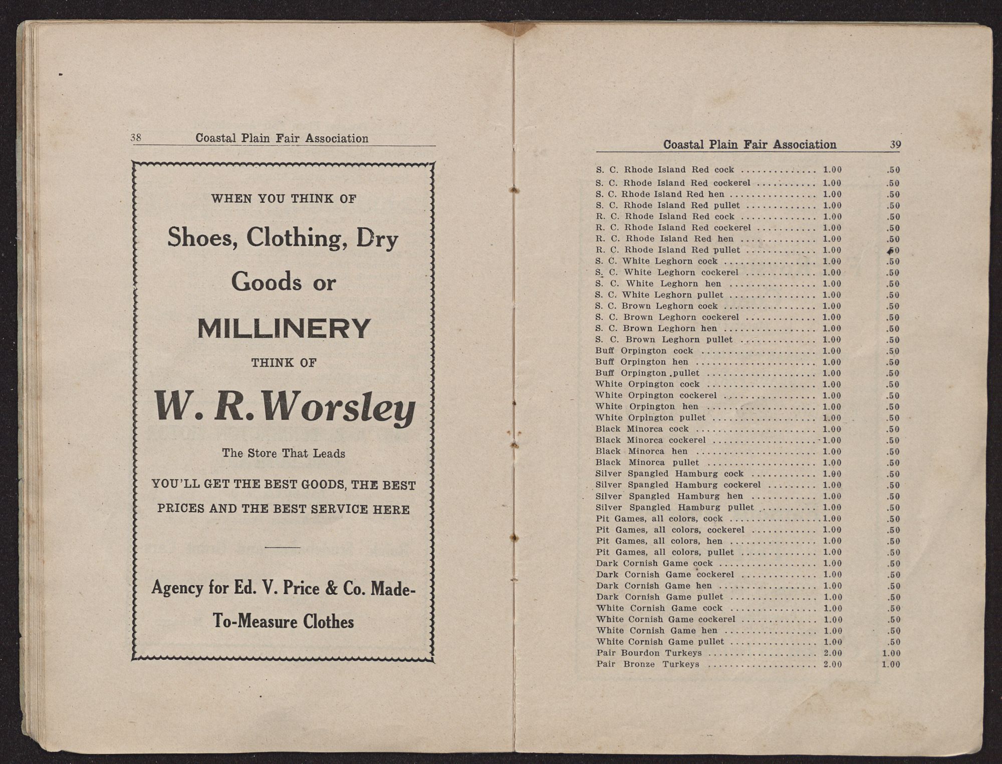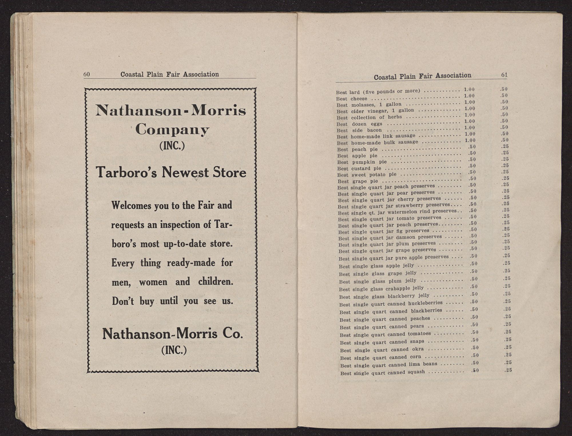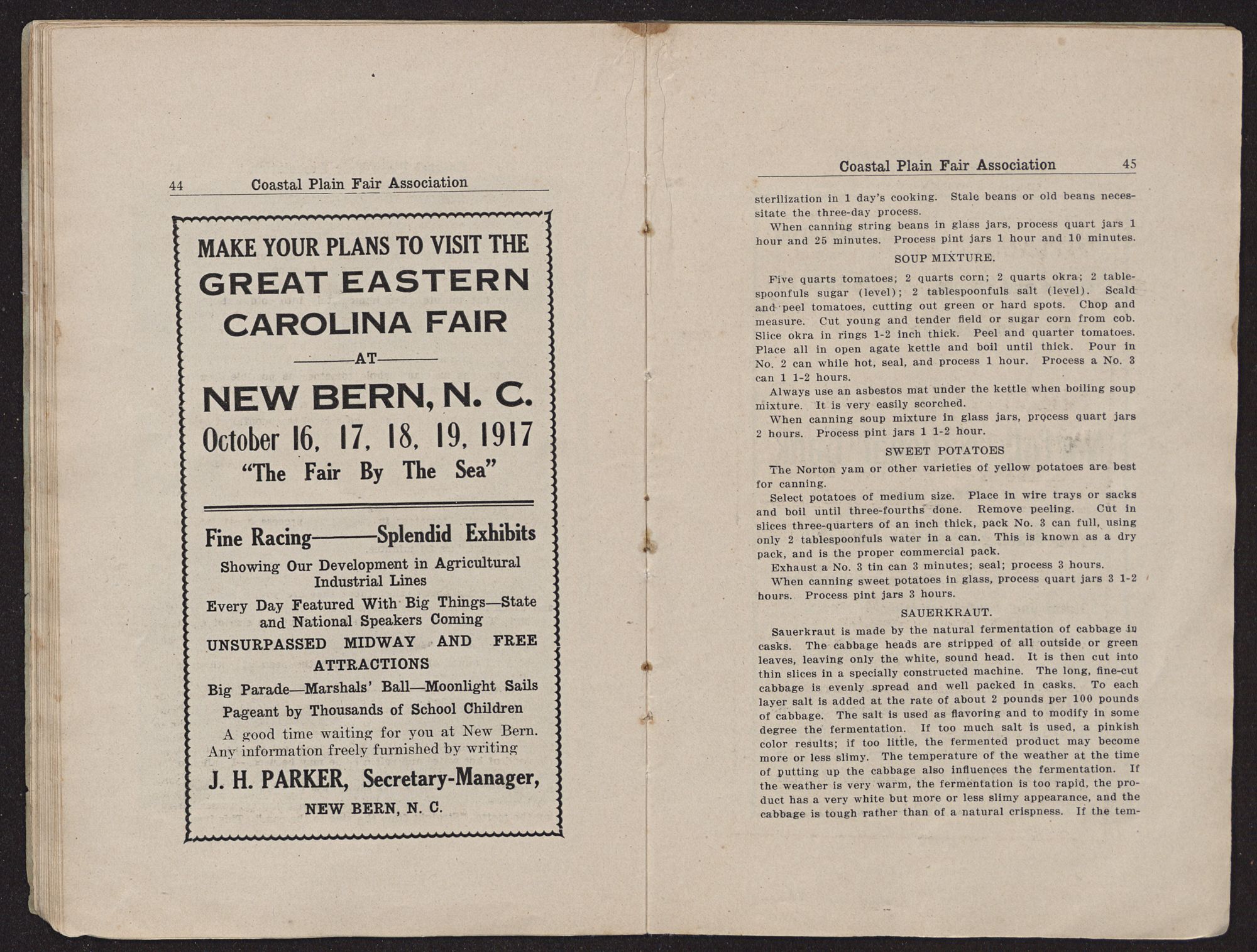 PREMIUM LISTCOASTAL PLAIN FAIR TARBORO, N. C. OCTOBER 30TH, 31ST. NOVEMBER 1ST, 2ND, 1917 OWEN G. DUNN, PRINTER.NEW BERN, N. C.Constantine's LADIES CAFE GENTLEMEN