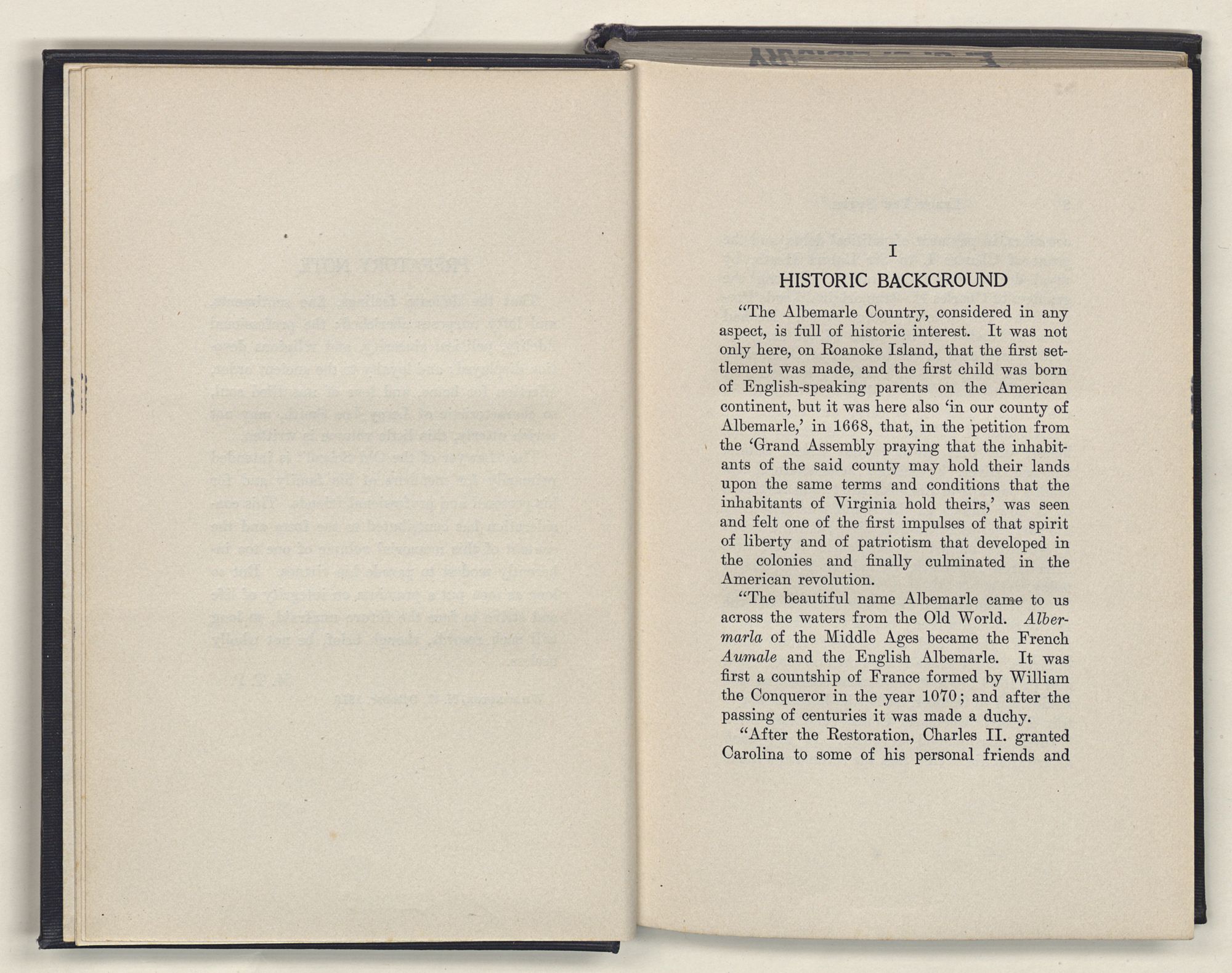 “The Albemarle Country, considered in any aspect, is full of historic interest. It was not only here, on Roanoke Island, that the first settlement was made, and the first child was born of English-speaking parents on the American continent, but it was here also ‘in our county of Albemarle,’ in 1668, that, in the petition from the ‘Grand Assembly praying that the inhabitants of the said county may hold their lands upon the same terms and conditions that the inhabitants of Virginia hold theirs,’ was seen and felt one of the first impulses of that spirit of liberty and of patriotism that developed in the colonies and finally culminated in the American revolution.