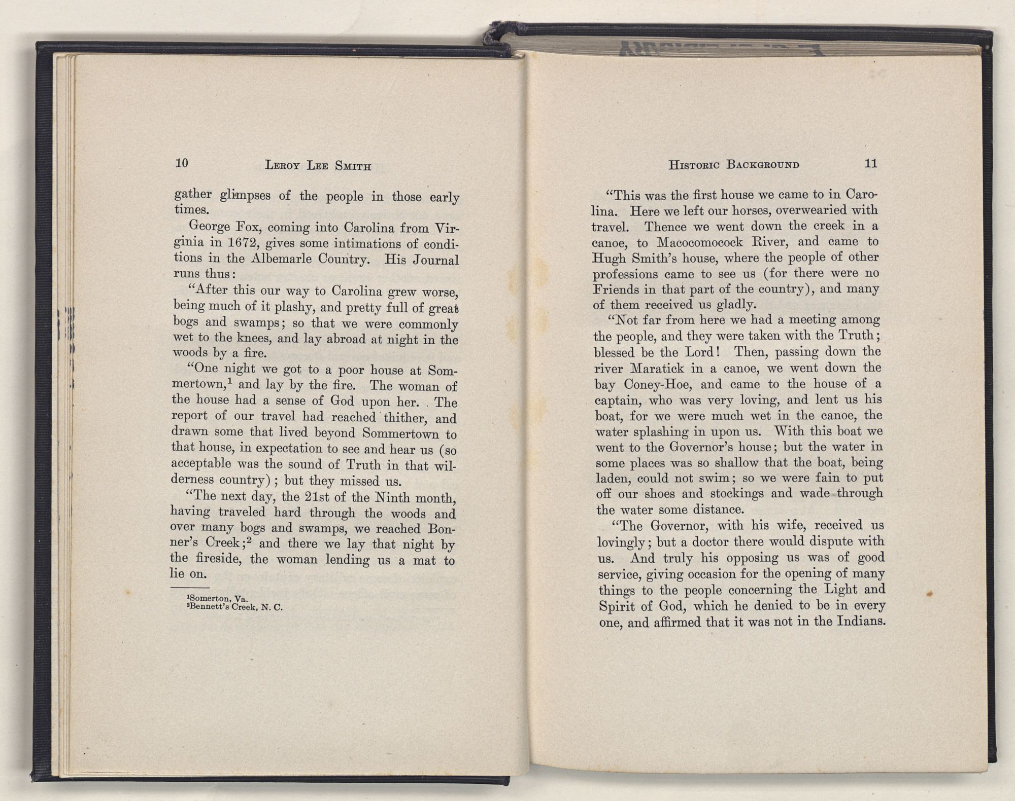1 Somerton, Va.2 Bennett's Creek, N. C.“This was the first house we came to in Carolina. Here we left our horses, overwearied with travel. Thence we went down the creek in a canoe, to Macocomocock River, and came to Hugh Smith's house, where the people of other professions came to see us (for there were no Friends in that part of the country), and many of them received us gladly.
