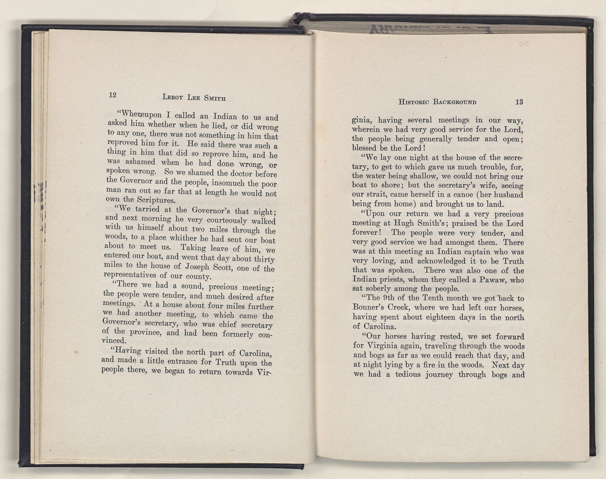 “Upon our return we had a very precious meeting at Hugh Smith's; praised be the Lord forever! The people were very tender, and very good service we had amongst them. There was at this meeting an Indian captain who was very loving, and acknowledged it to be Truth that was spoken. There was also one of the Indian priests, whom they called a Pawaw, who sat soberly among the people.