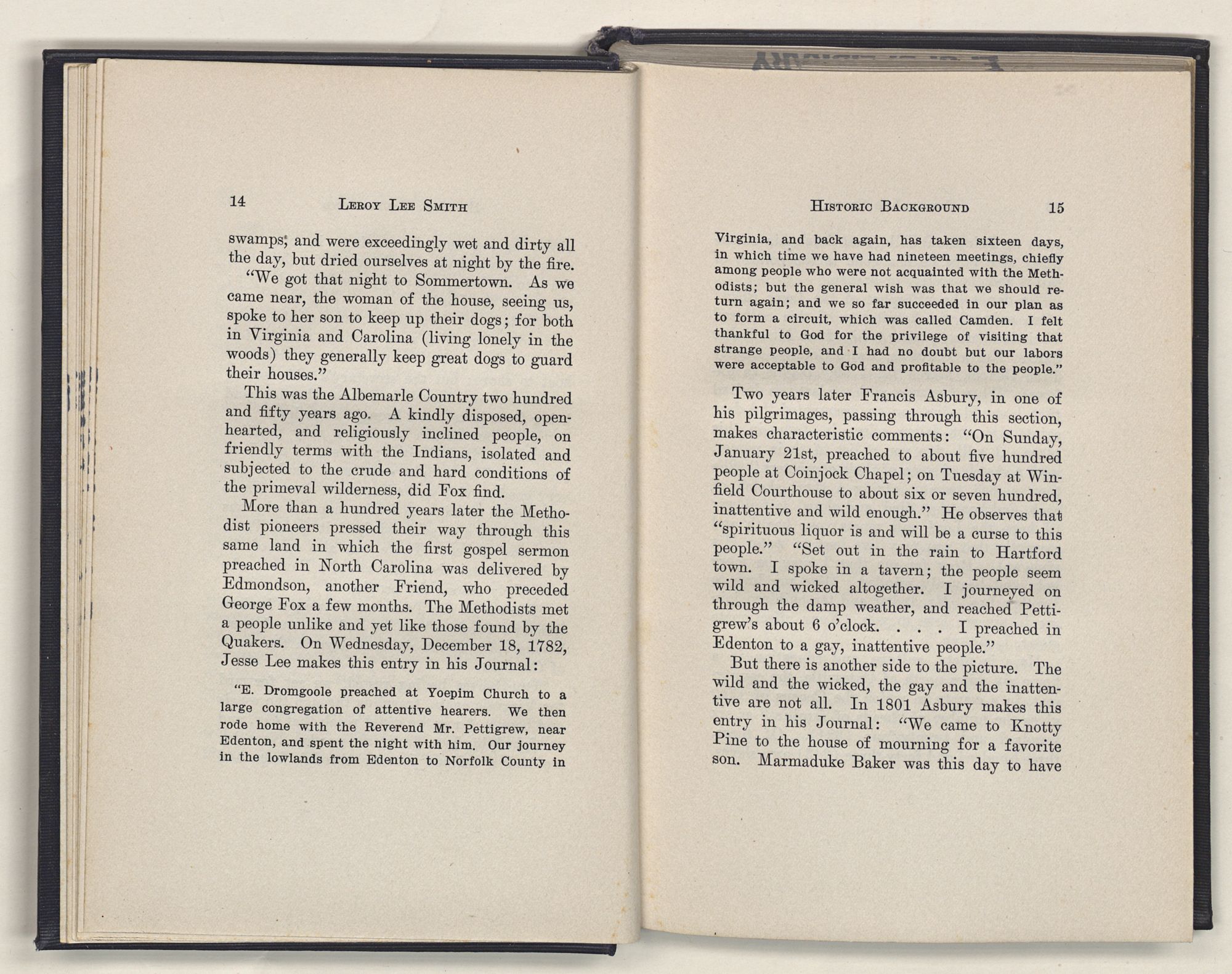More than a hundred years later the Methodist pioneers pressed their way through this same land in which the first gospel sermon preached in North Carolina was delivered by Edmondson, another Friend, who preceded George Fox a few months. The Methodists met a people unlike and yet like those found by the Quakers. On Wednesday, December 18, 1782, Jesse Lee makes this entry in his Journal: