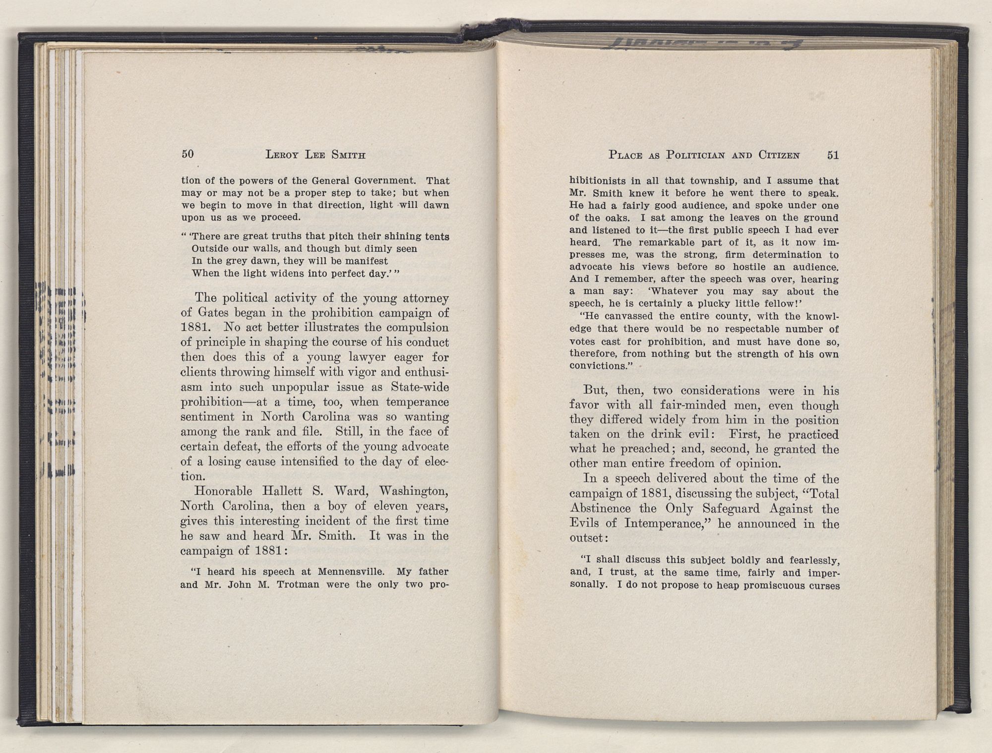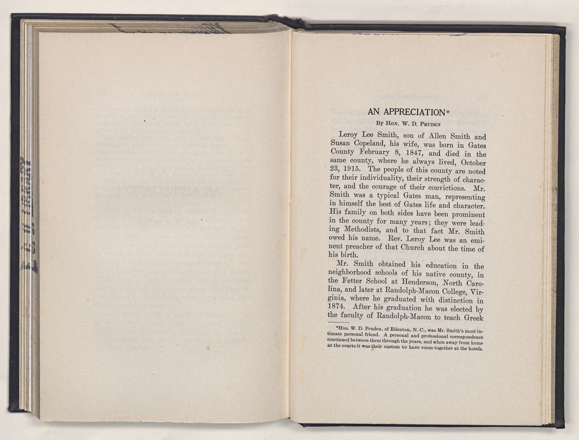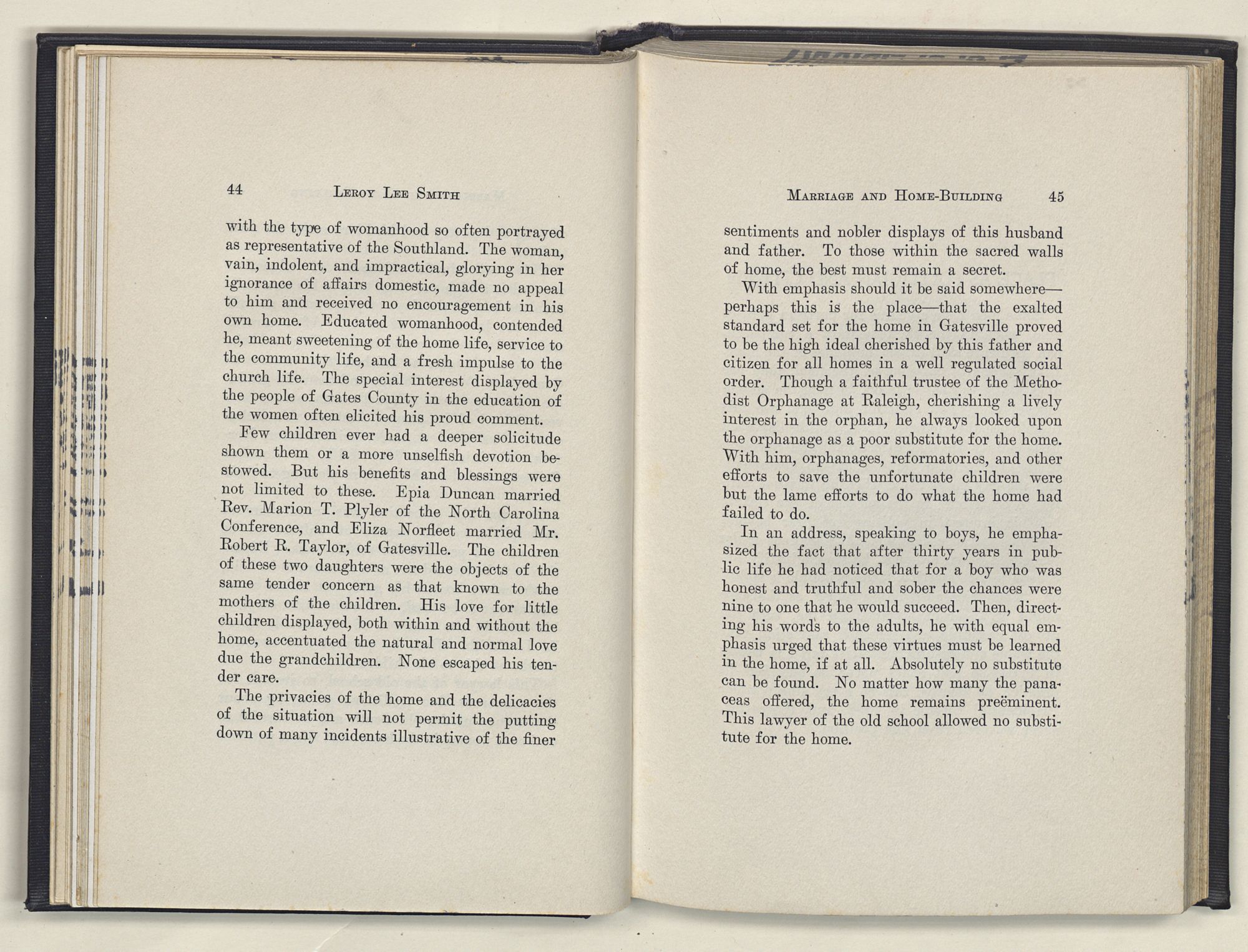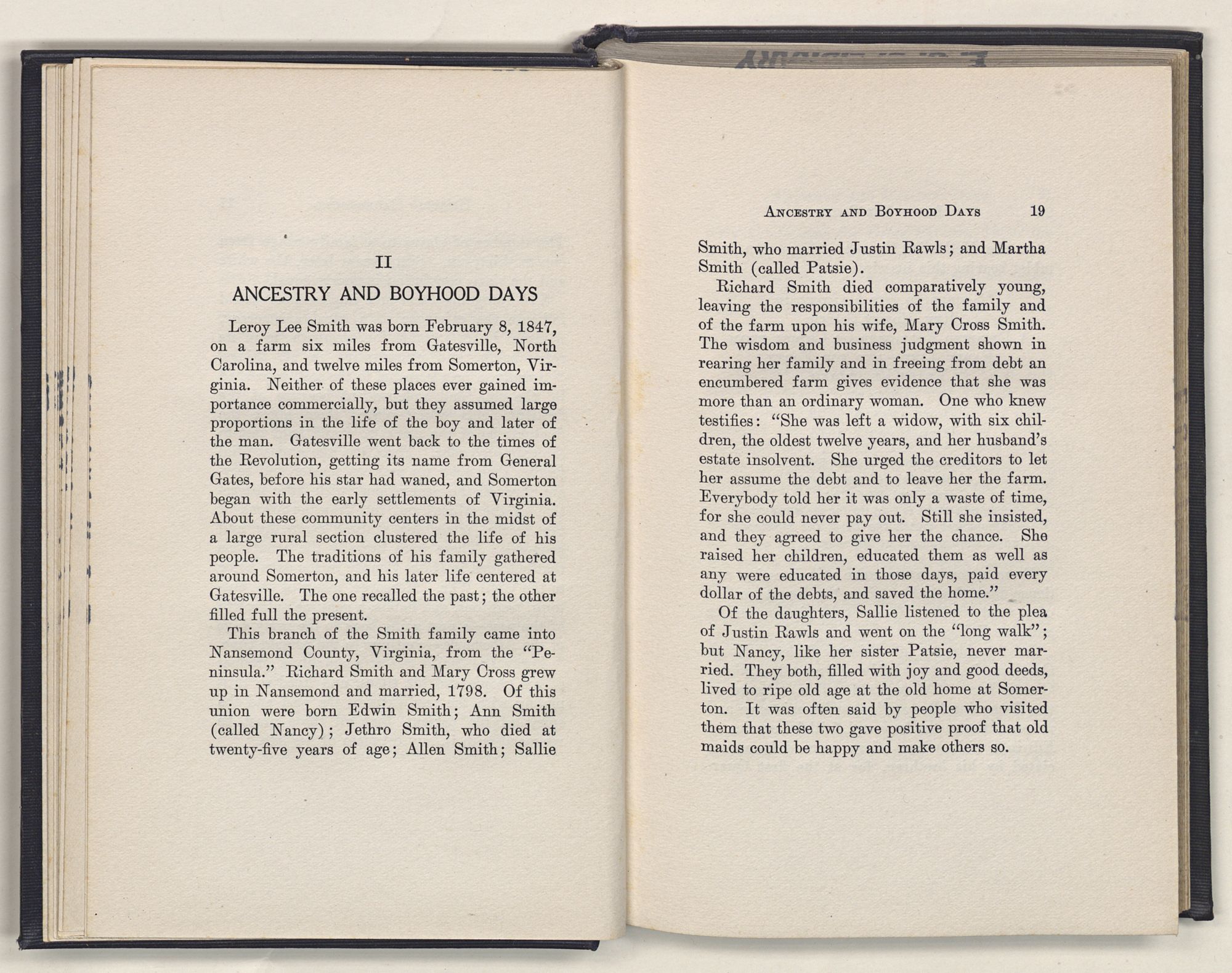 Leroy Lee Smith was born February 8, 1847, on a farm six miles from Gatesville, North Carolina, and twelve miles from Somerton, Virginia. Neither of these places ever gained importance commercially, but they assumed large proportions in the life of the boy and later of the man. Gatesville went back to the times of the Revolution, getting its name from General Gates, before his star had waned, and Somerton began with the early settlements of Virginia. About these community centers in the midst of a large rural section clustered the life of his people. The traditions of his family gathered around Somerton, and his later life centered at Gatesville. The one recalled the past; the other filled full the present.