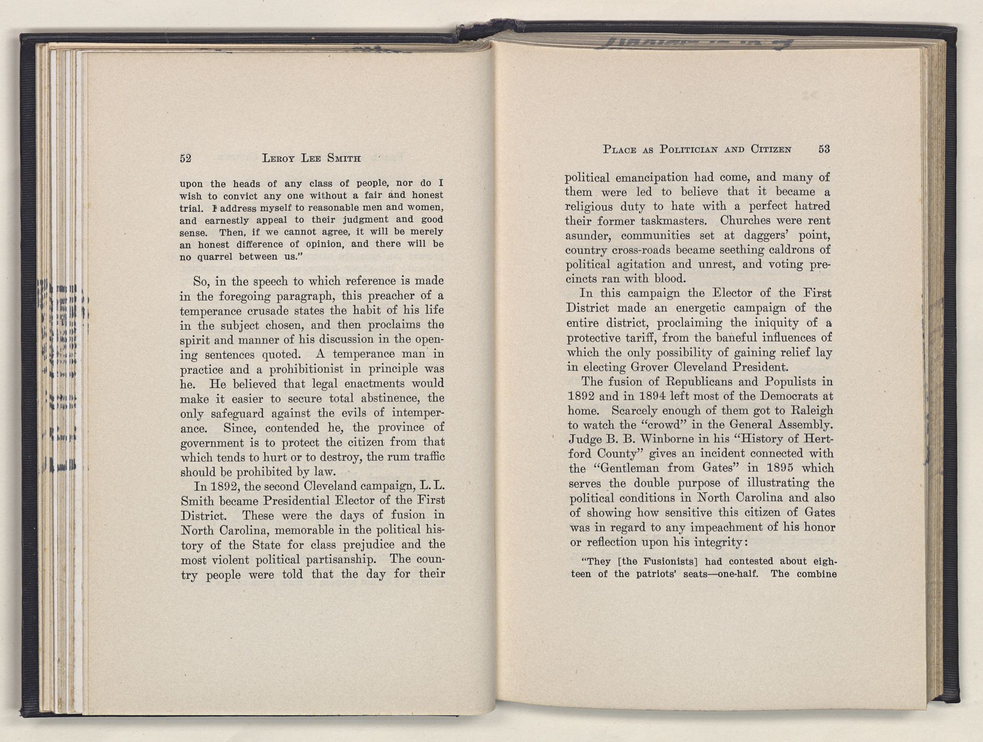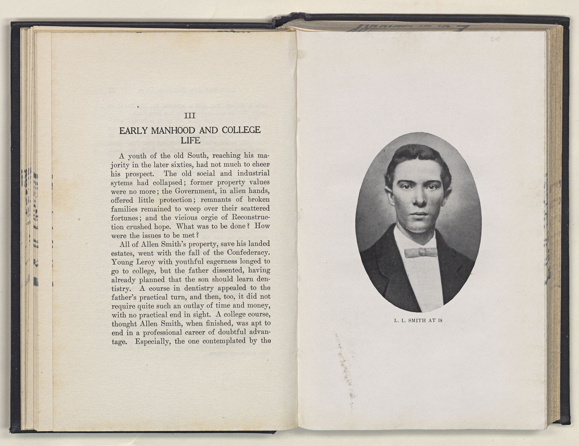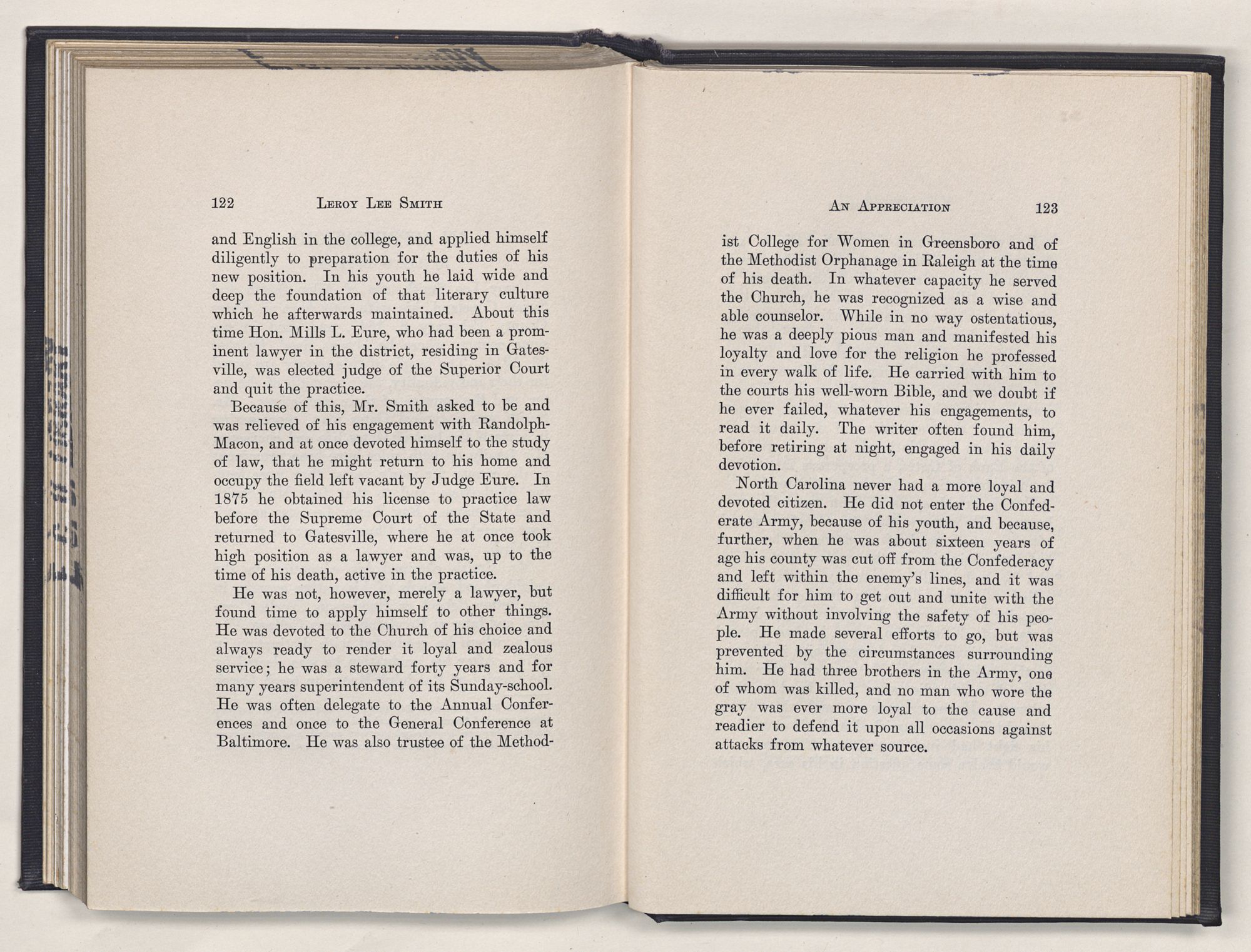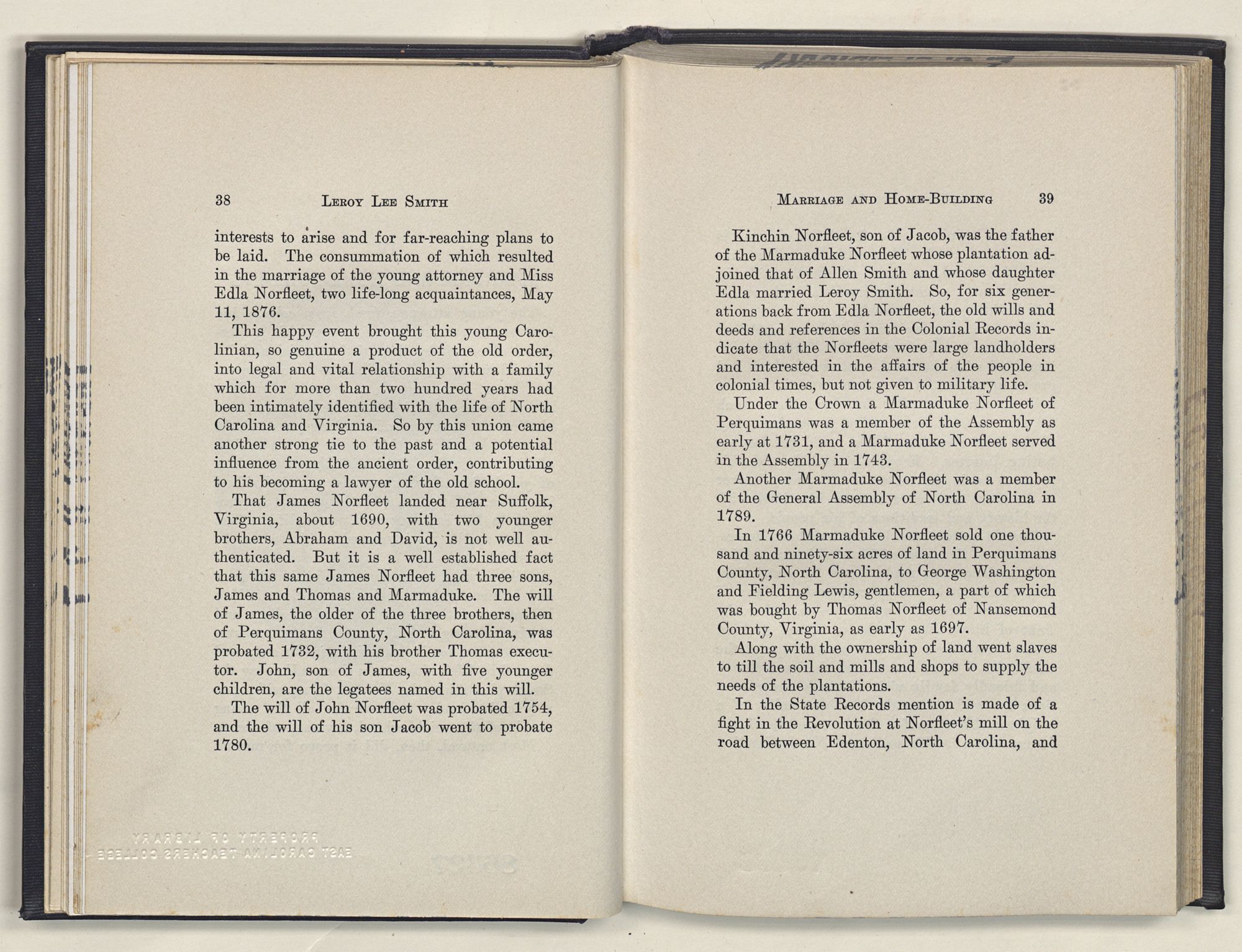 Leroy Lee Smith was born February 8, 1847, on a farm six miles from Gatesville, North Carolina, and twelve miles from Somerton, Virginia. Neither of these places ever gained importance commercially, but they assumed large proportions in the life of the boy and later of the man. Gatesville went back to the times of the Revolution, getting its name from General Gates, before his star had waned, and Somerton began with the early settlements of Virginia. About these community centers in the midst of a large rural section clustered the life of his people. The traditions of his family gathered around Somerton, and his later life centered at Gatesville. The one recalled the past; the other filled full the present.