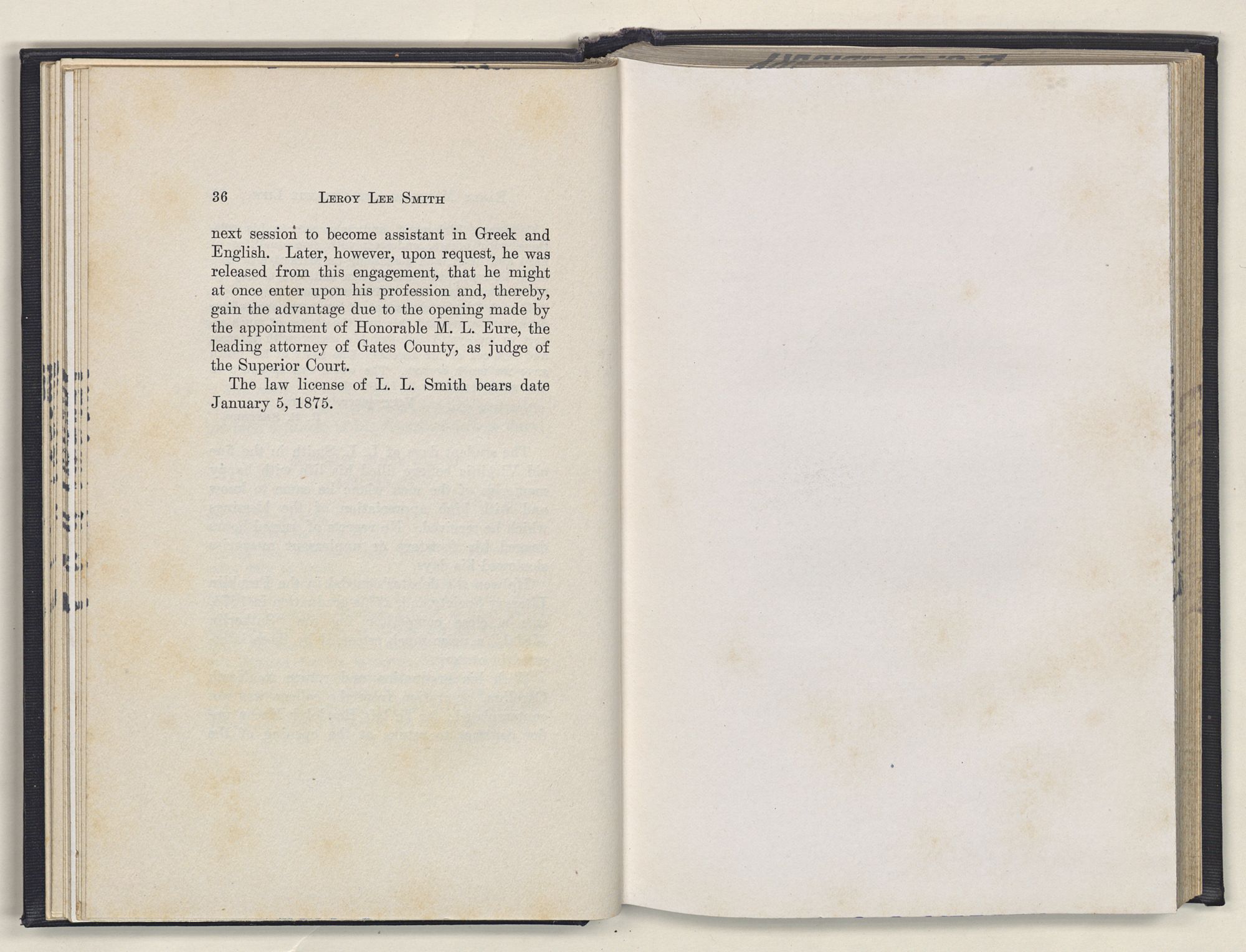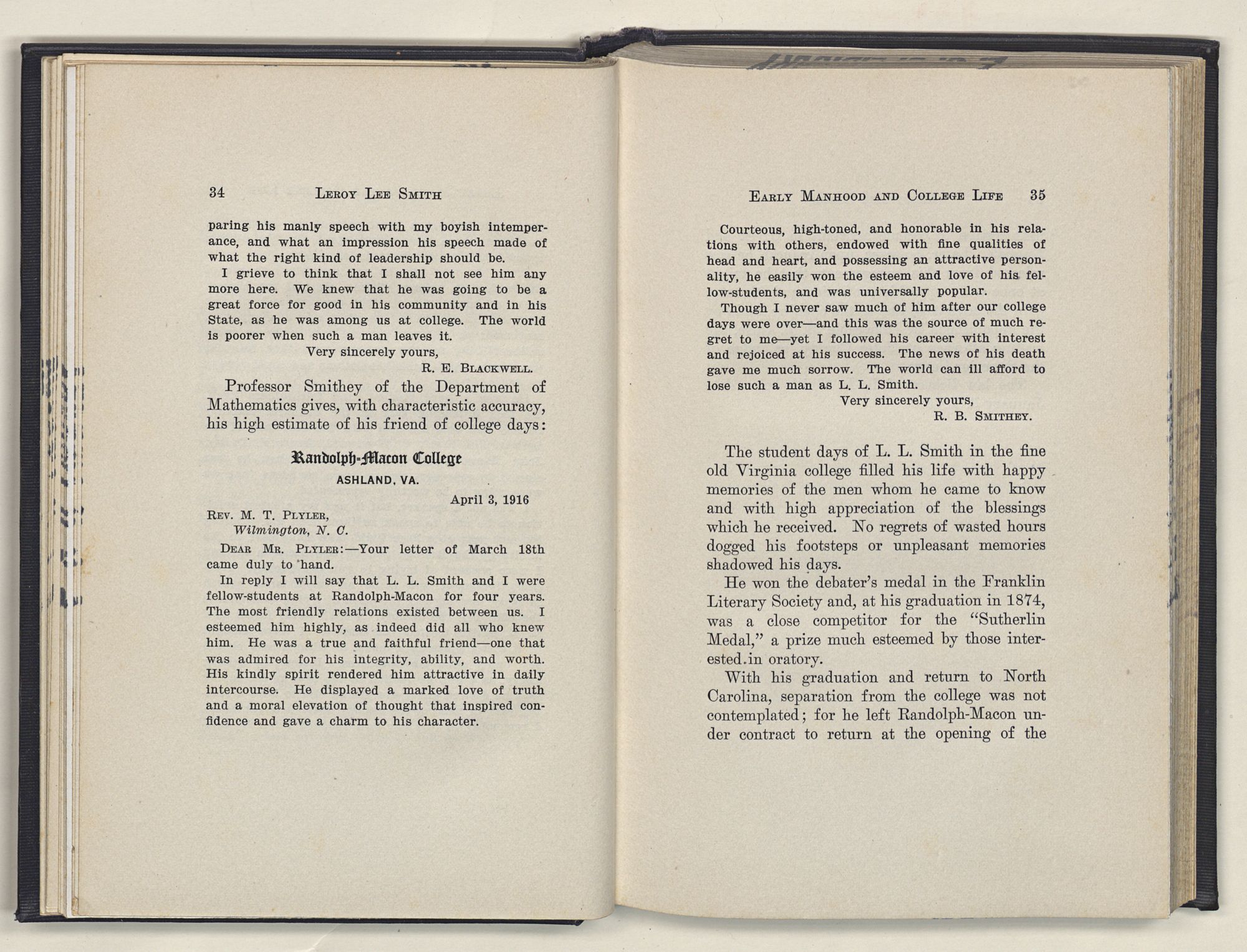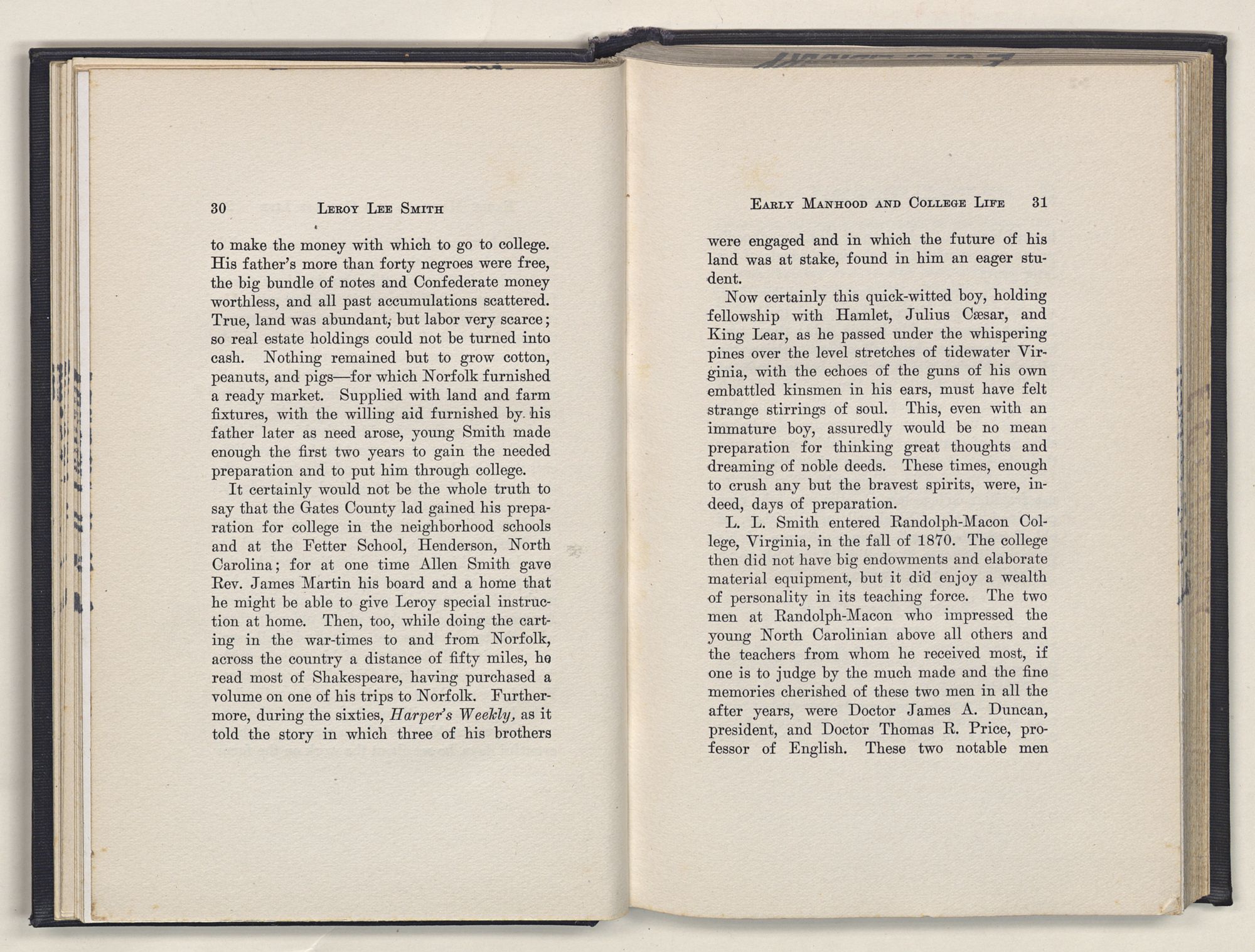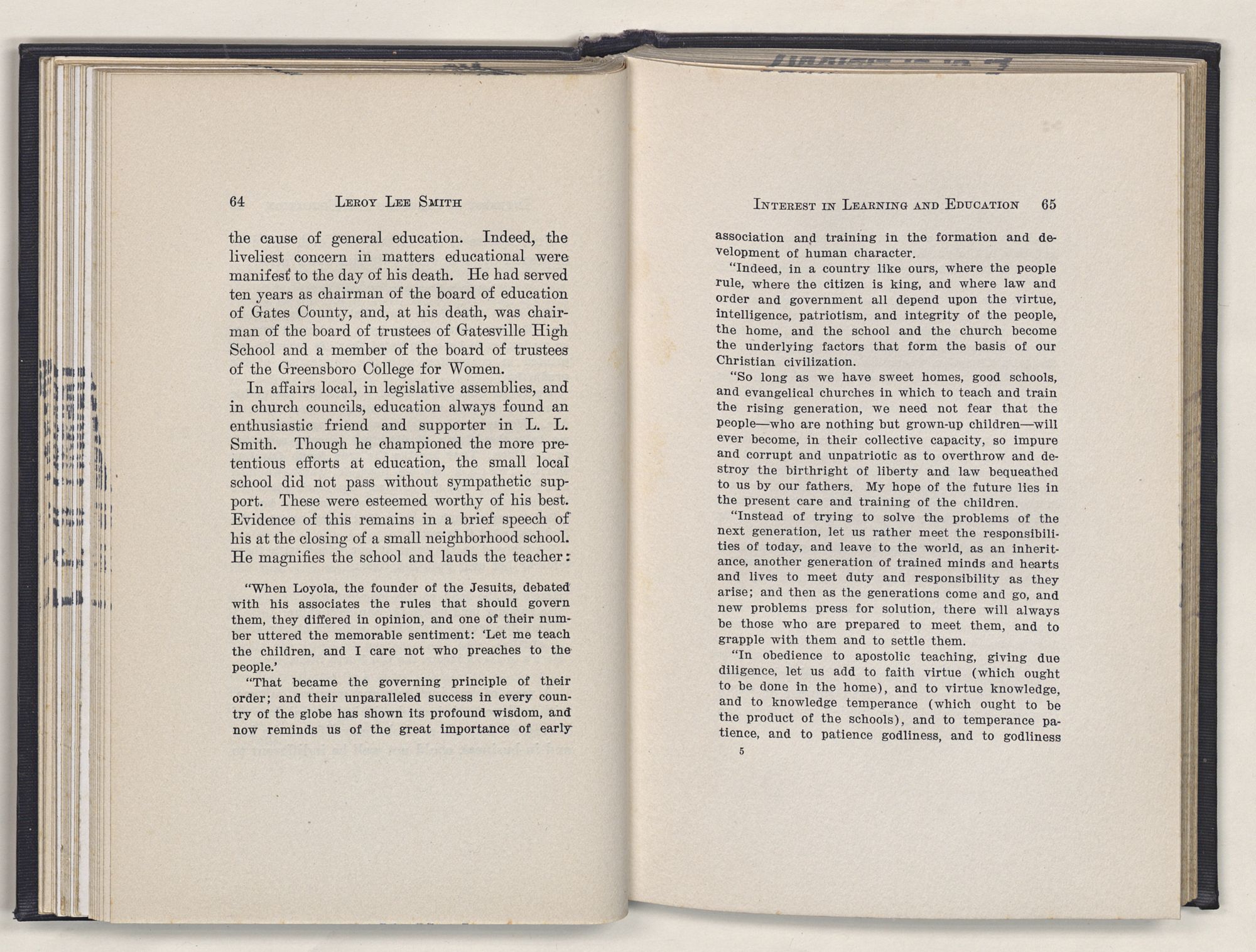 Leroy Lee Smith was born February 8, 1847, on a farm six miles from Gatesville, North Carolina, and twelve miles from Somerton, Virginia. Neither of these places ever gained importance commercially, but they assumed large proportions in the life of the boy and later of the man. Gatesville went back to the times of the Revolution, getting its name from General Gates, before his star had waned, and Somerton began with the early settlements of Virginia. About these community centers in the midst of a large rural section clustered the life of his people. The traditions of his family gathered around Somerton, and his later life centered at Gatesville. The one recalled the past; the other filled full the present.