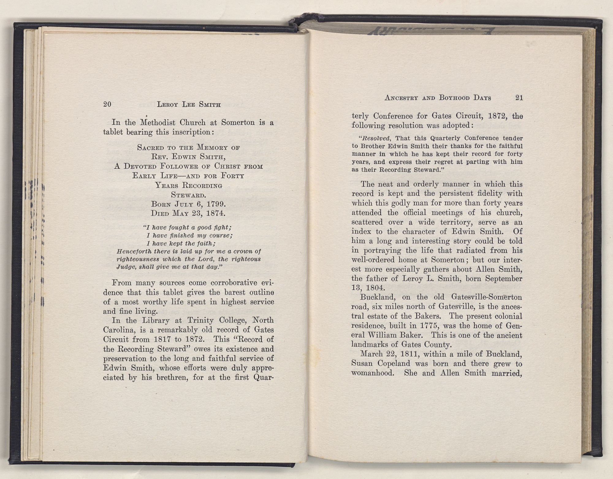 In the Library at Trinity College, North Carolina, is a remarkably old record of Gates Circuit from 1817 to 1872. This “Record of the Recording Steward” owes its existence and preservation to the long and faithful service of Edwin Smith, whose efforts were duly appreciated by his brethren, for at the first Quarterly