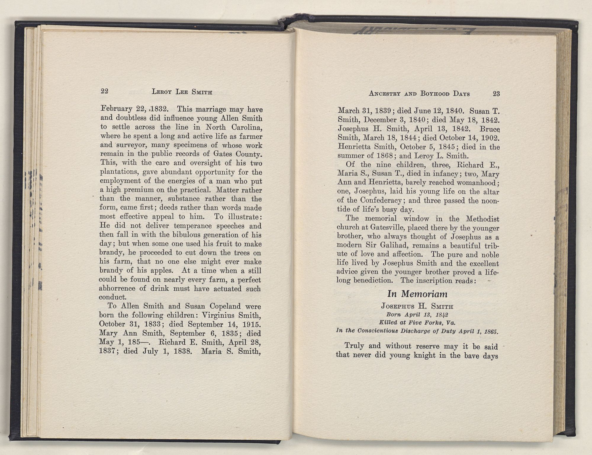 March 31, 1839; died June 12, 1840. Susan T. Smith, December 3, 1840; died May 18, 1842. Josephus H. Smith, April 13, 1842. Bruce Smith, March 18, 1844; died October 14, 1902. Henrietta Smith, October 5, 1845; died in the summer of 1868; and Leroy L. Smith.