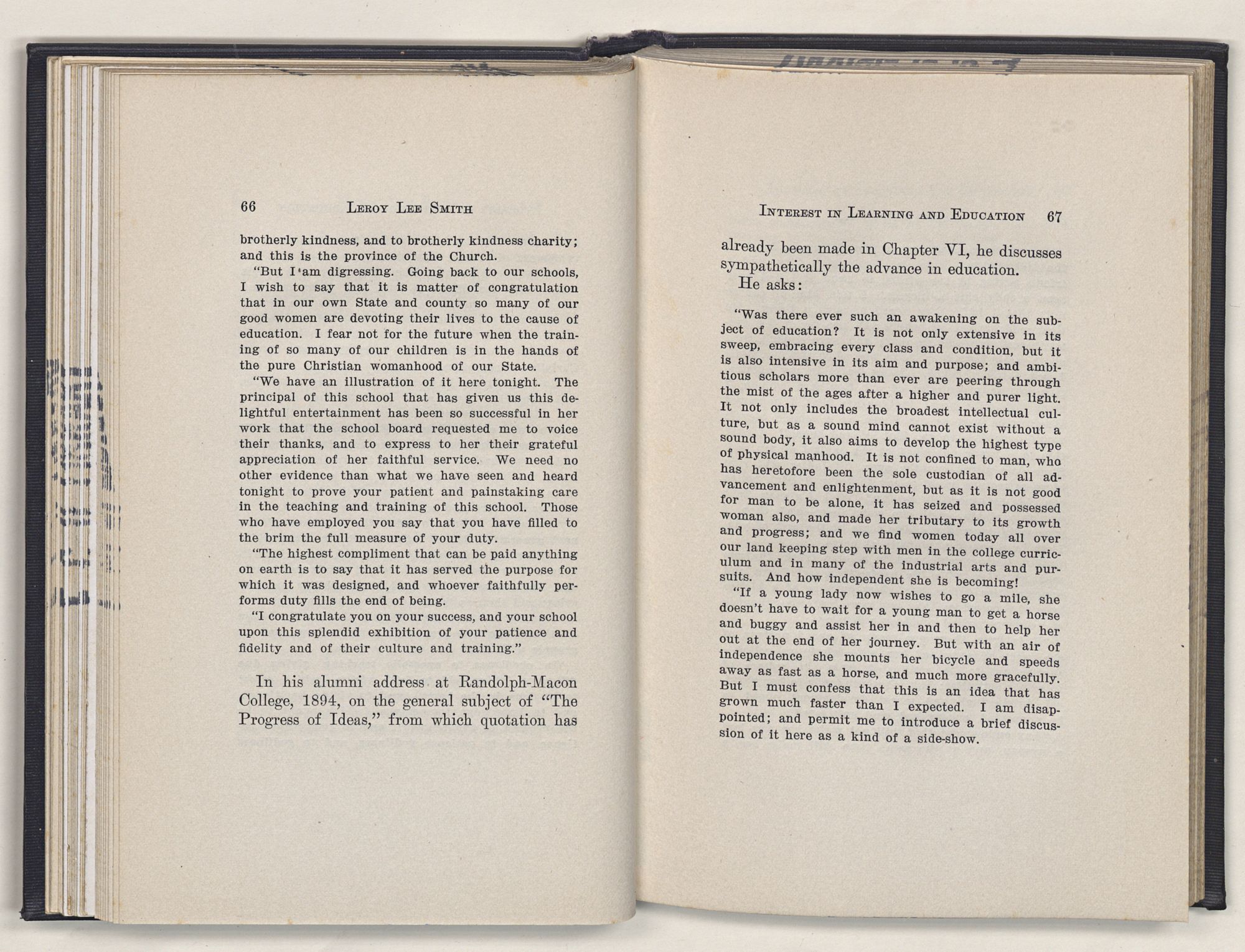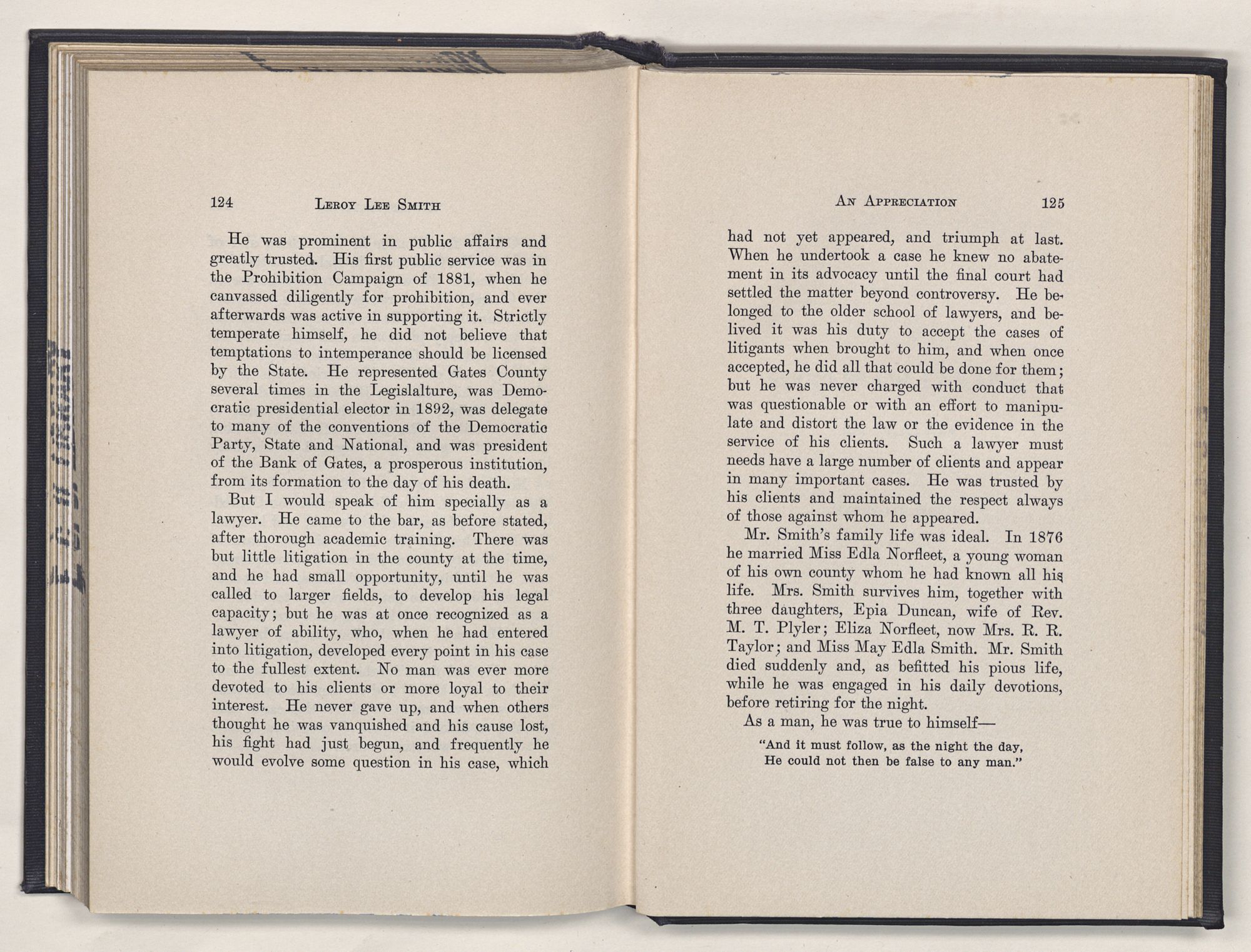That the delicate feelings, fine sentiments, and lofty purposes cherished; the professional fidelity, political sincerity, and religious devotion displayed; and loyalty to the ancient order, affection for home, and love of unsullied soul, so characteristic of Leroy Lee Smith, may not perish utterly, this little volume is written.