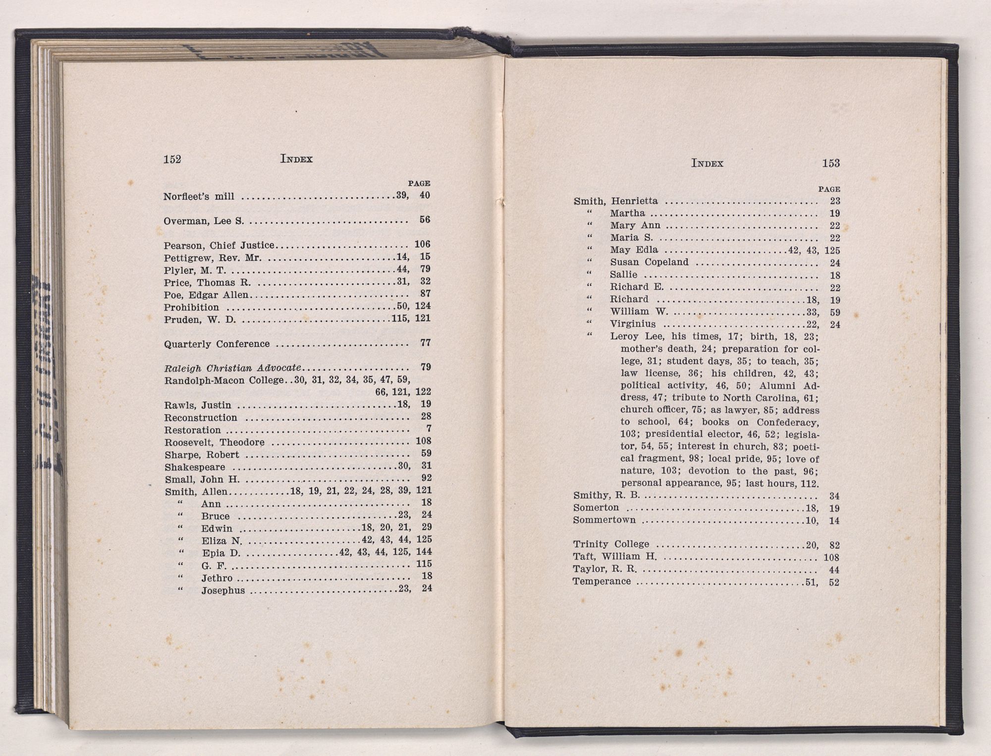 | Smith, Leroy Lee, his times, 17; birth, 18, 23; mother's death, 24; preparation for college, 31; student days, 35; to teach, 35; law license, 36; his children, 42, 43; political activity, 46, 50; Alumni Address, 47; tribute to North Carolina, 61; church officer, 75; as lawyer, 85; address to school, 64; books on Confederacy, 103; presidential elector, 46, 52; legislator, 54, 55; interest in church, 83; poetical fragment, 98; local pride, 95; love of nature, 103; devotion to the past, 96; personal appearance, 95; last hours, 112. | |