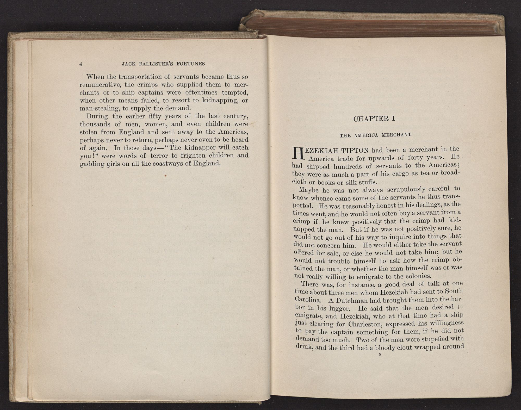 CHAPTER I THE AMERICA MERCHANTHEZEKIAH TIPTON had been a merchant in the America trade for upwards of forty years. He had shipped hundreds of servants to the Americas; they were as much a part of his cargo as tea or broad-cloth or books or silk stuffs.