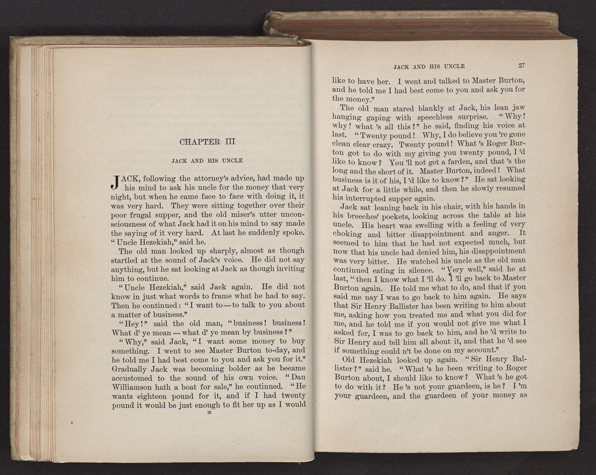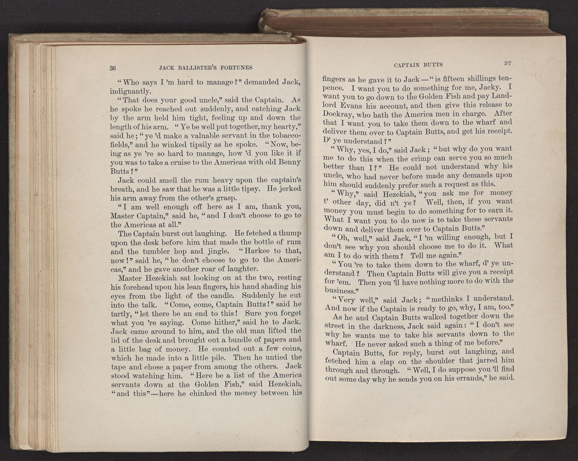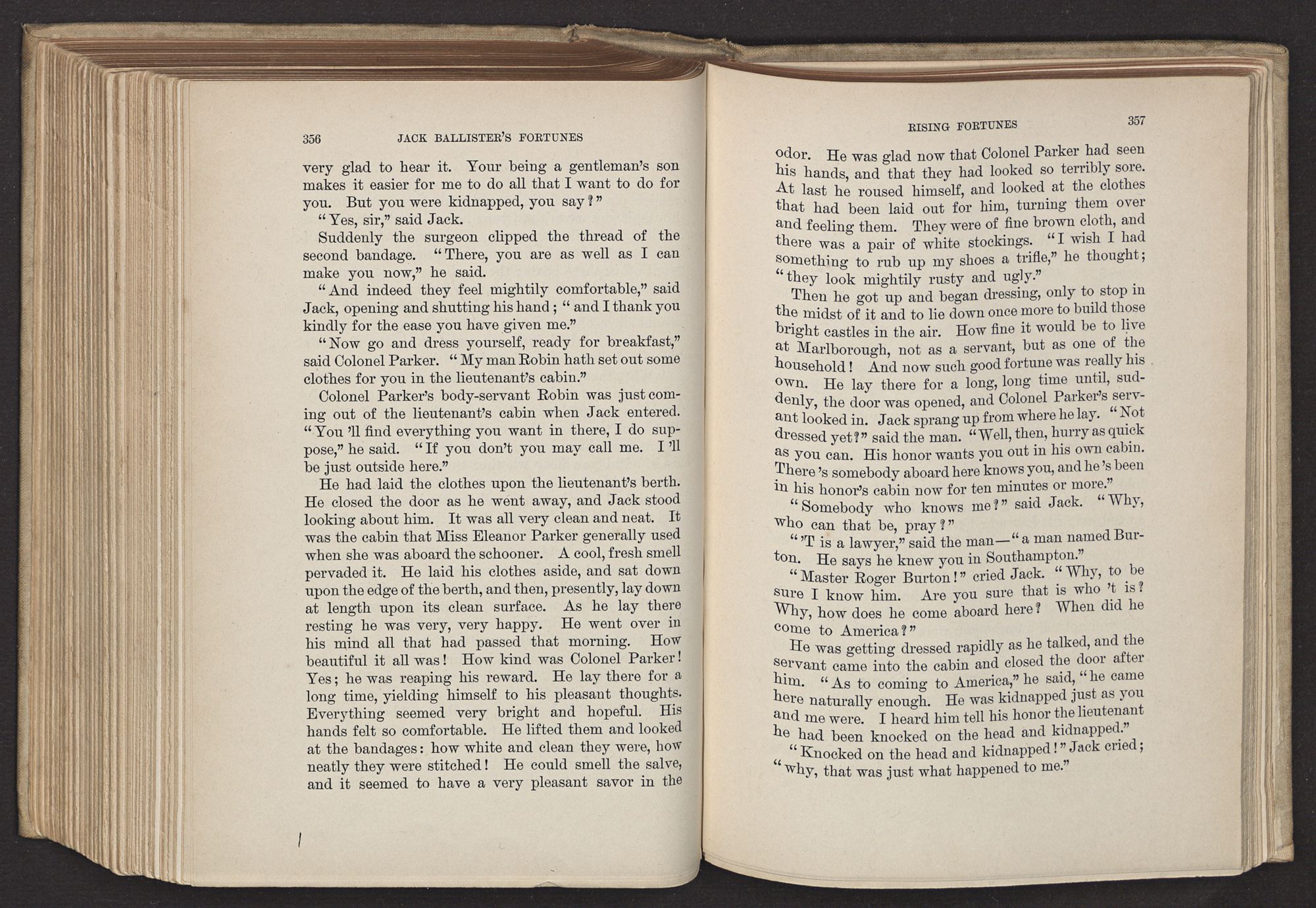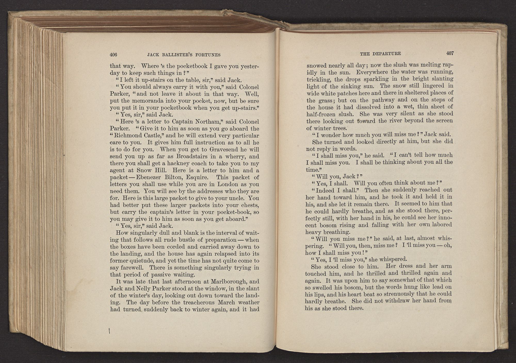 “Here's a letter to Captain Northam,” said Colonel Parker. “Give it to him as soon as you go aboard the “Richmond Castle,” and he will extend very particular care to you. It gives him full instruction as to all he is to do for you. When you get to Gravesend he will send you up as far as Broadstairs in a wherry, and there you shall get a hackney coach to take you to my agent at Snow Hill. Here is a letter to him and a packet — Ebenezer Bilton, Esquire. This packet of letters you shall use while you are in London as you need them. You will see by the addresses who they are for. Here is this large packet to give to your uncle. You had better put these larger packets into your chests, but carry the captain's letter in your pocket-book, so you may give it to him as soon as you get aboard.”