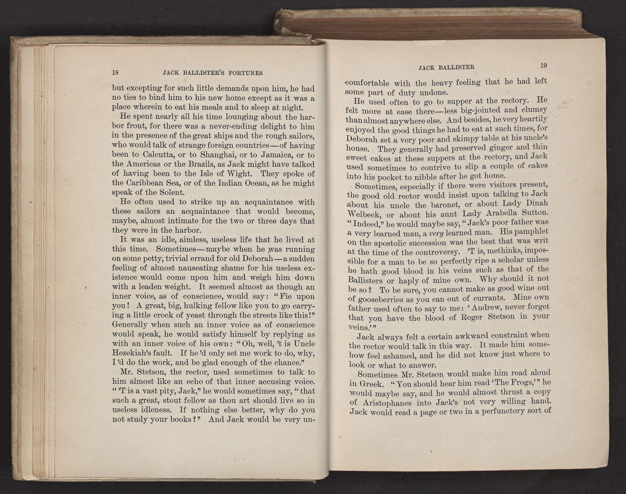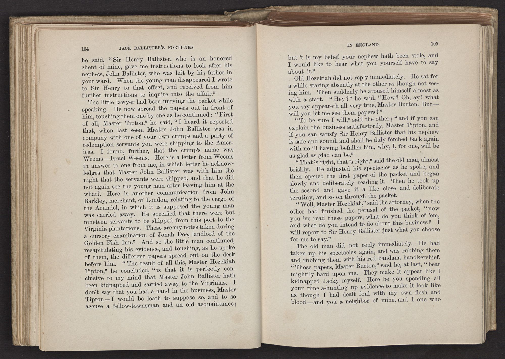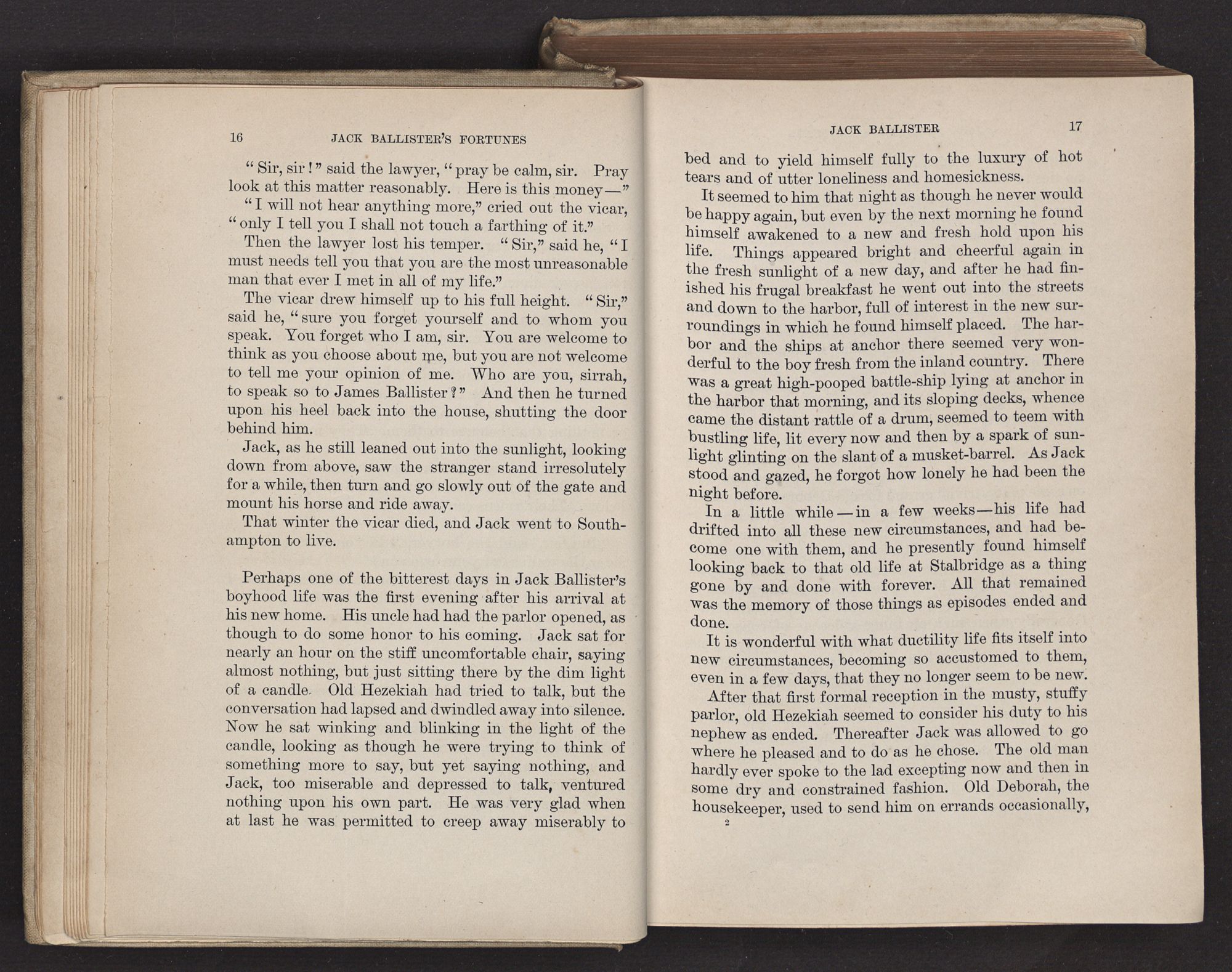 “Here's a letter to Captain Northam,” said Colonel Parker. “Give it to him as soon as you go aboard the “Richmond Castle,” and he will extend very particular care to you. It gives him full instruction as to all he is to do for you. When you get to Gravesend he will send you up as far as Broadstairs in a wherry, and there you shall get a hackney coach to take you to my agent at Snow Hill. Here is a letter to him and a packet — Ebenezer Bilton, Esquire. This packet of letters you shall use while you are in London as you need them. You will see by the addresses who they are for. Here is this large packet to give to your uncle. You had better put these larger packets into your chests, but carry the captain's letter in your pocket-book, so you may give it to him as soon as you get aboard.”