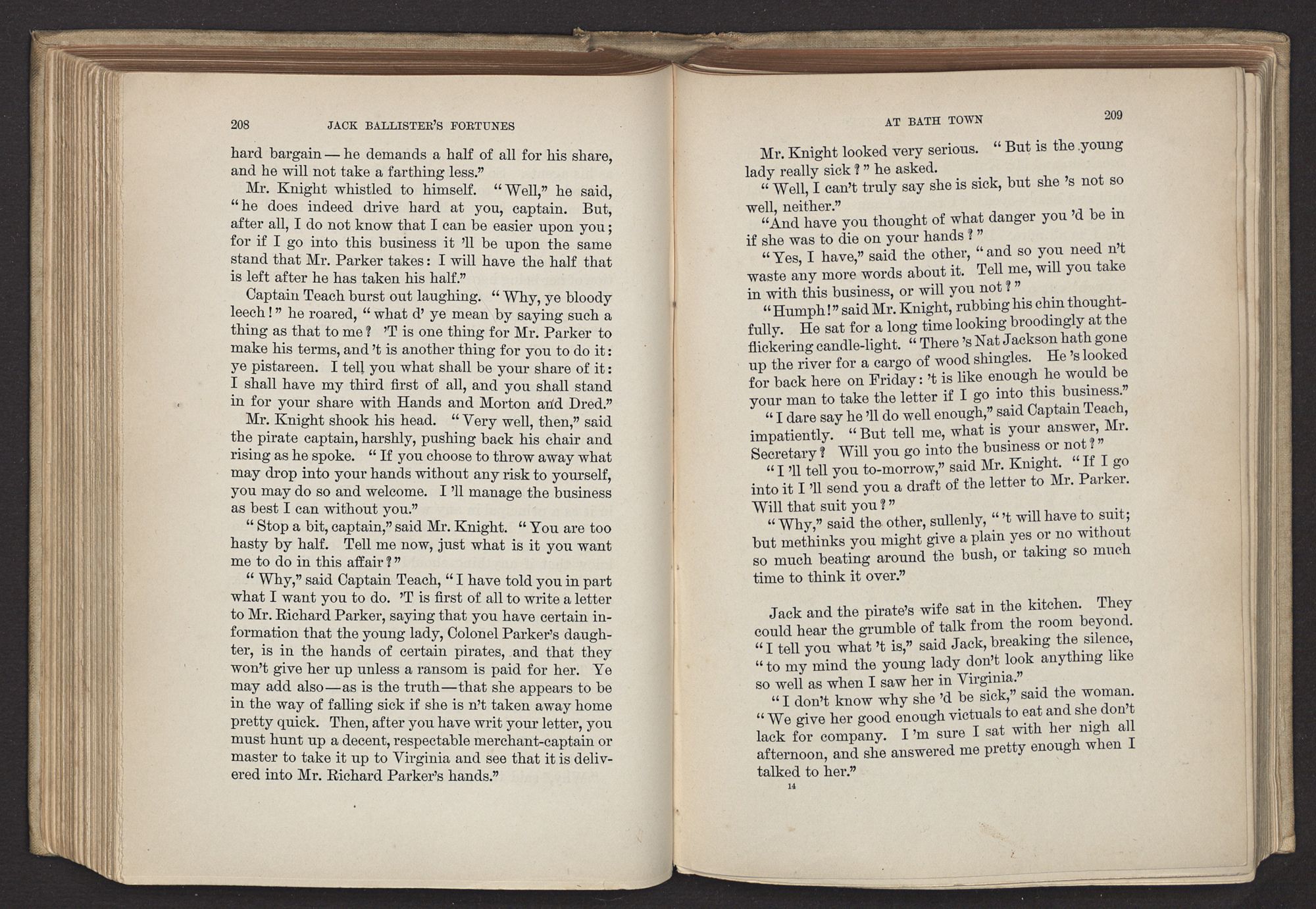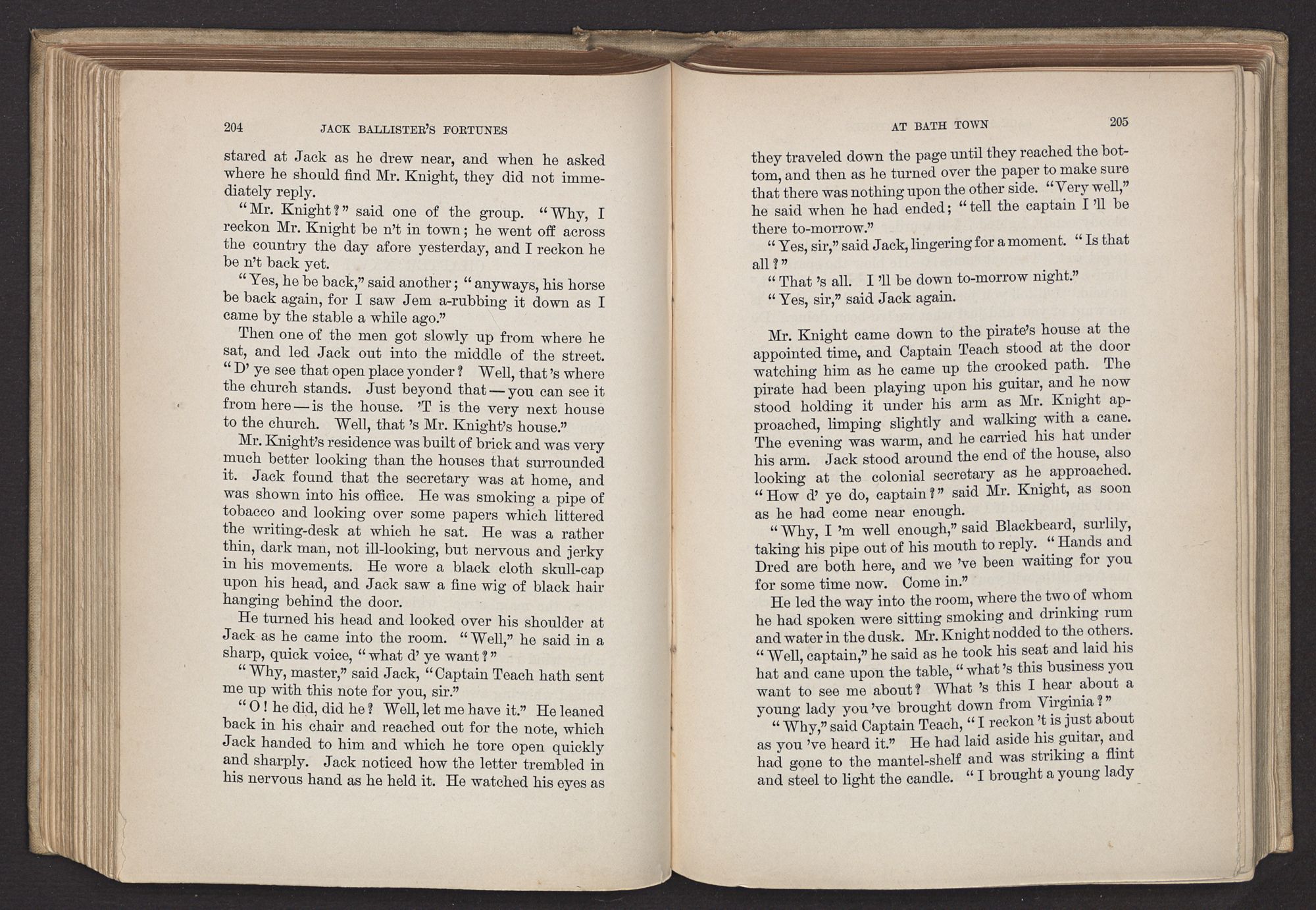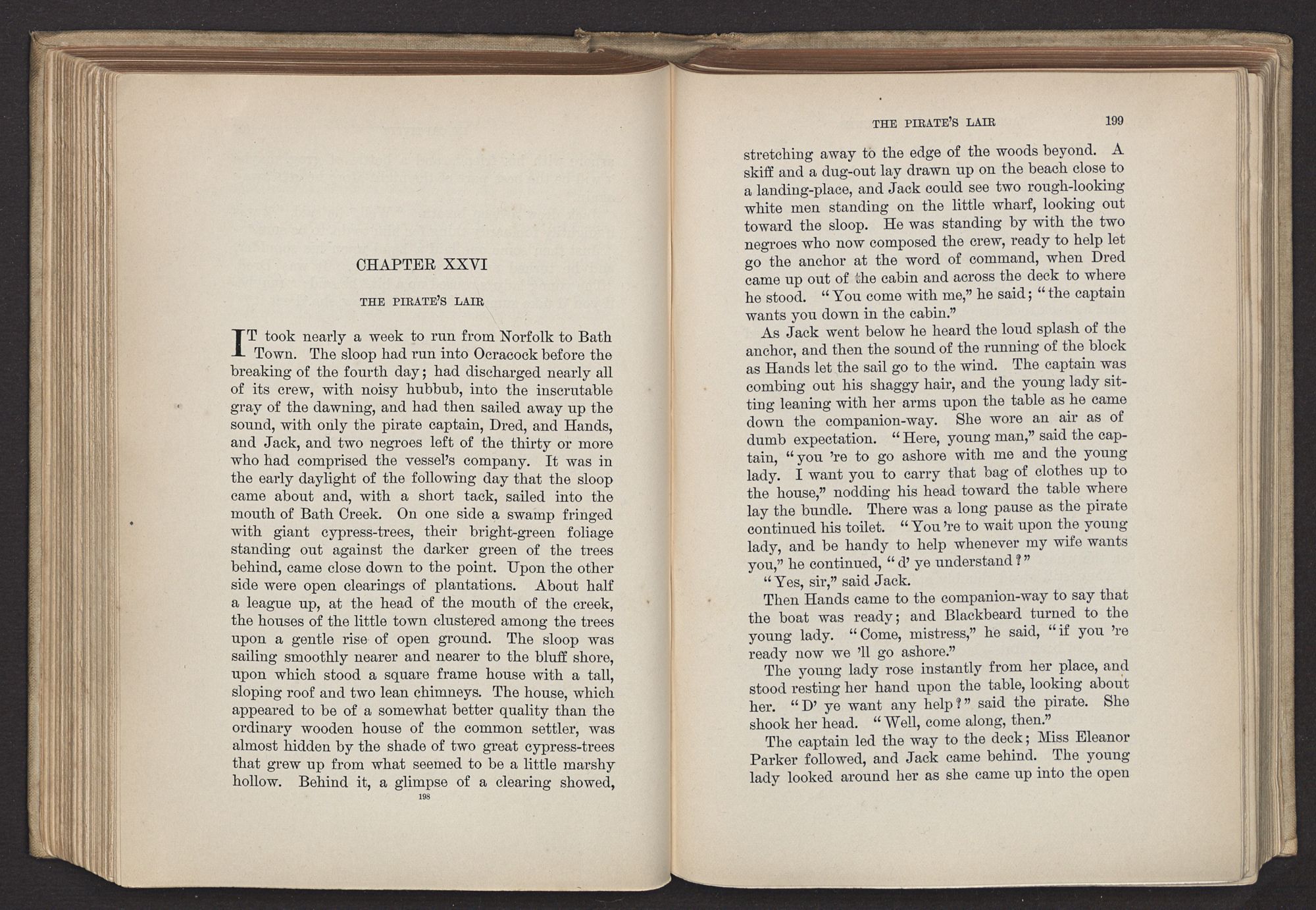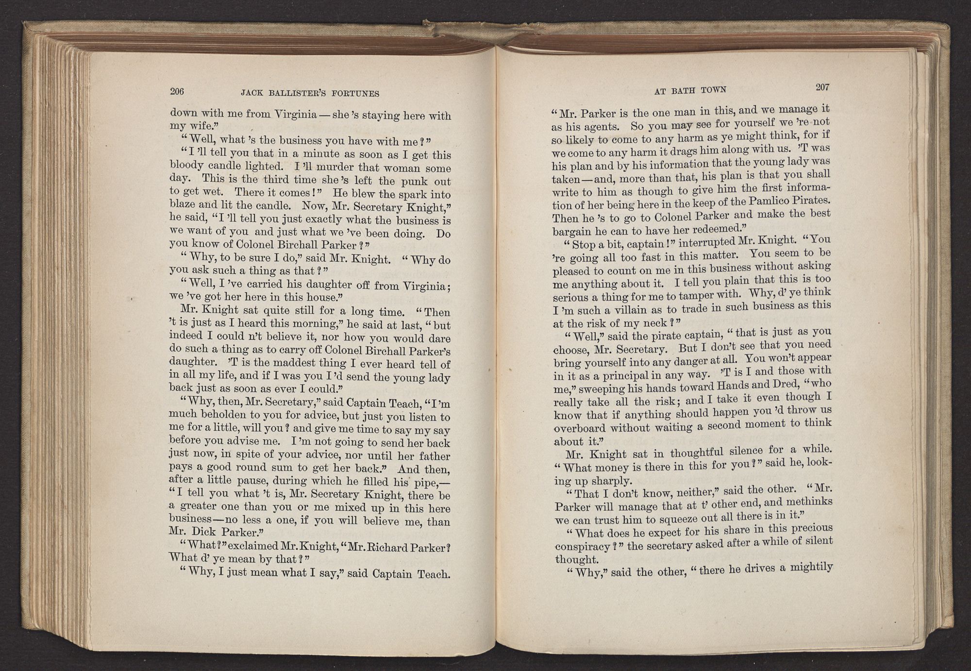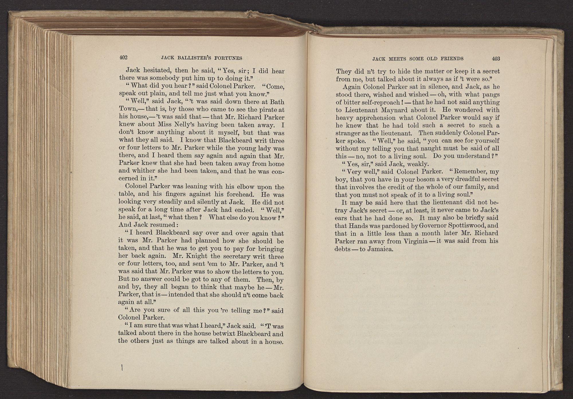 “Well,” said Jack, “’t was said down there at Bath Town,—that is, by those who came to see the pirate at his house,—’t was said that—that Mr. Richard Parker knew about Miss Nelly's having been taken away. I don't know anything about it myself, but that was what they all said. I know that Blackbeard writ three or four letters to Mr. Parker while the young lady was there, and I heard them say again and again that Mr. Parker knew that she had been taken away from home and whither she had been taken, and that he was concerned in it.”
