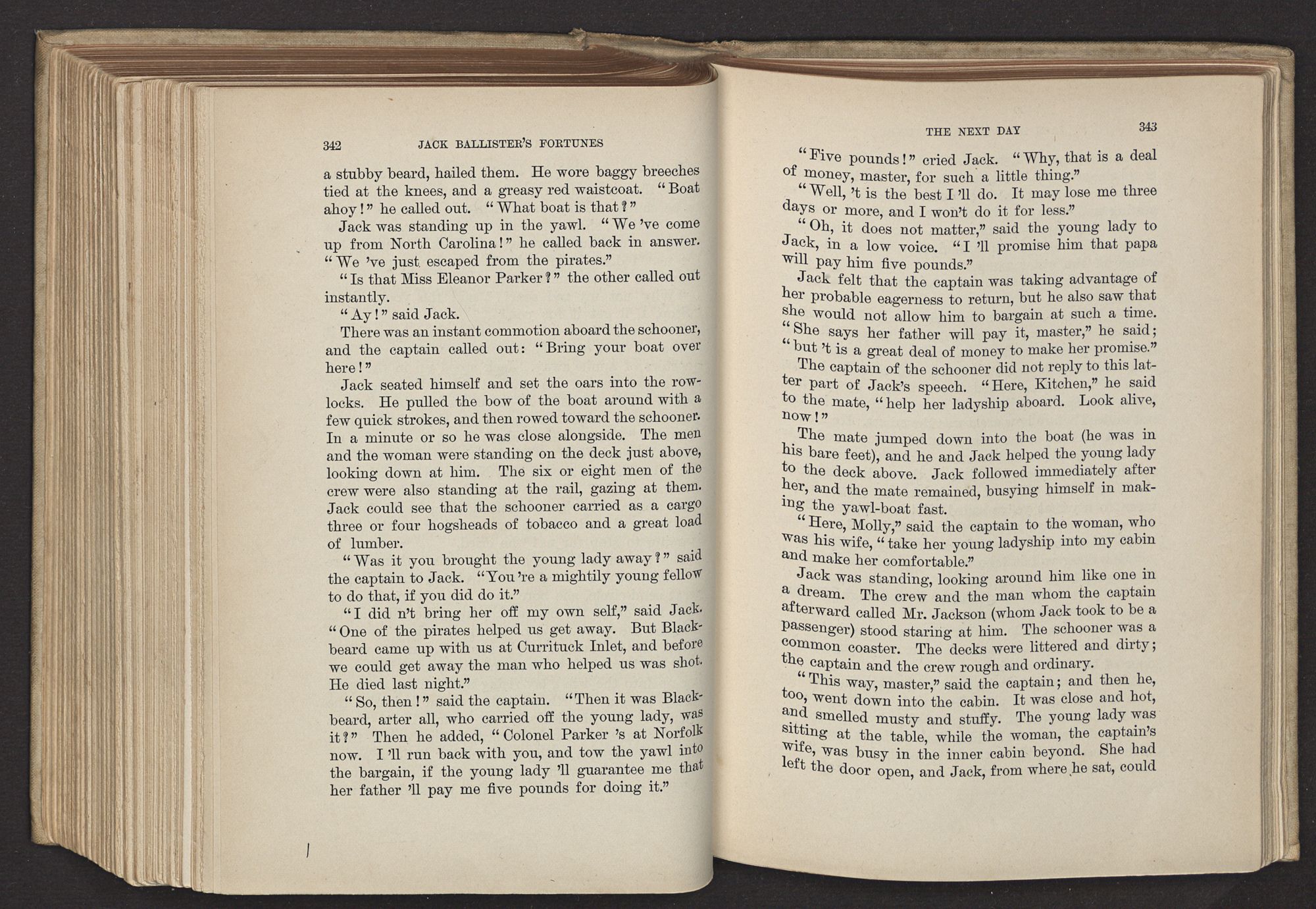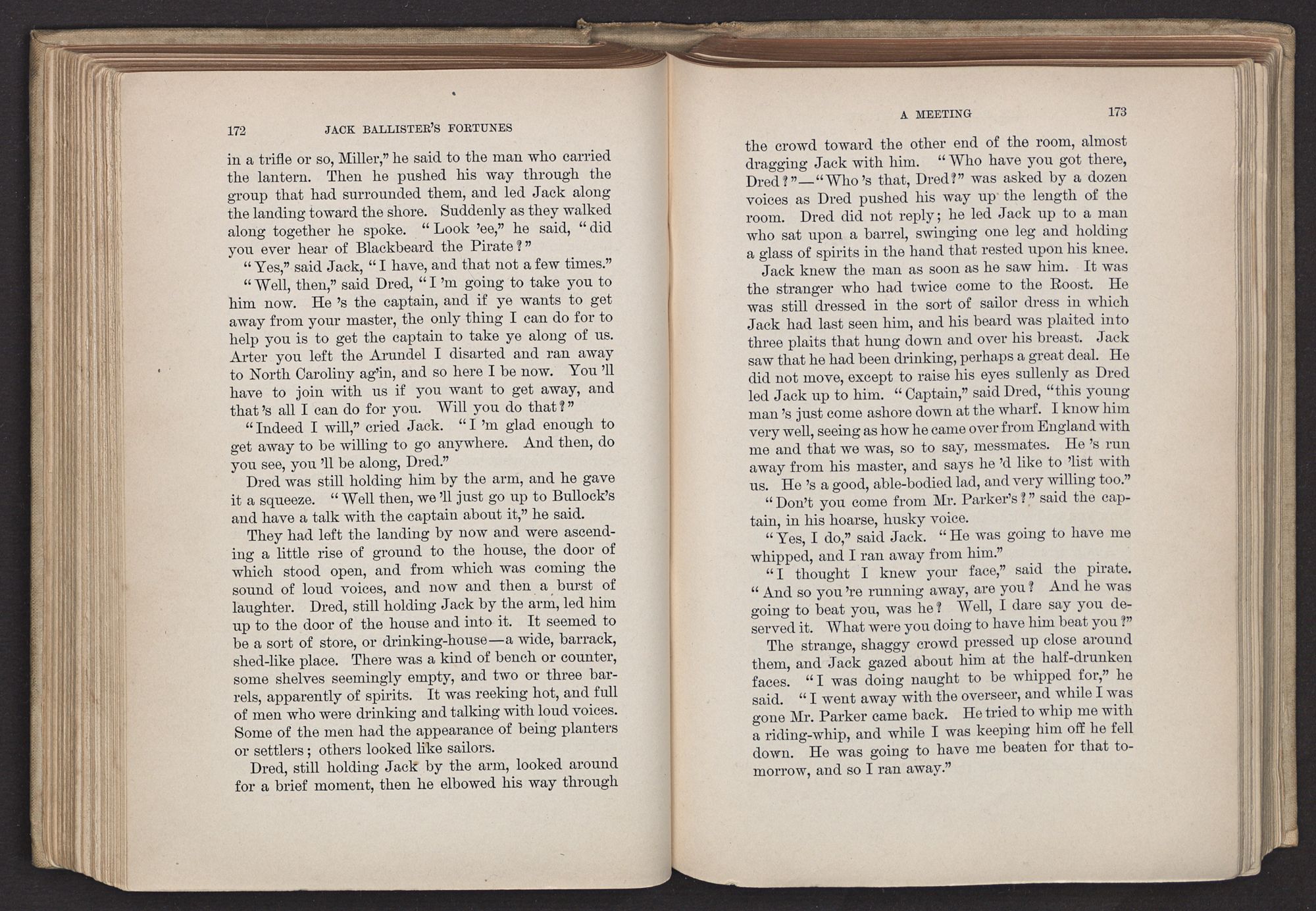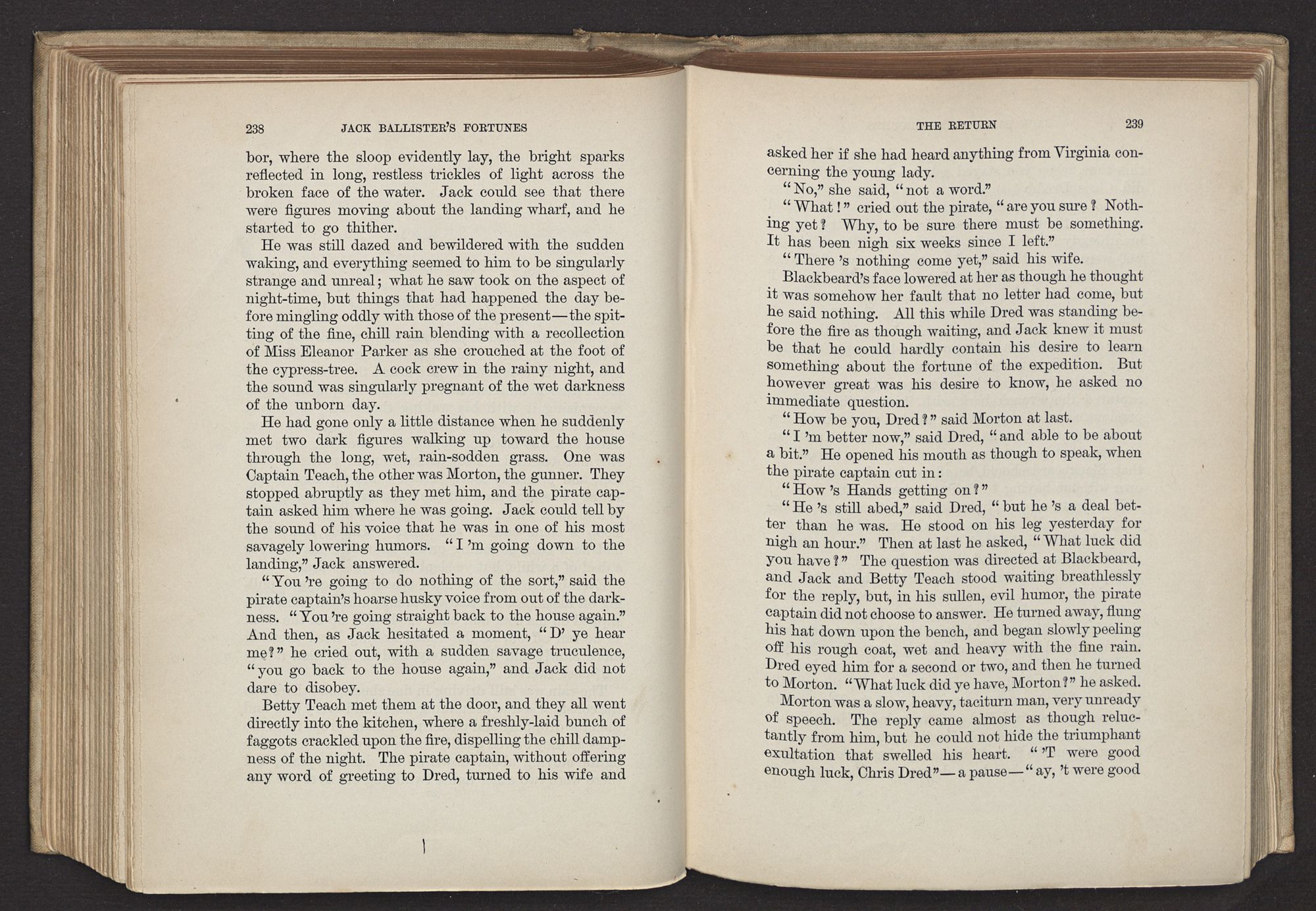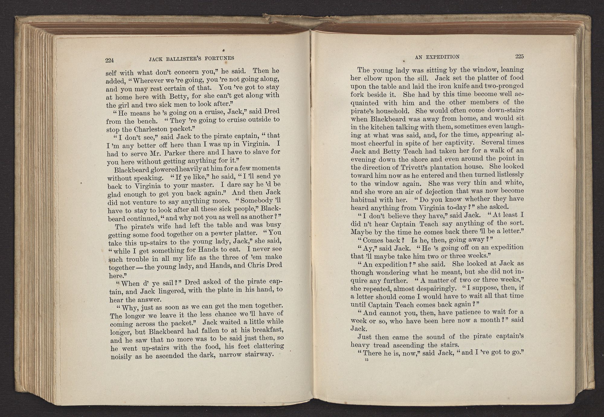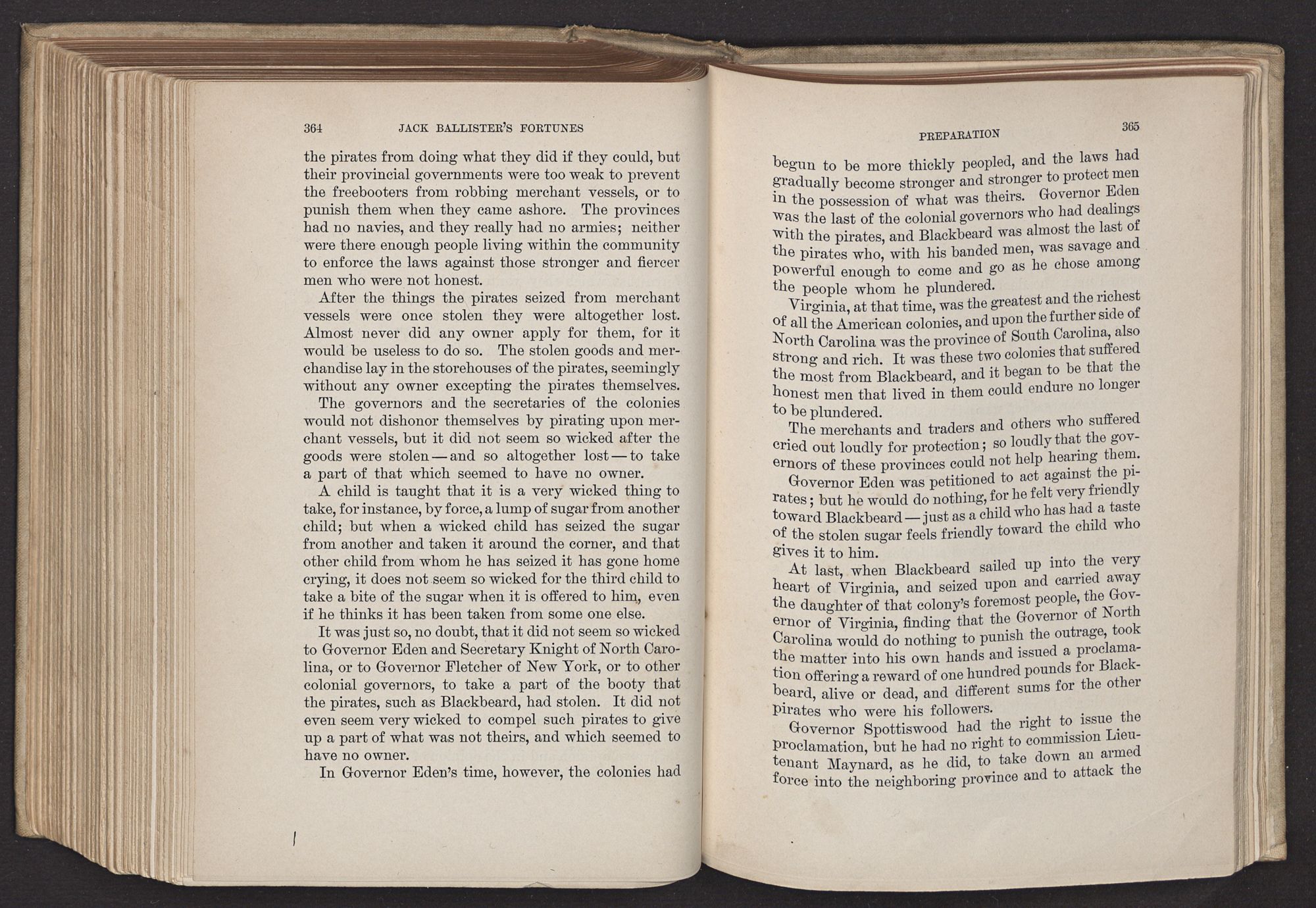 “Well,” said Jack, “’t was said down there at Bath Town,—that is, by those who came to see the pirate at his house,—’t was said that—that Mr. Richard Parker knew about Miss Nelly's having been taken away. I don't know anything about it myself, but that was what they all said. I know that Blackbeard writ three or four letters to Mr. Parker while the young lady was there, and I heard them say again and again that Mr. Parker knew that she had been taken away from home and whither she had been taken, and that he was concerned in it.”
