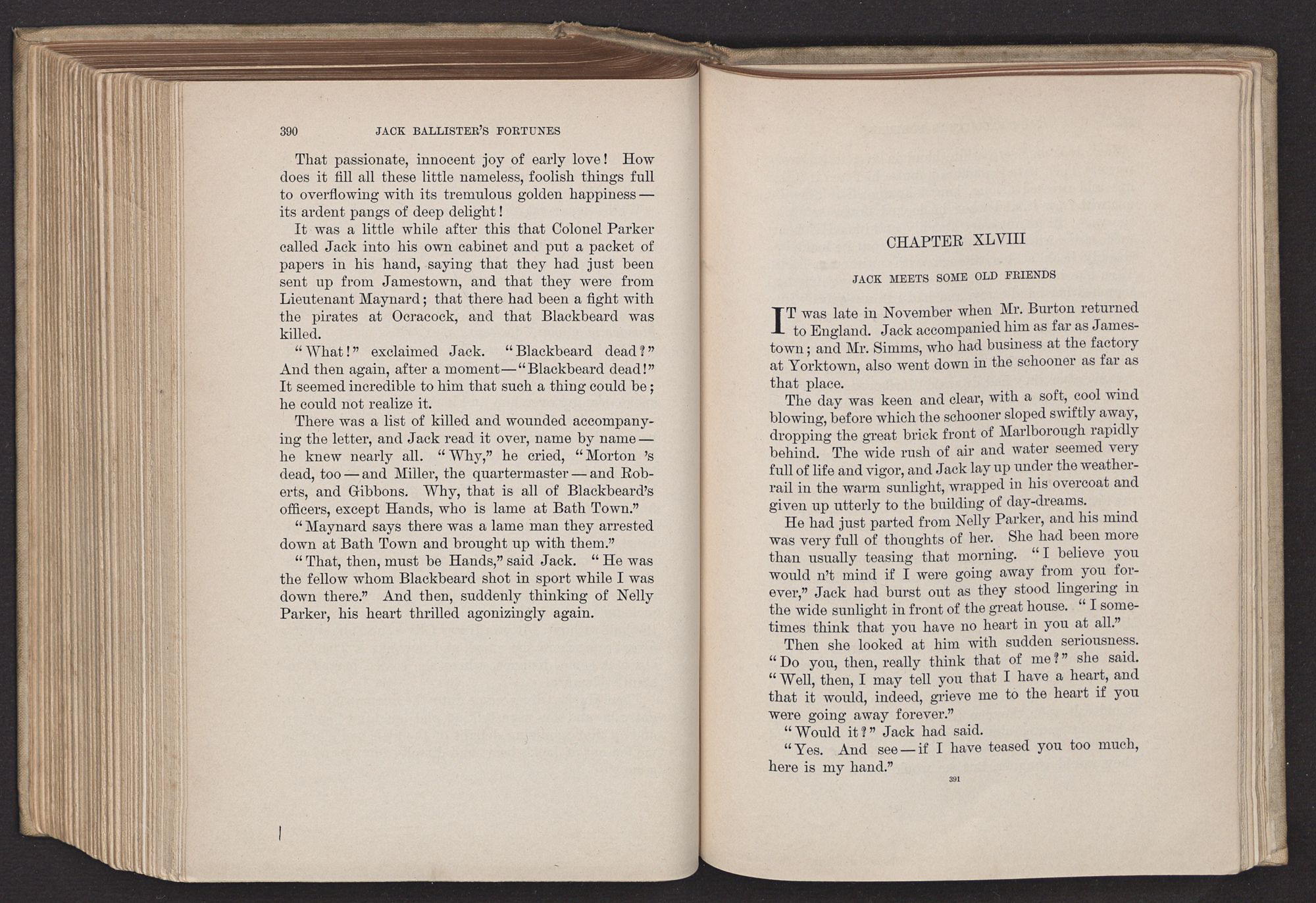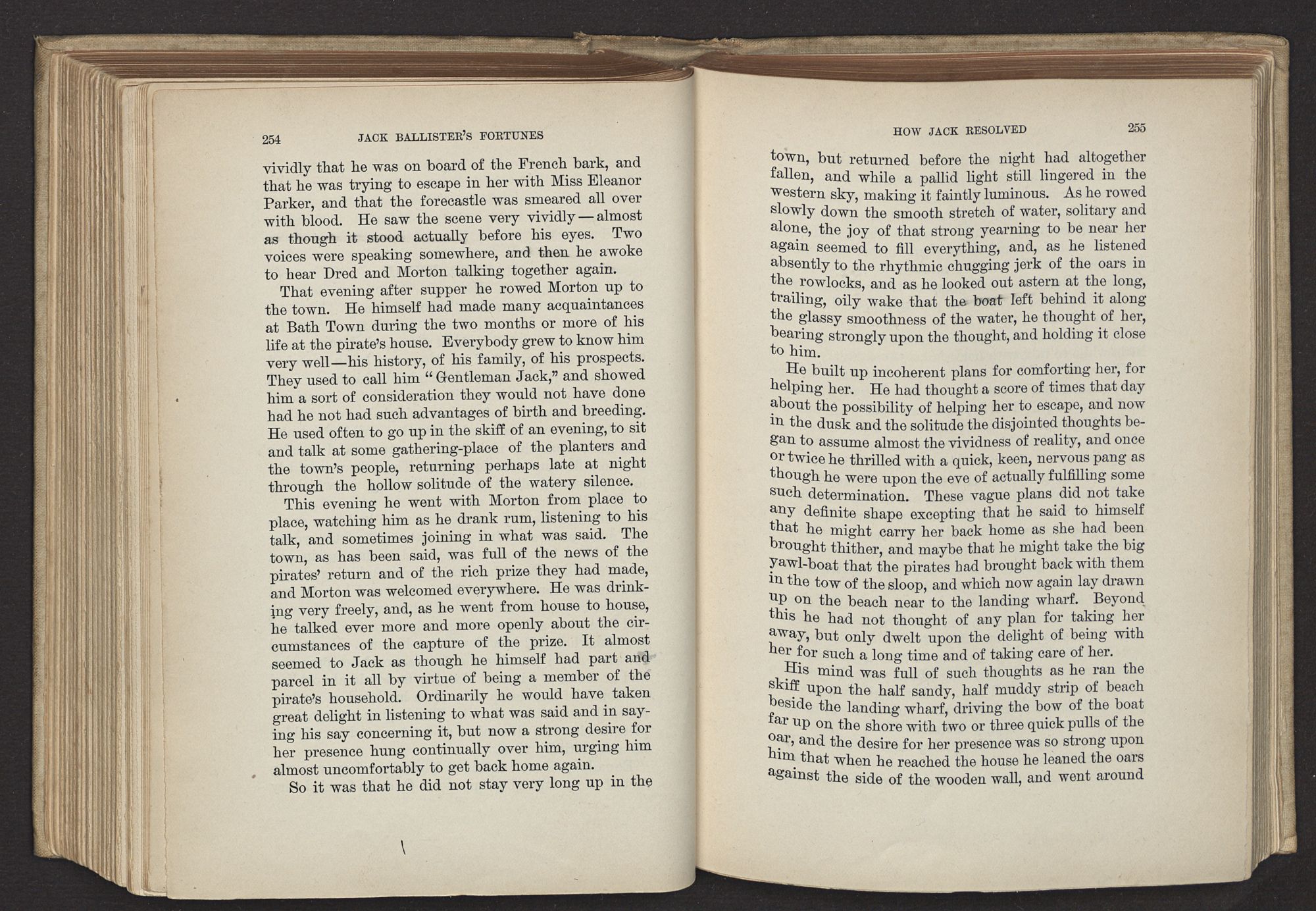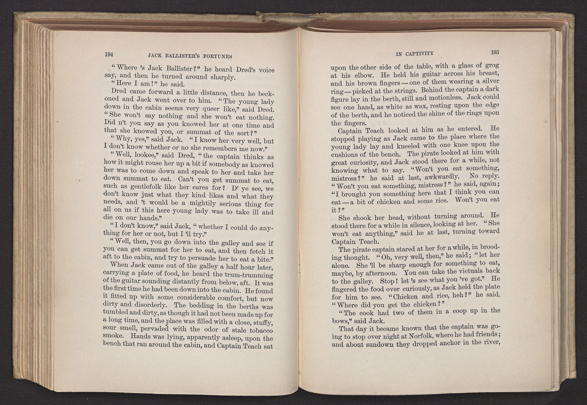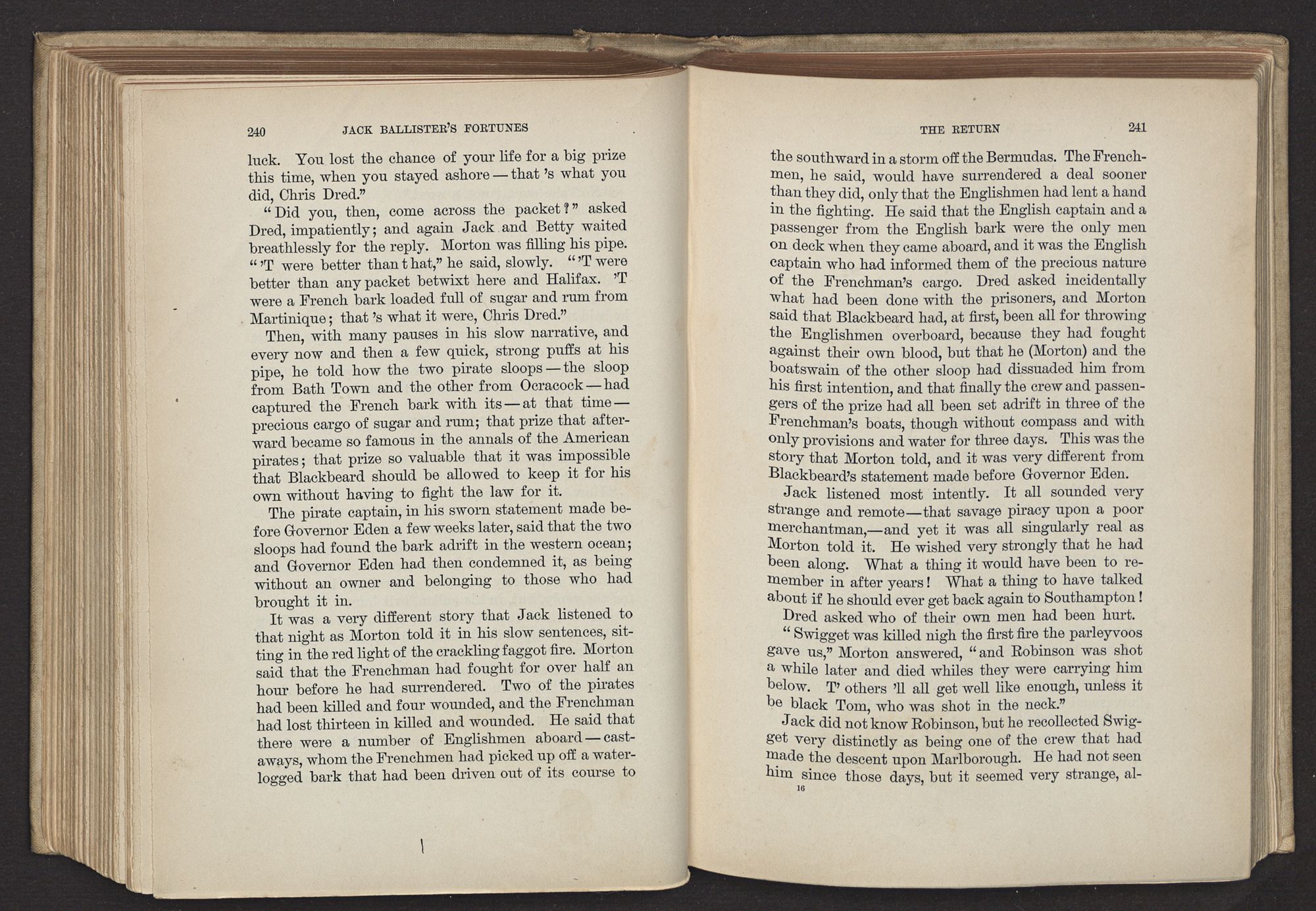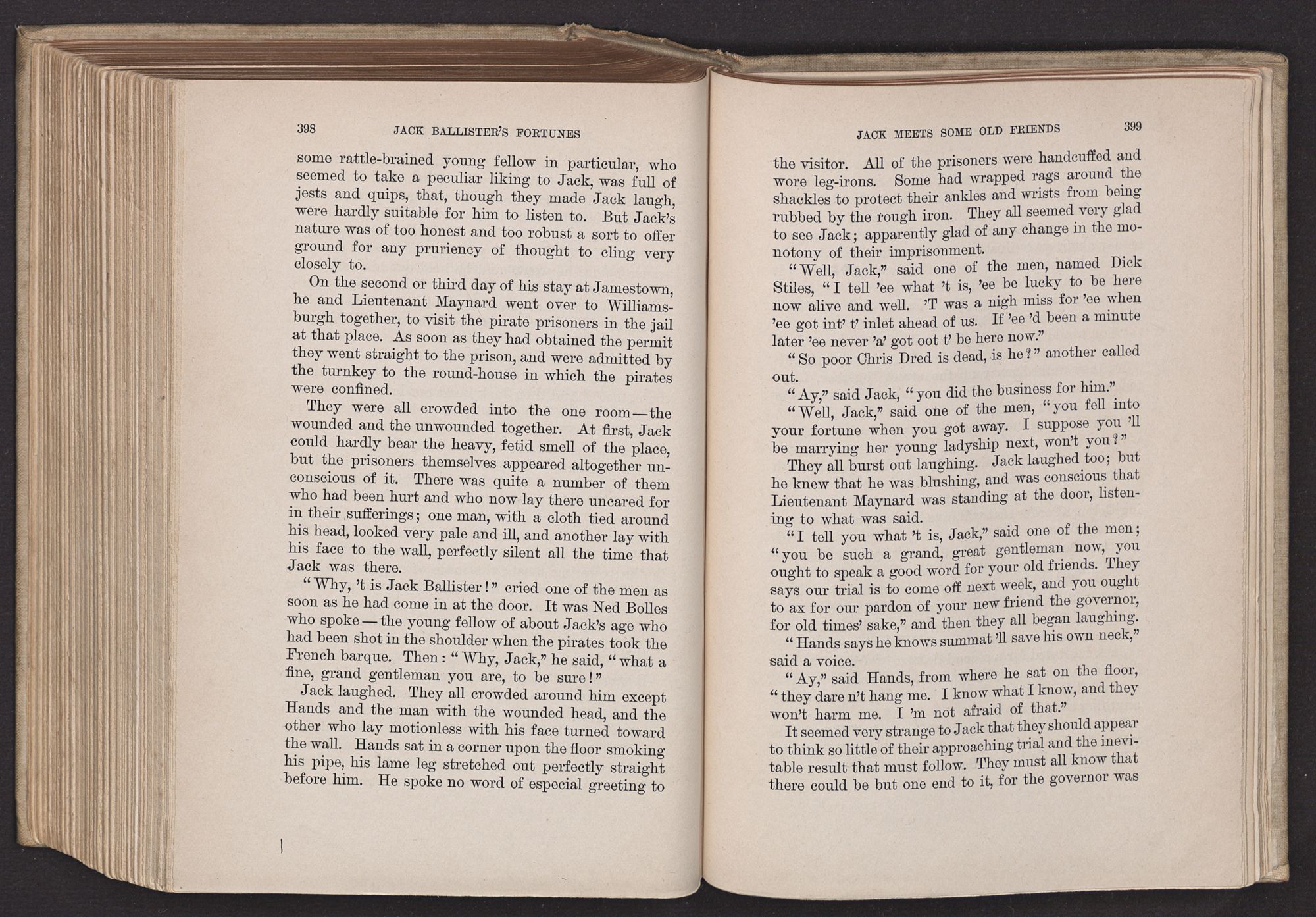 “Well,” said Jack, “’t was said down there at Bath Town,—that is, by those who came to see the pirate at his house,—’t was said that—that Mr. Richard Parker knew about Miss Nelly's having been taken away. I don't know anything about it myself, but that was what they all said. I know that Blackbeard writ three or four letters to Mr. Parker while the young lady was there, and I heard them say again and again that Mr. Parker knew that she had been taken away from home and whither she had been taken, and that he was concerned in it.”