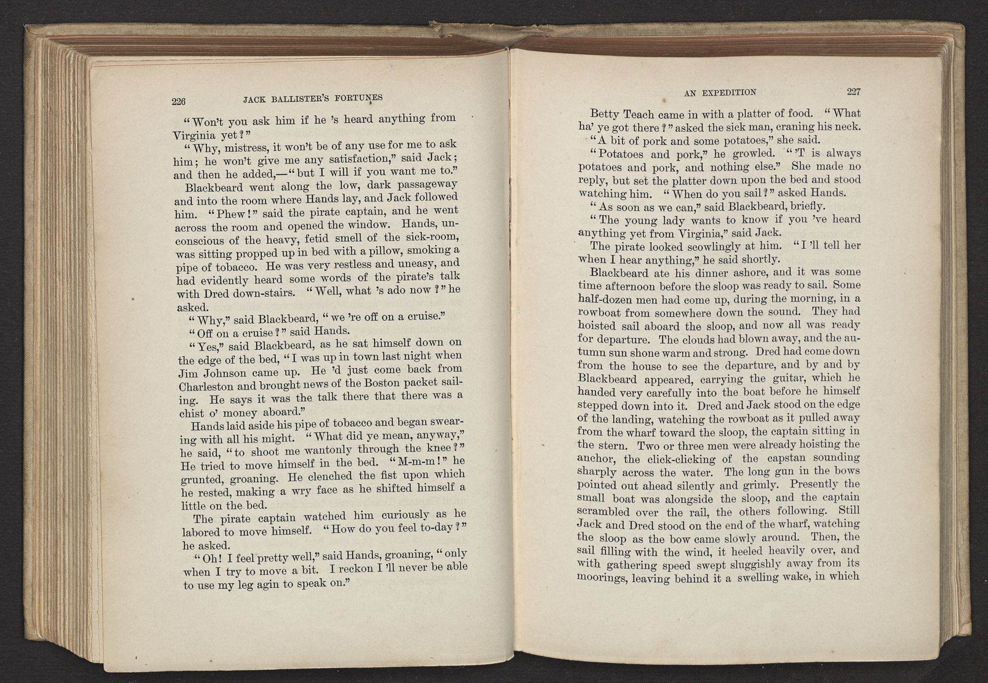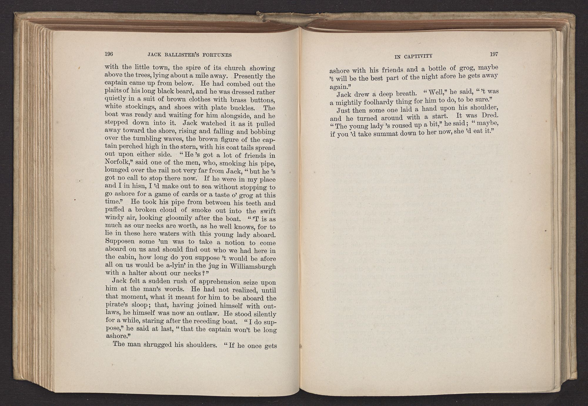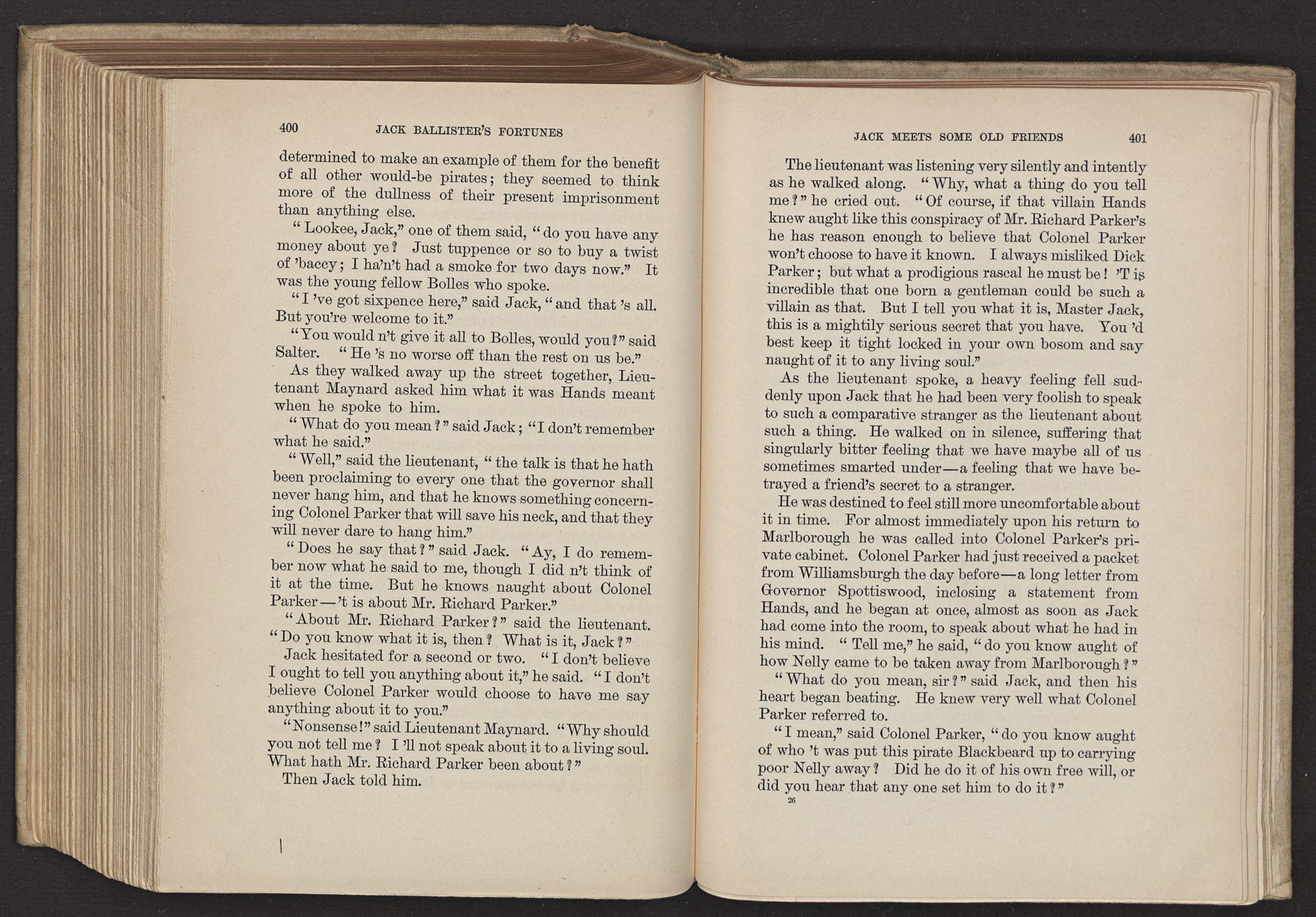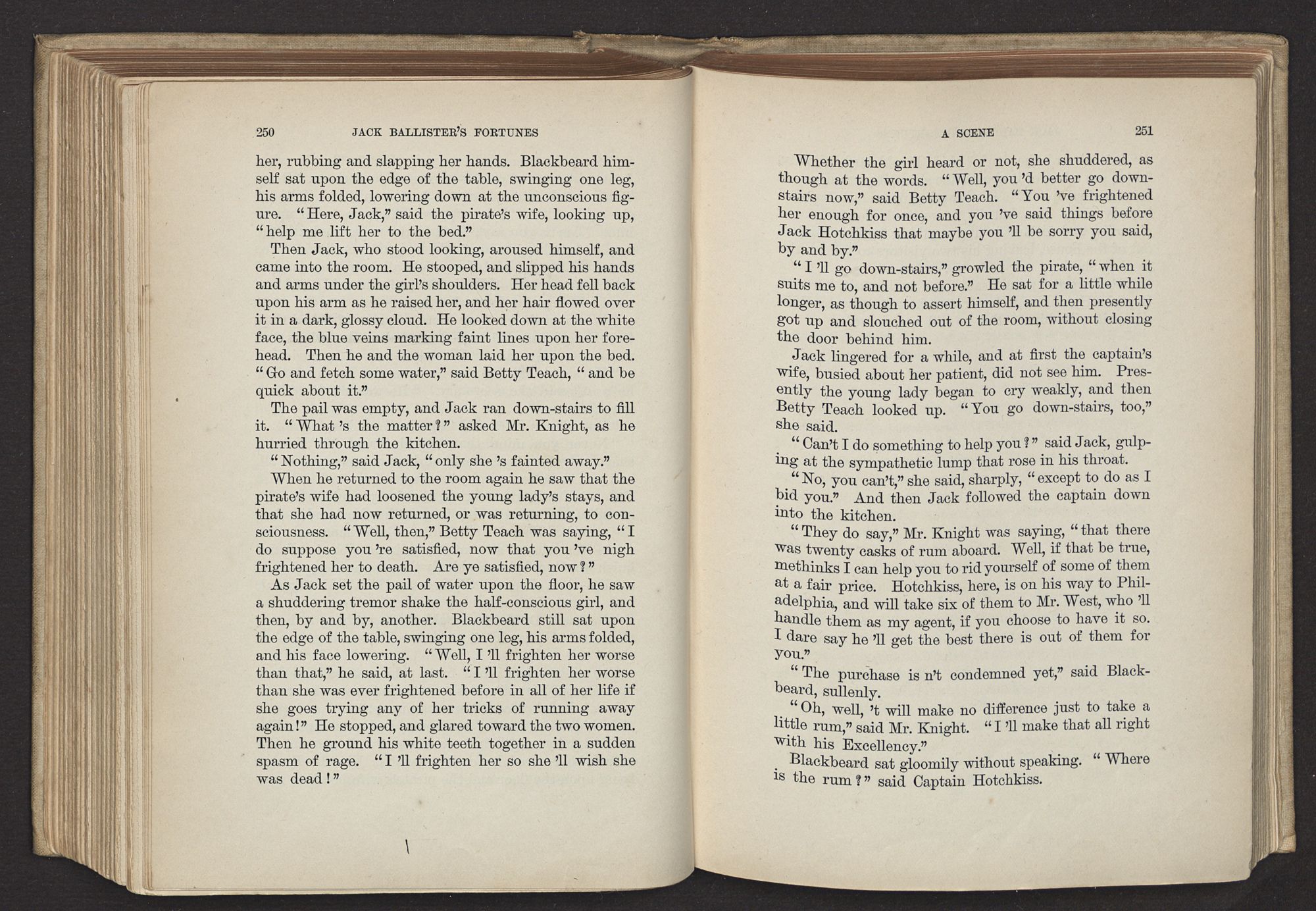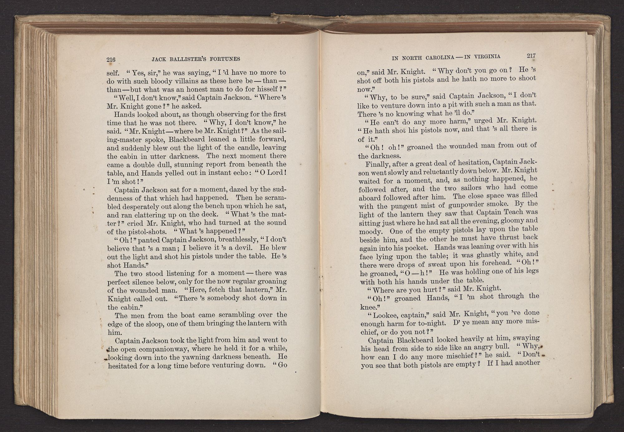 “Well,” said Jack, “’t was said down there at Bath Town,—that is, by those who came to see the pirate at his house,—’t was said that—that Mr. Richard Parker knew about Miss Nelly's having been taken away. I don't know anything about it myself, but that was what they all said. I know that Blackbeard writ three or four letters to Mr. Parker while the young lady was there, and I heard them say again and again that Mr. Parker knew that she had been taken away from home and whither she had been taken, and that he was concerned in it.”