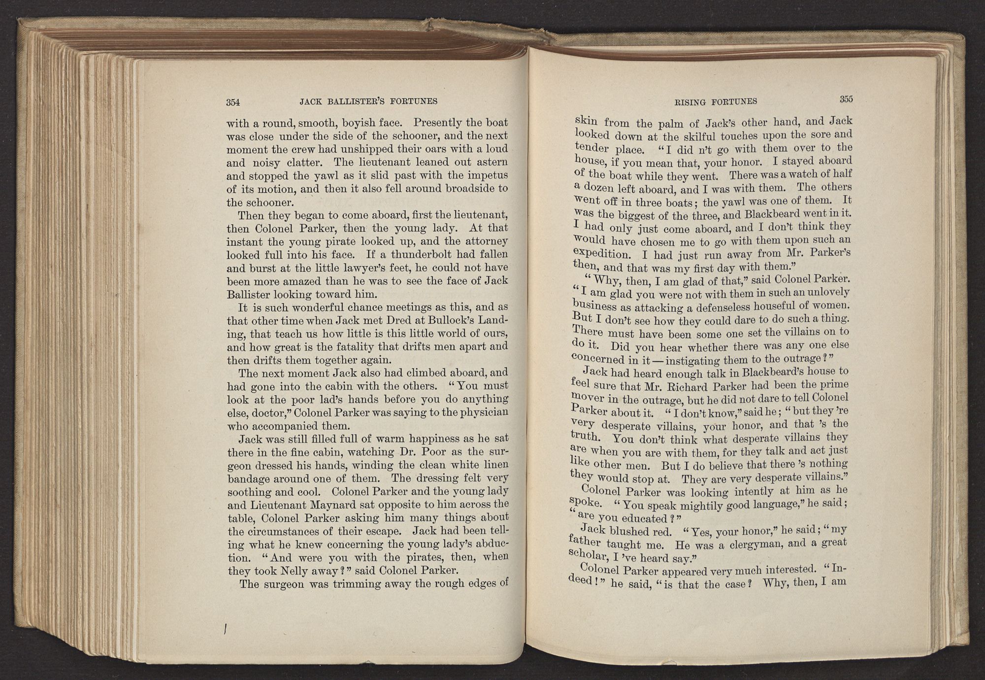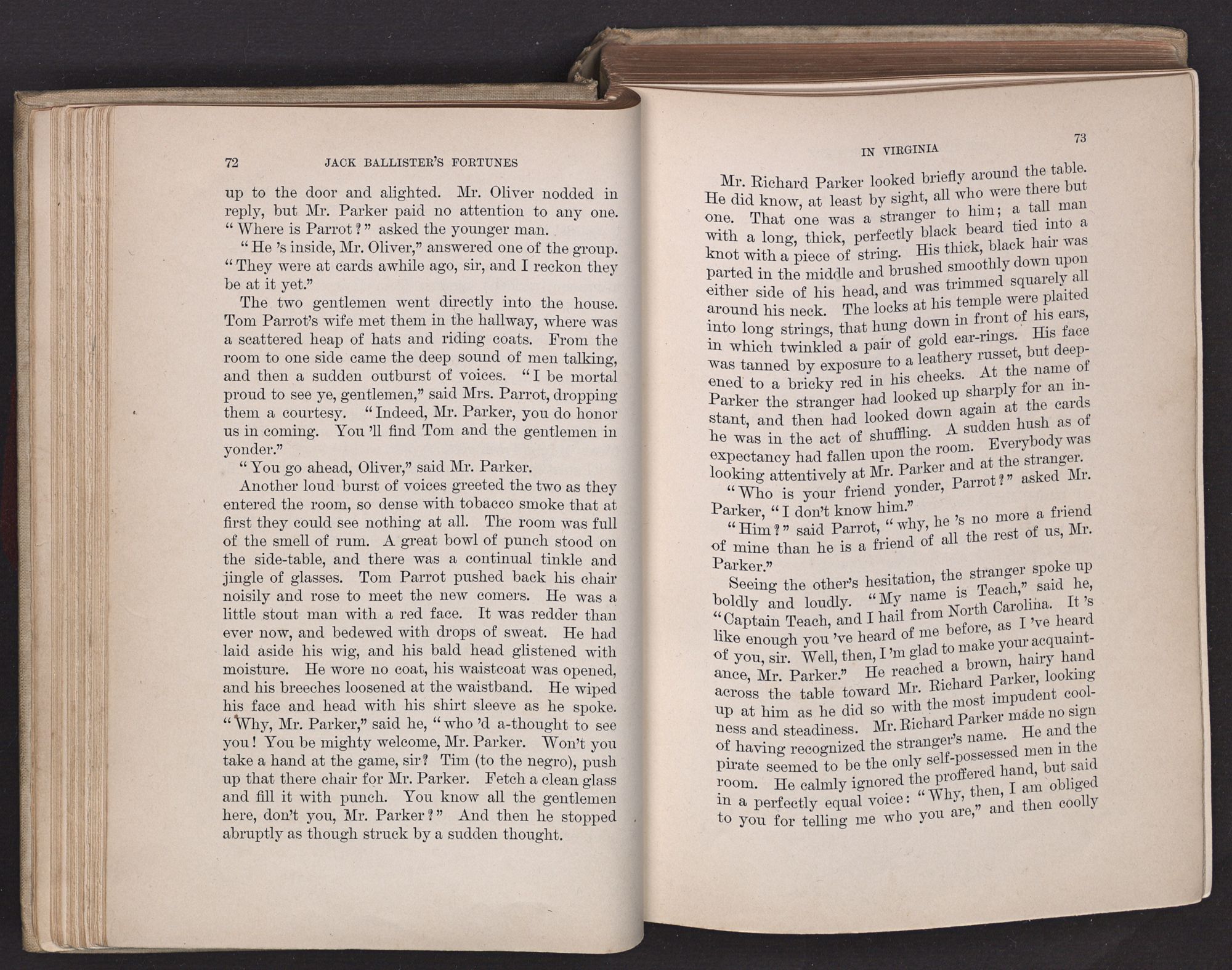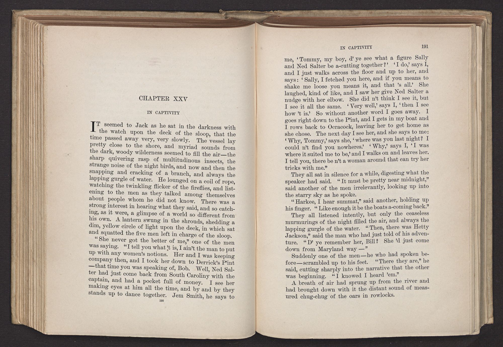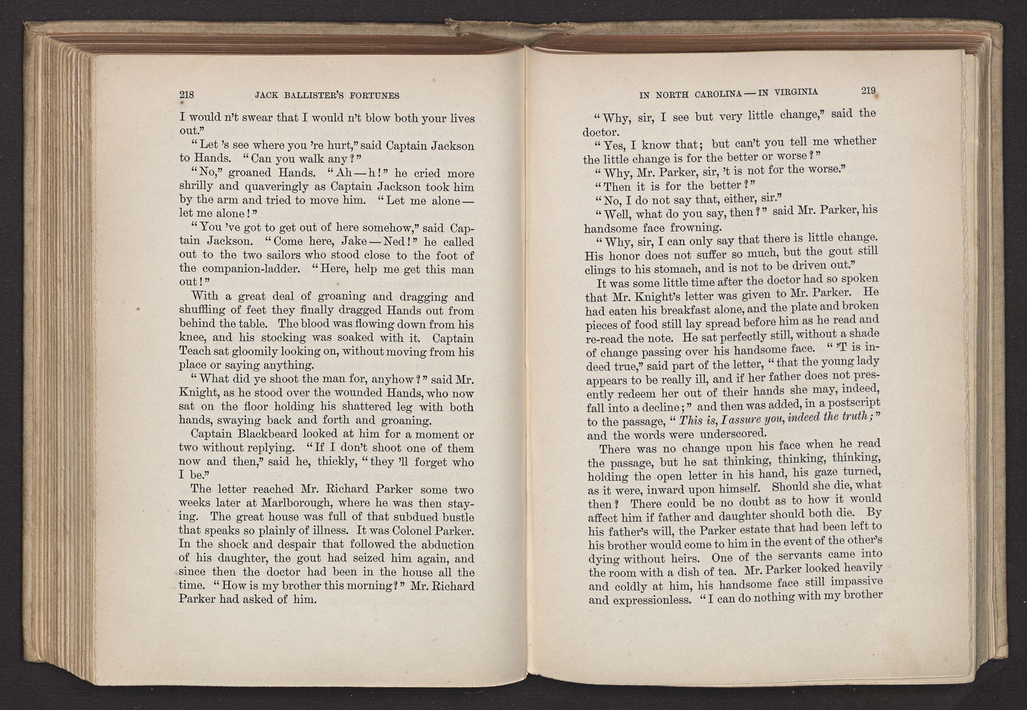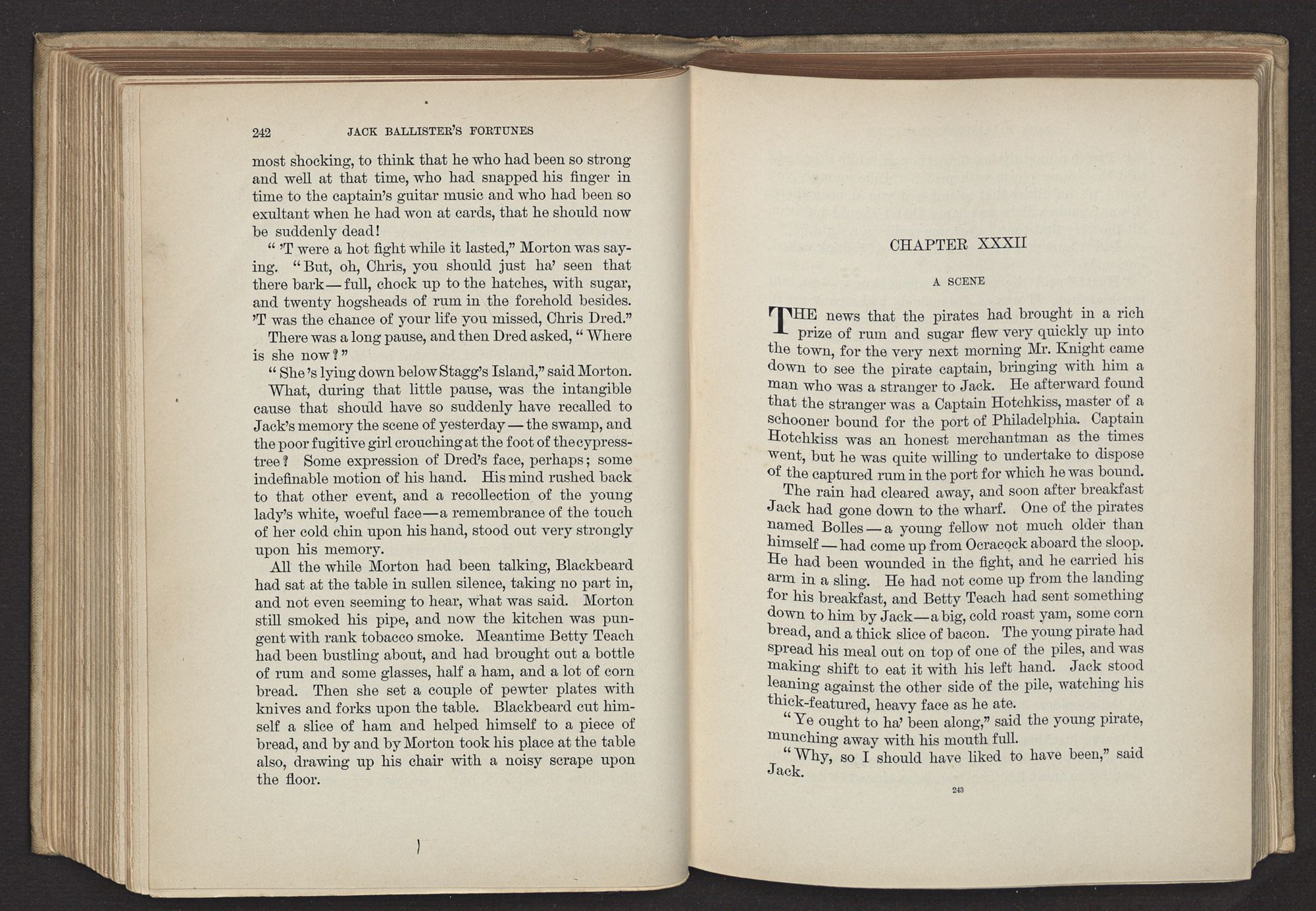 “Well,” said Jack, “’t was said down there at Bath Town,—that is, by those who came to see the pirate at his house,—’t was said that—that Mr. Richard Parker knew about Miss Nelly's having been taken away. I don't know anything about it myself, but that was what they all said. I know that Blackbeard writ three or four letters to Mr. Parker while the young lady was there, and I heard them say again and again that Mr. Parker knew that she had been taken away from home and whither she had been taken, and that he was concerned in it.”