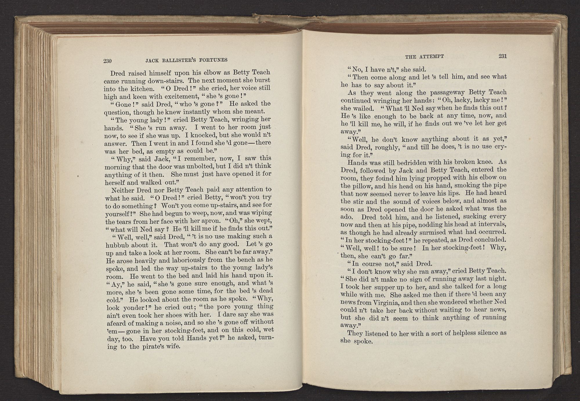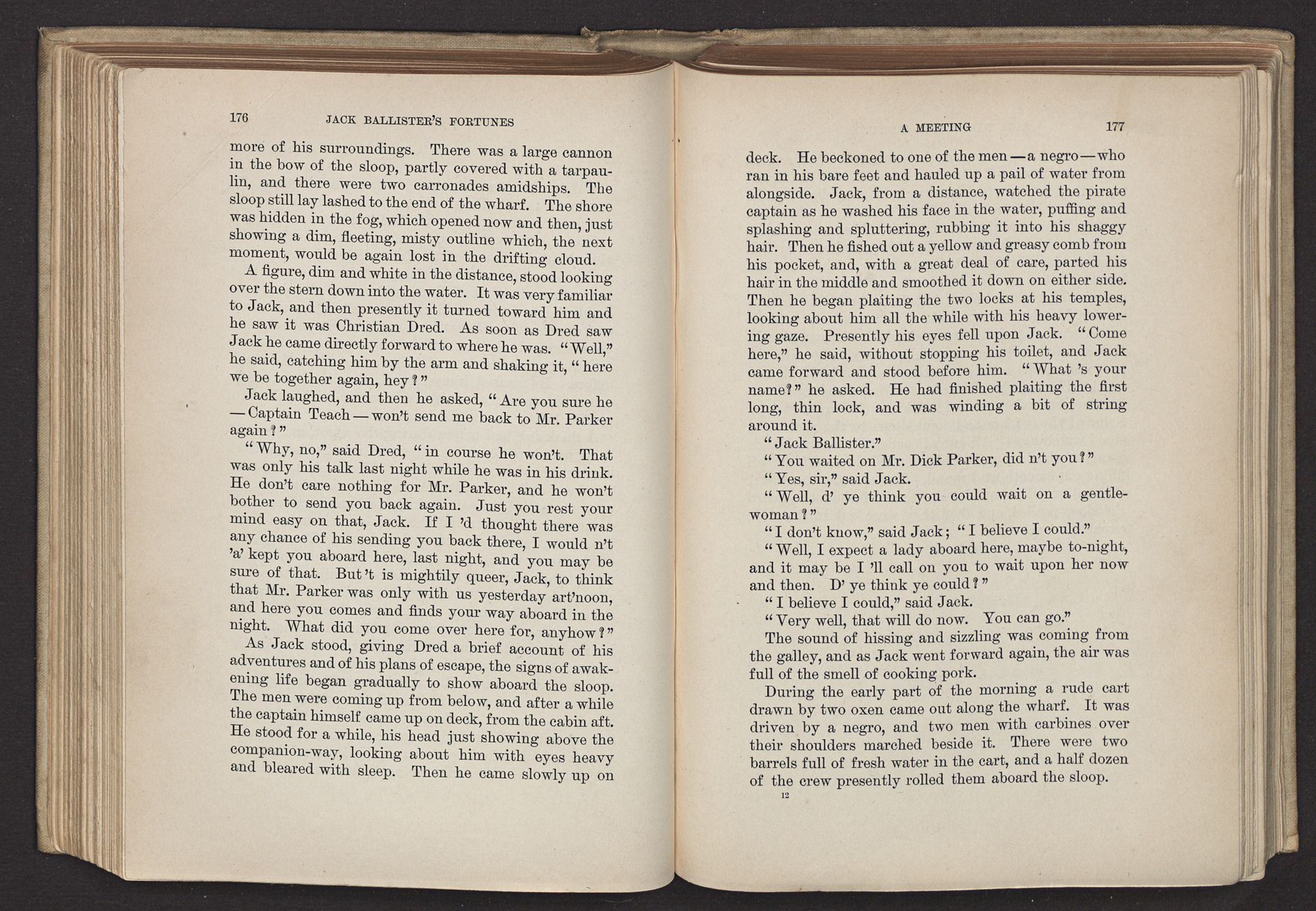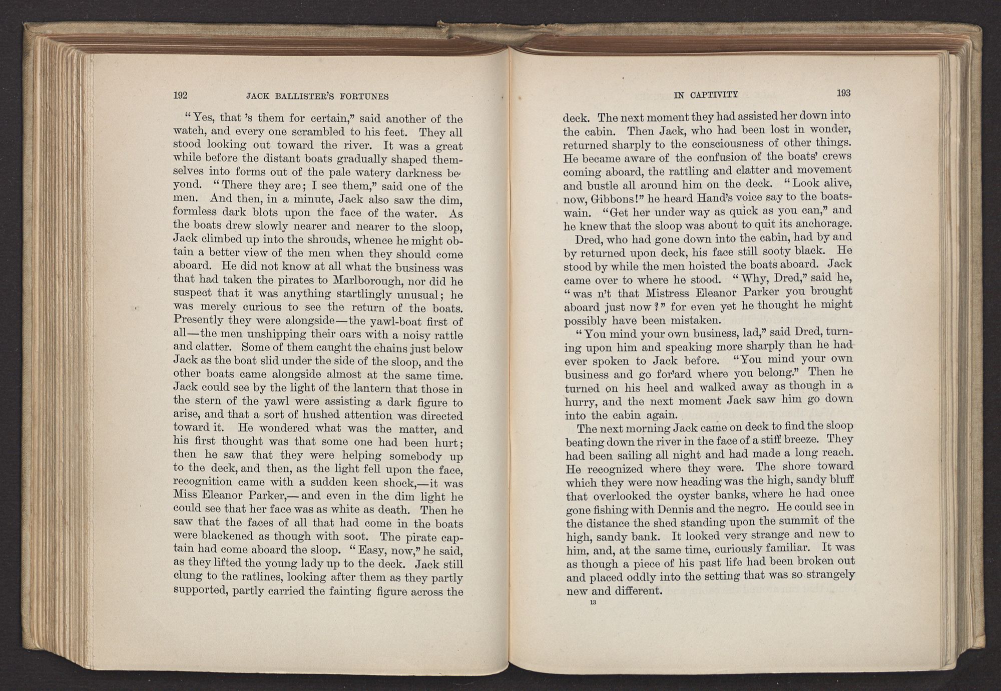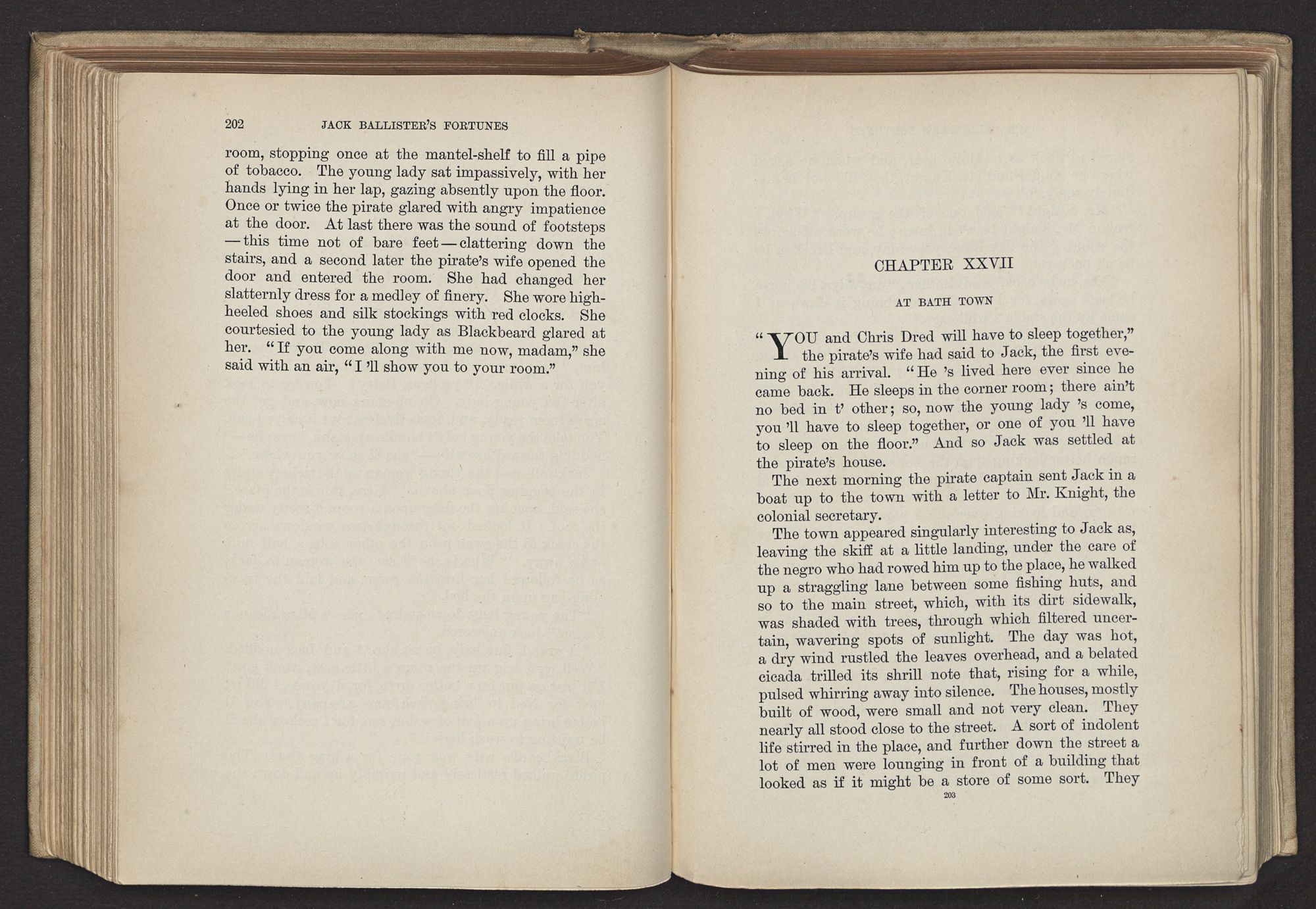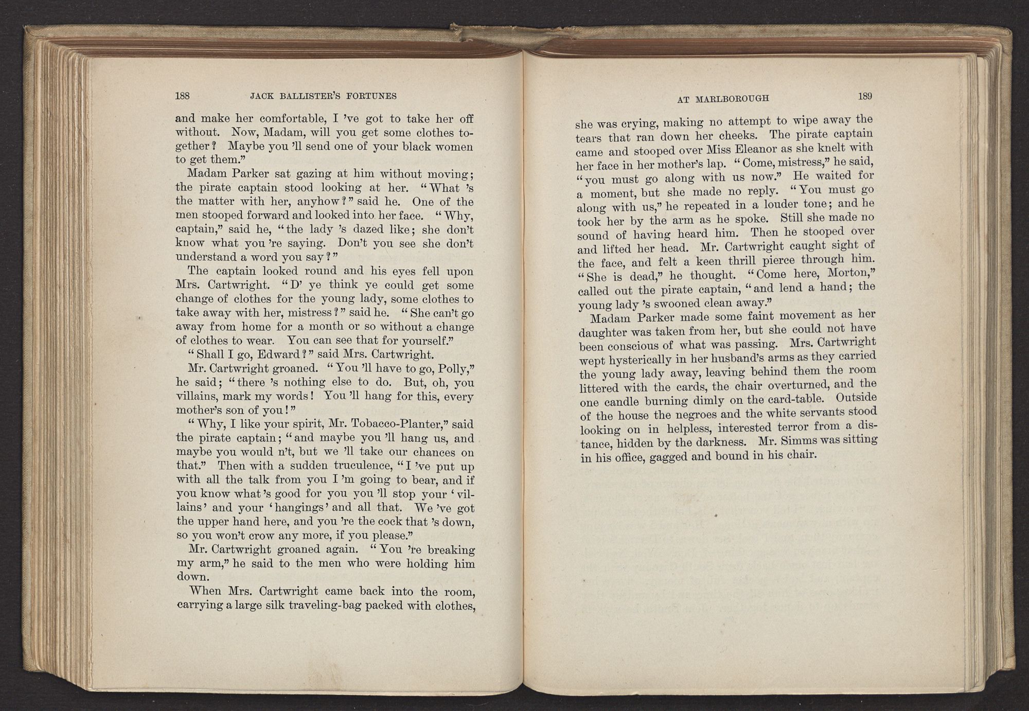“Well,” said Jack, “’t was said down there at Bath Town,—that is, by those who came to see the pirate at his house,—’t was said that—that Mr. Richard Parker knew about Miss Nelly's having been taken away. I don't know anything about it myself, but that was what they all said. I know that Blackbeard writ three or four letters to Mr. Parker while the young lady was there, and I heard them say again and again that Mr. Parker knew that she had been taken away from home and whither she had been taken, and that he was concerned in it.”