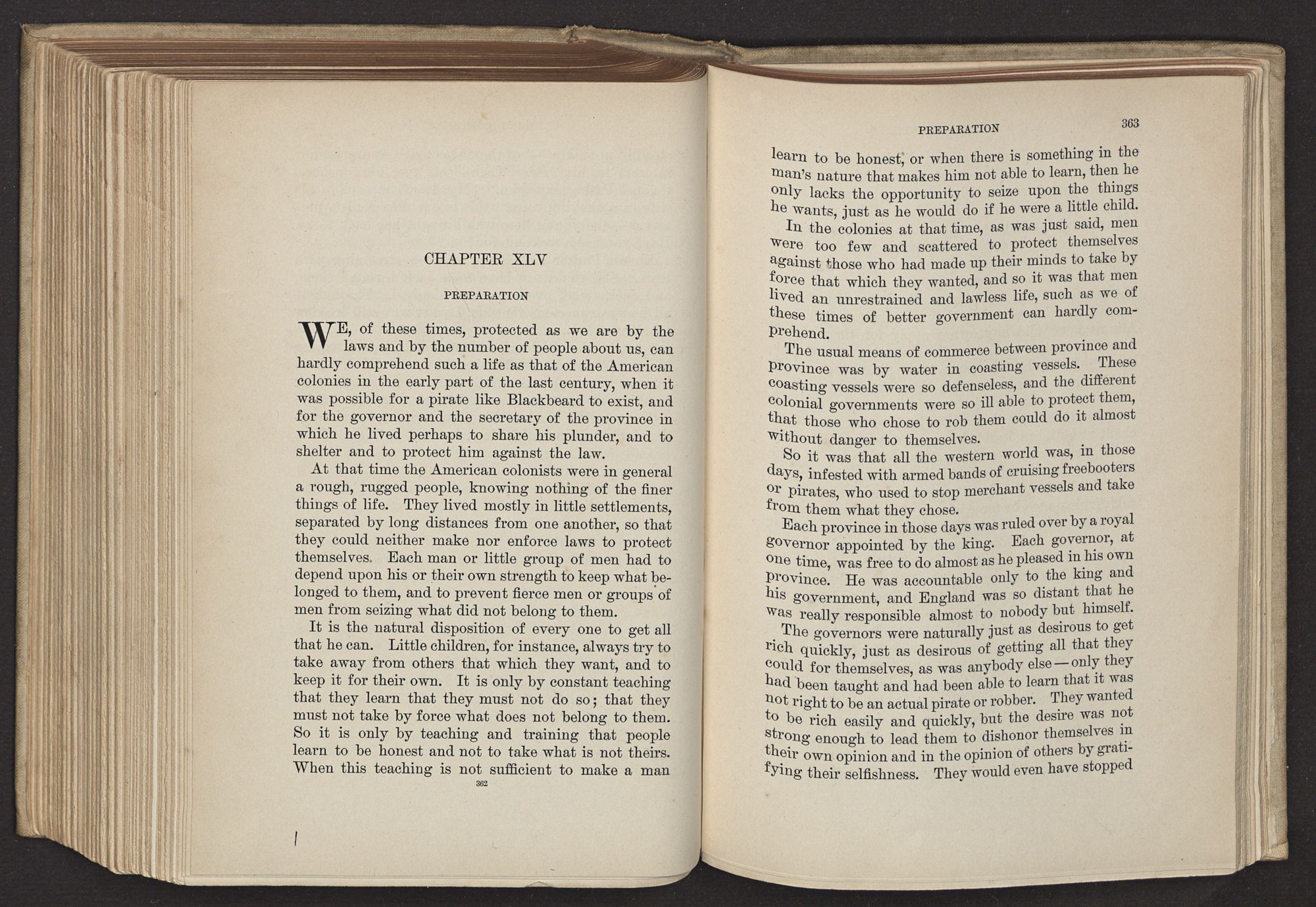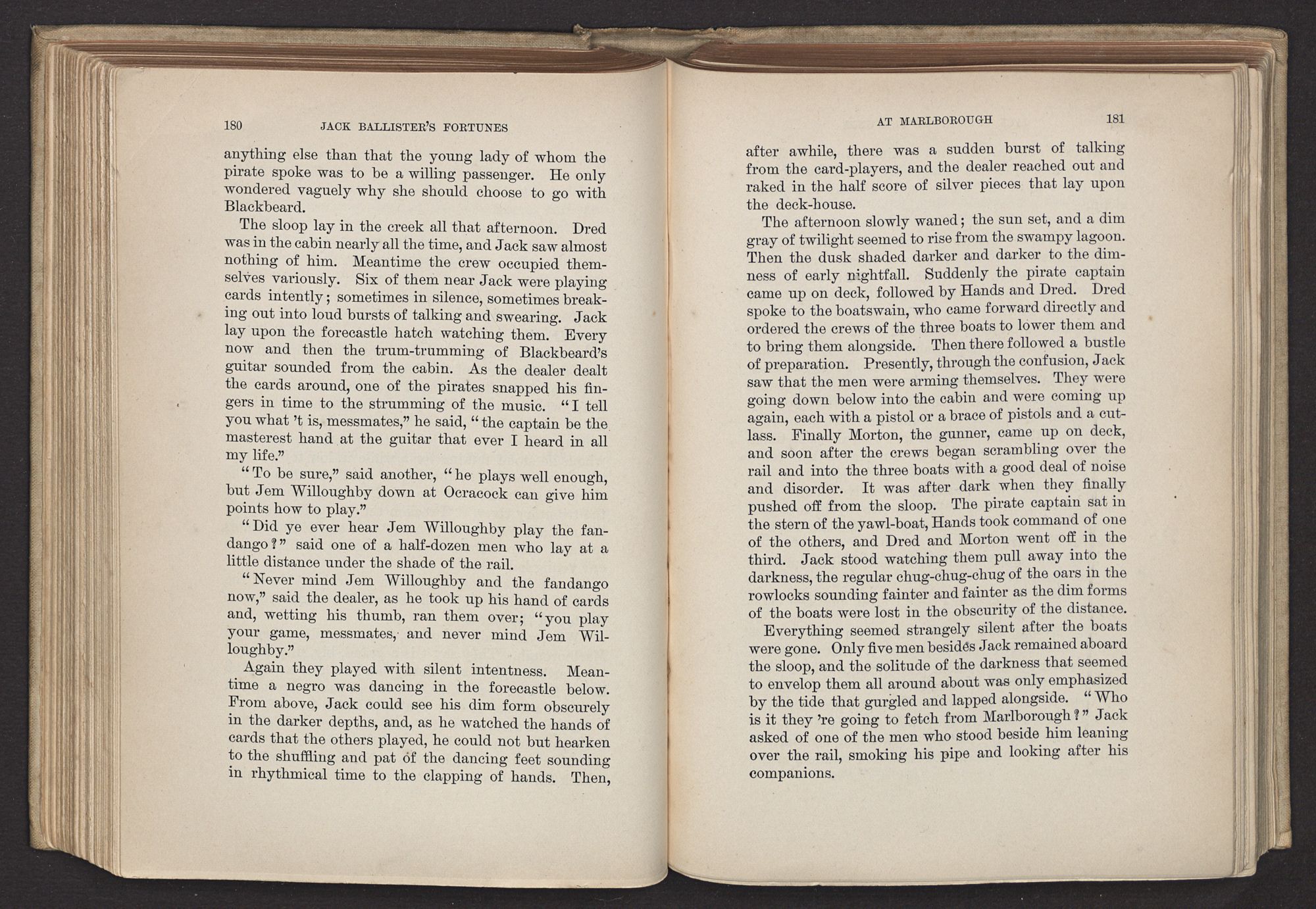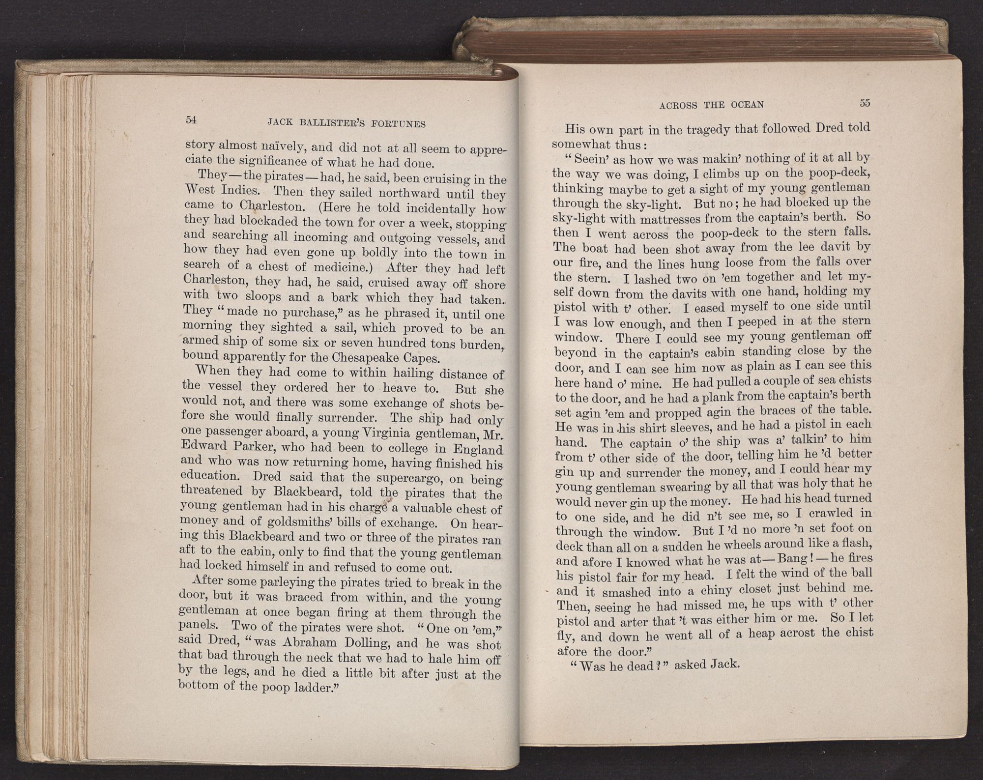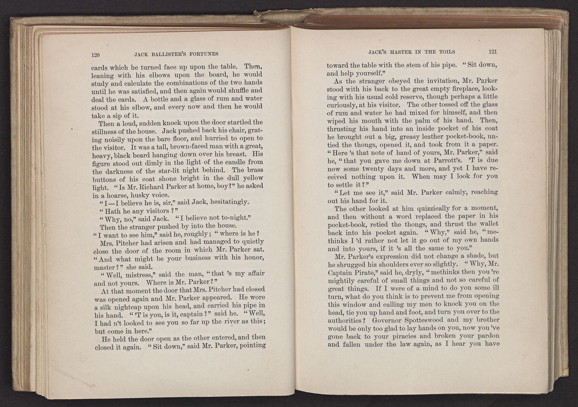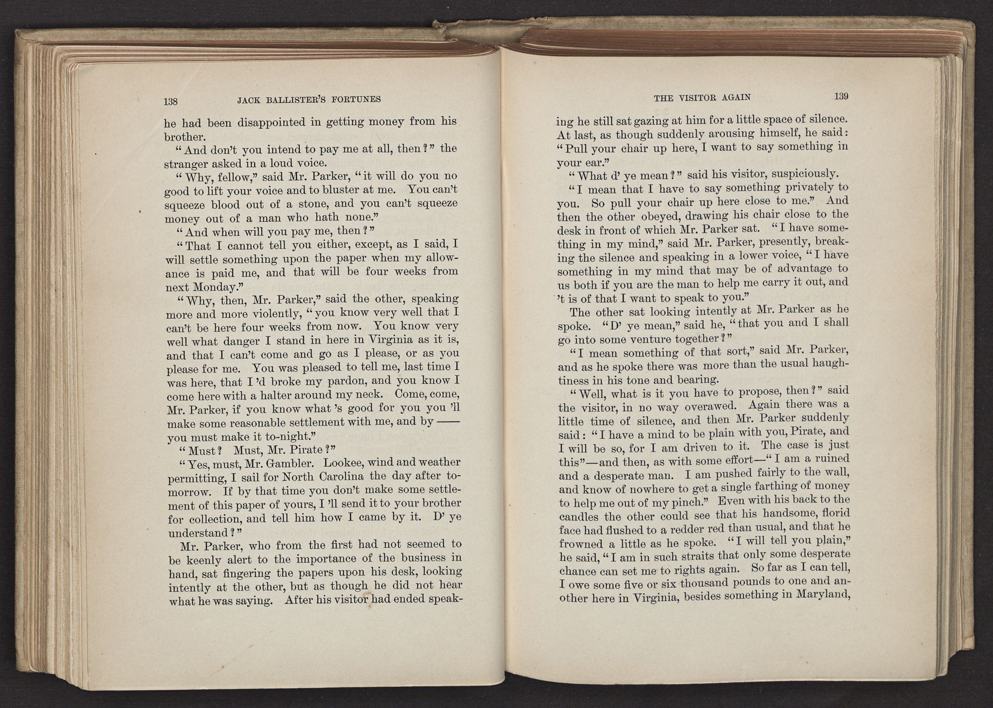 “Well,” said Jack, “’t was said down there at Bath Town,—that is, by those who came to see the pirate at his house,—’t was said that—that Mr. Richard Parker knew about Miss Nelly's having been taken away. I don't know anything about it myself, but that was what they all said. I know that Blackbeard writ three or four letters to Mr. Parker while the young lady was there, and I heard them say again and again that Mr. Parker knew that she had been taken away from home and whither she had been taken, and that he was concerned in it.”
