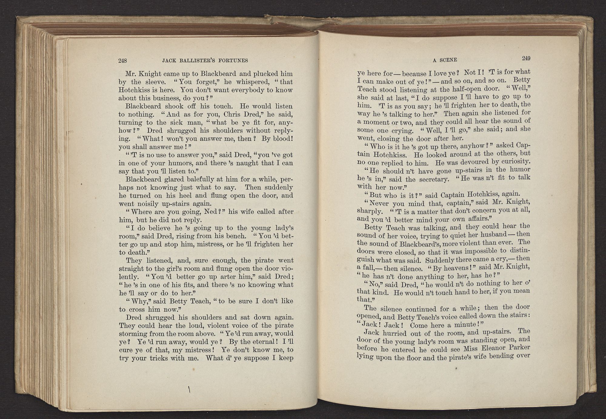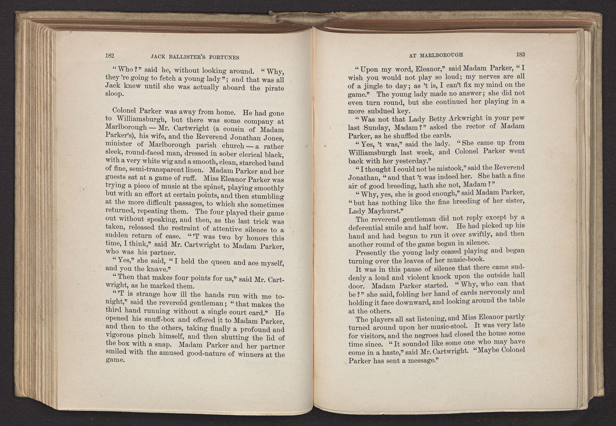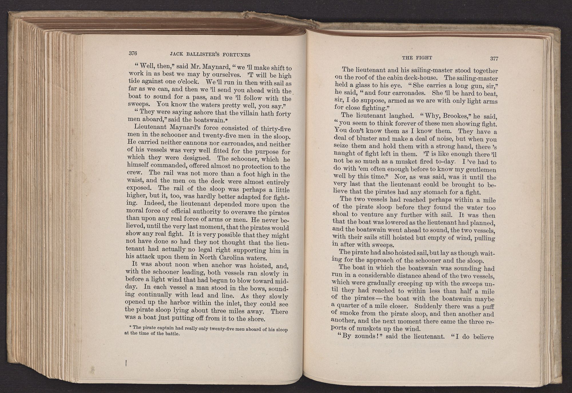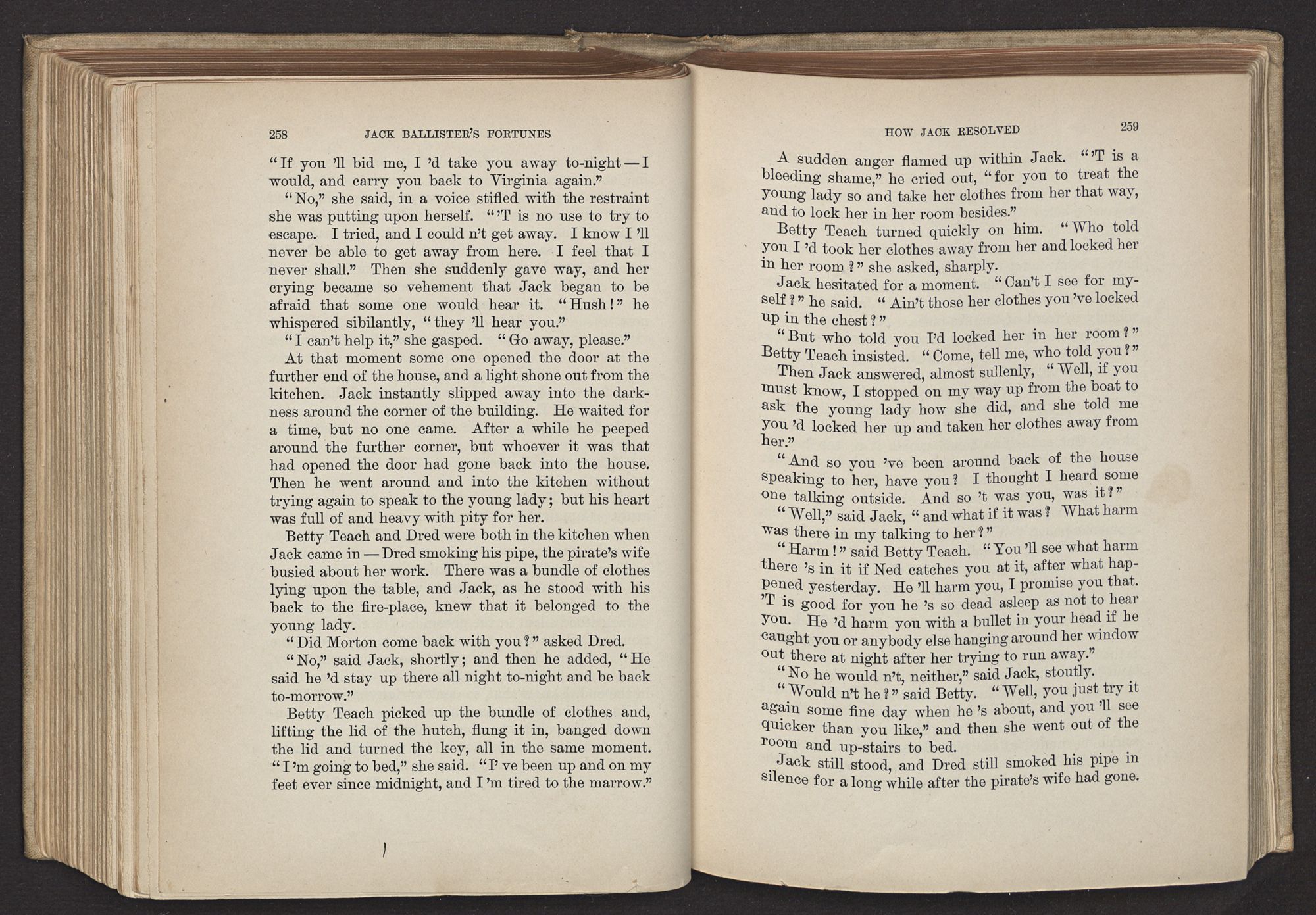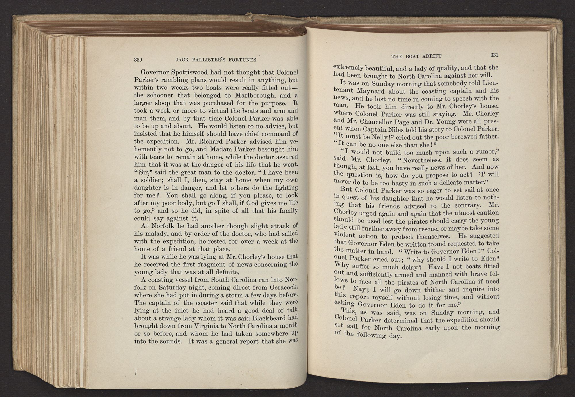 “Well,” said Jack, “’t was said down there at Bath Town,—that is, by those who came to see the pirate at his house,—’t was said that—that Mr. Richard Parker knew about Miss Nelly's having been taken away. I don't know anything about it myself, but that was what they all said. I know that Blackbeard writ three or four letters to Mr. Parker while the young lady was there, and I heard them say again and again that Mr. Parker knew that she had been taken away from home and whither she had been taken, and that he was concerned in it.”