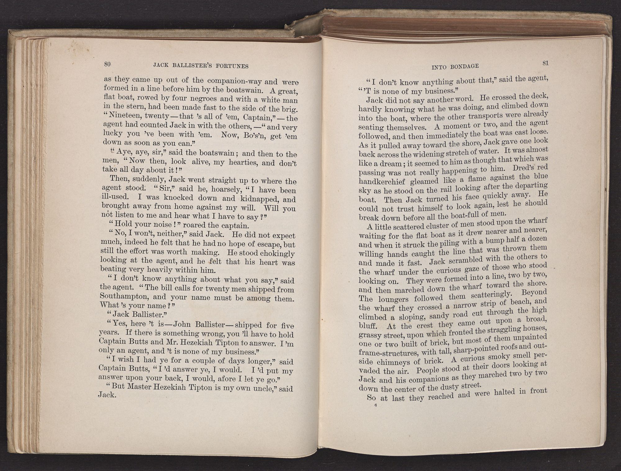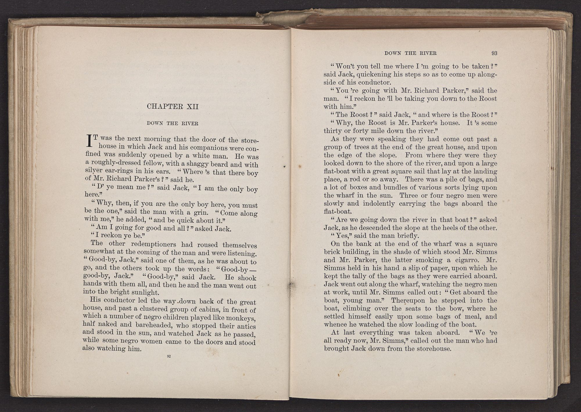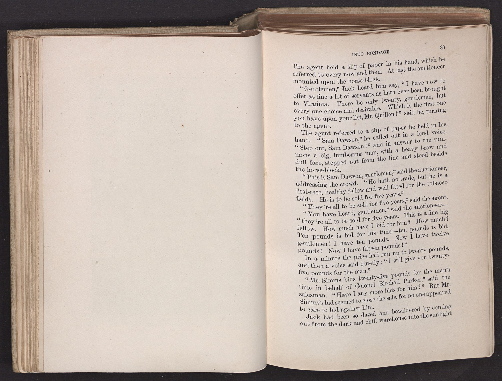 “Why, Master Tipton,” said the agent, referring to a slip of paper which he held in his hand, “there you are mightily mistook. Maybe, like enough, that man is worth more than any of ’em. He's a skilled barber and leecher, and a good man he is, and knows his trade, to be sure, and that werry well. Just you think, Master Tipton, how much he might be worth as a vally or body-servant to one of them there Virginia planters.”