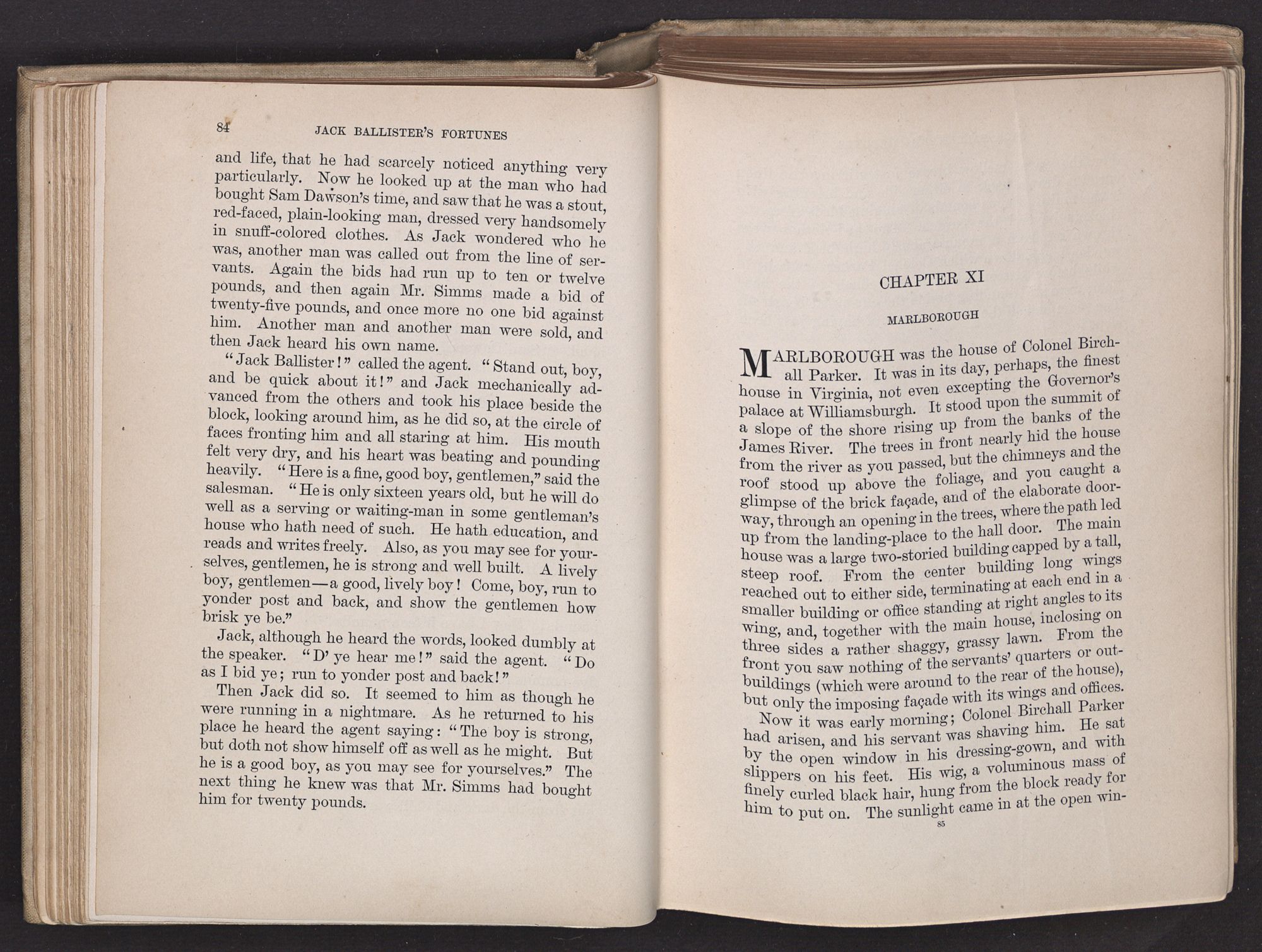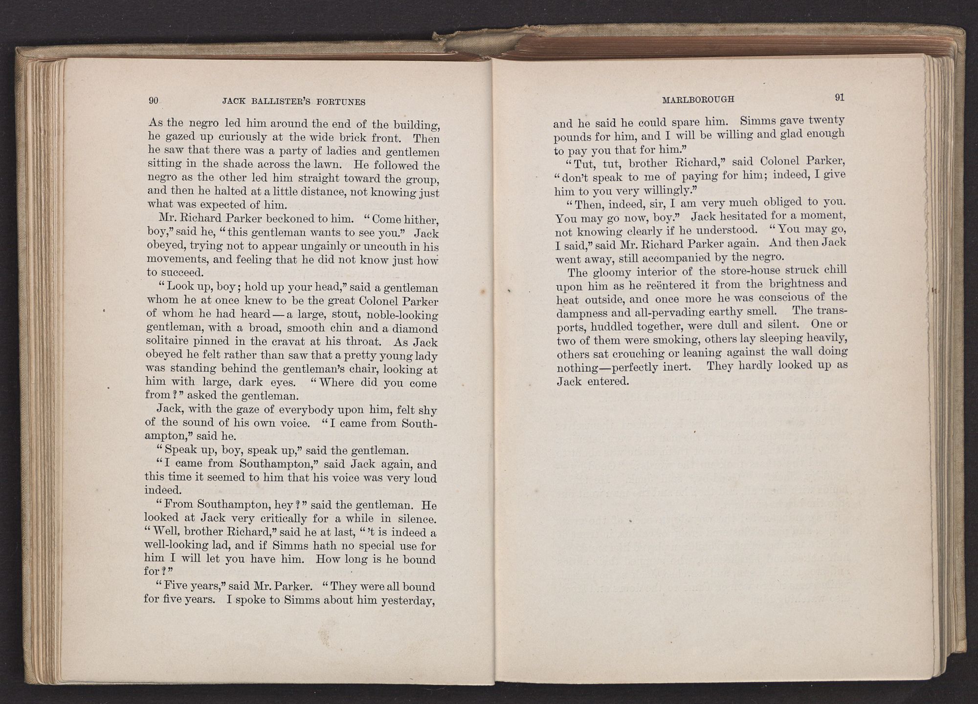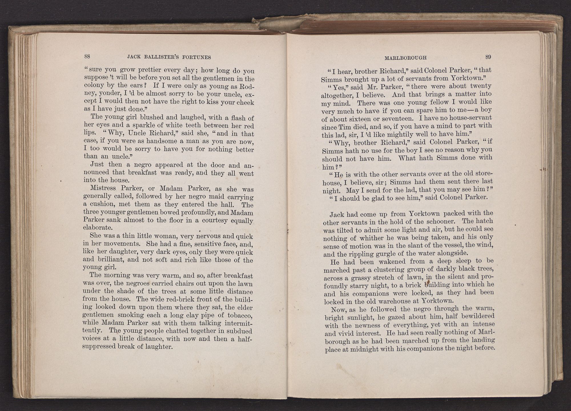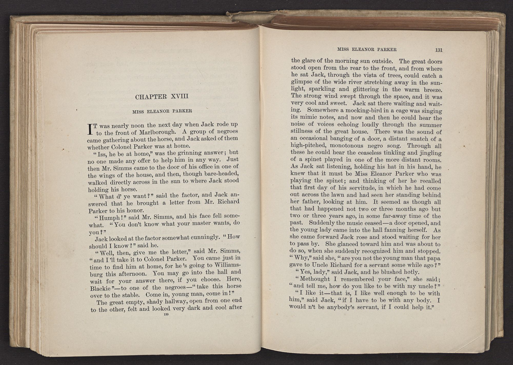 Jack was twenty years of age when his uncle Hezekiah died. The old man left a great fortune of over thirty thousand pounds, a part of which was invested in a large tract of land in Virginia. The next year Jack left college, and the year after, in the following summer, took passage to America to look after his property and to have it properly surveyed. Colonel Parker, who had been the active agent in the purchase of the land, invited him to come directly to Marlborough, and Jack gladly accepted the invitation.
