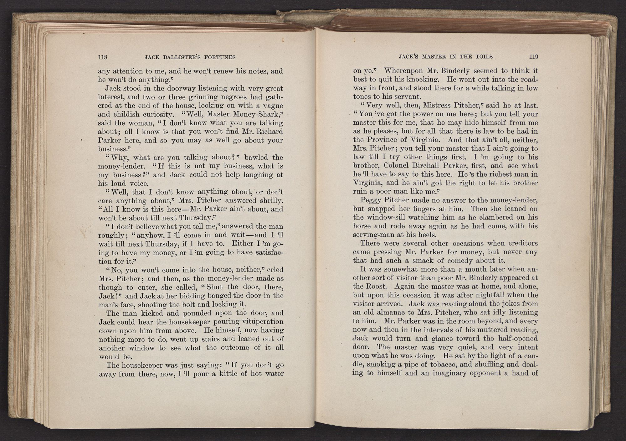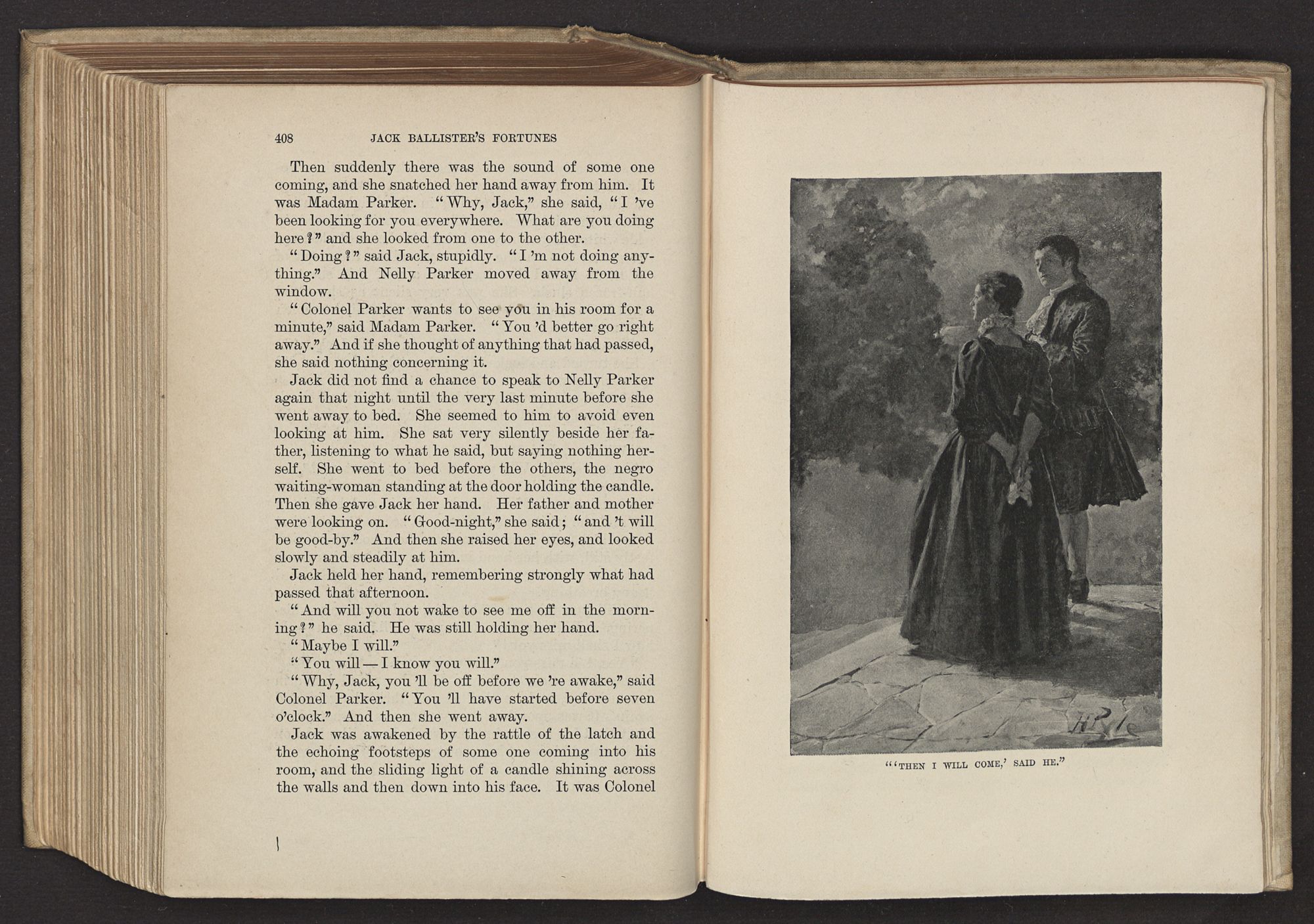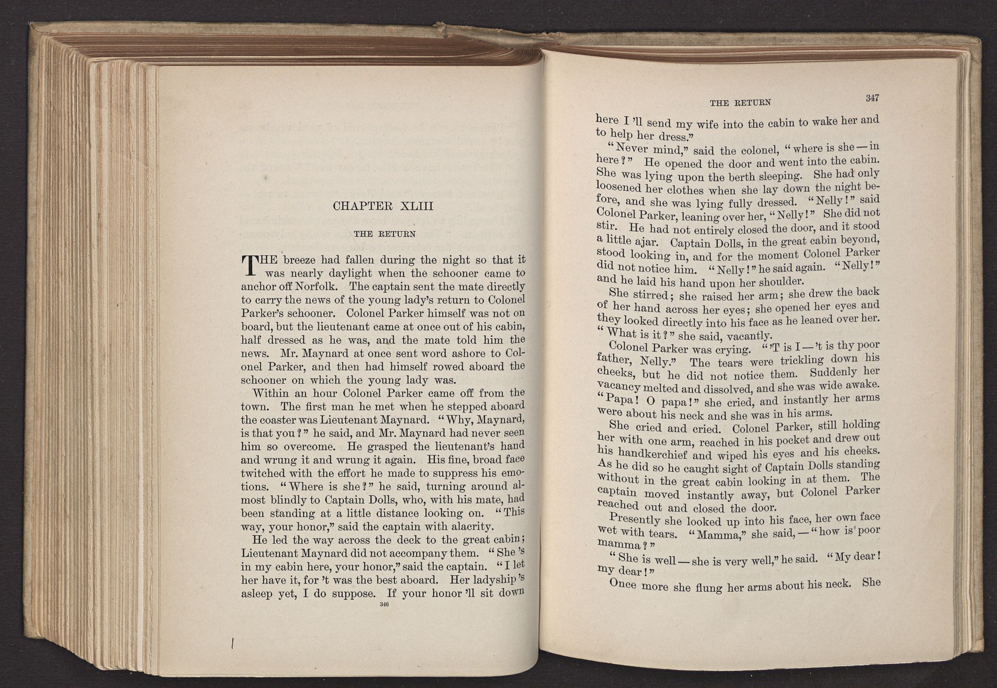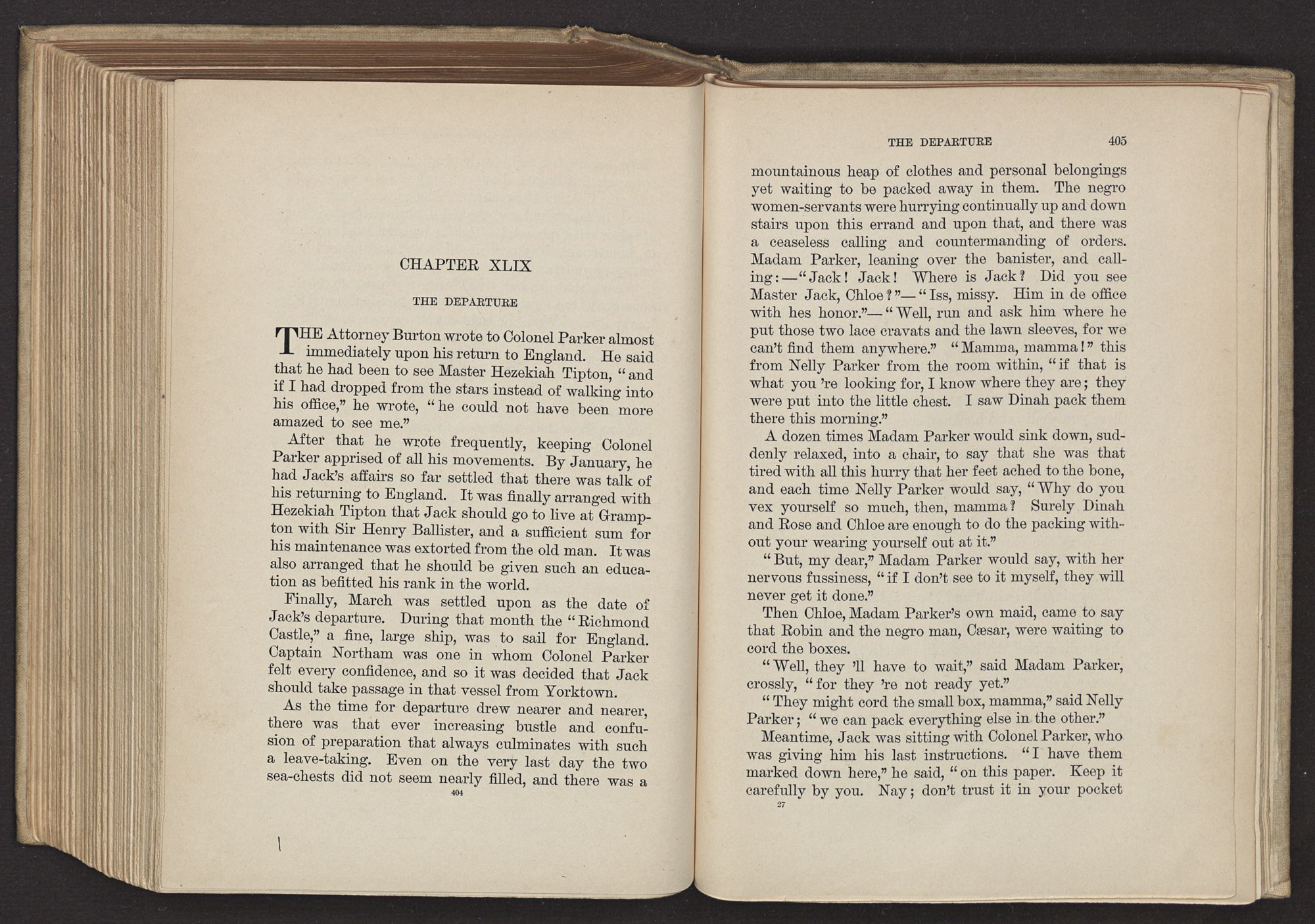 mountainous heap of clothes and personal belongings yet waiting to be packed away in them. The negro women-servants were hurrying continually up and down stairs upon this errand and upon that, and there was a ceaseless calling and countermanding of orders. Madam Parker, leaning over the banister, and calling:—“Jack! Jack! Where is Jack? Did you see Master Jack, Chloe?”—“Iss, missy. Him in de office with hes honor.”—“Well, run and ask him where he put those two lace cravats and the lawn sleeves, for we can't find them anywhere.” “Mamma, mamma!” this from Nelly Parker from the room within, “if that is what you ’re looking for, I know where they are; they were put into the little chest. I saw Dinah pack them there this morning.”
