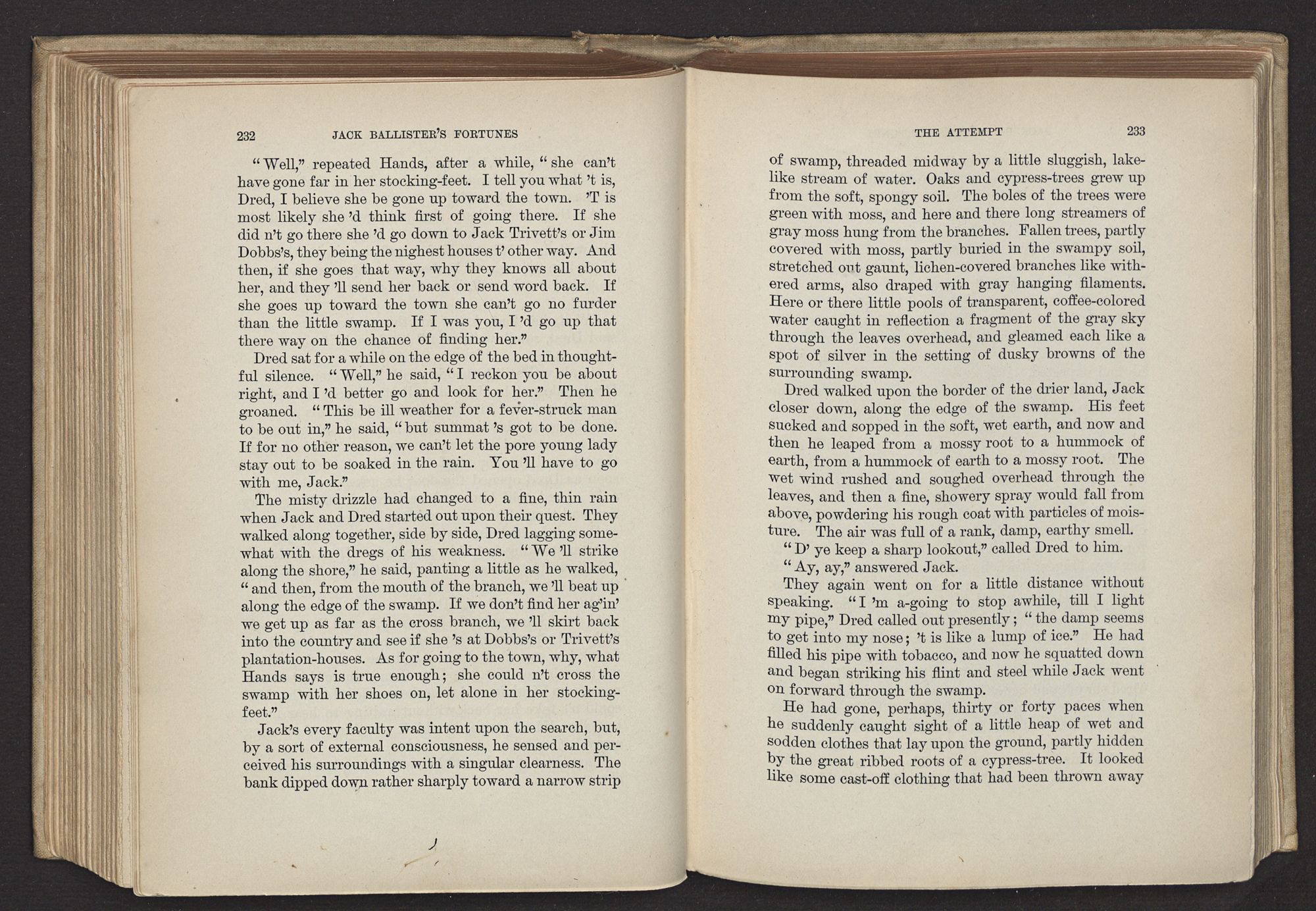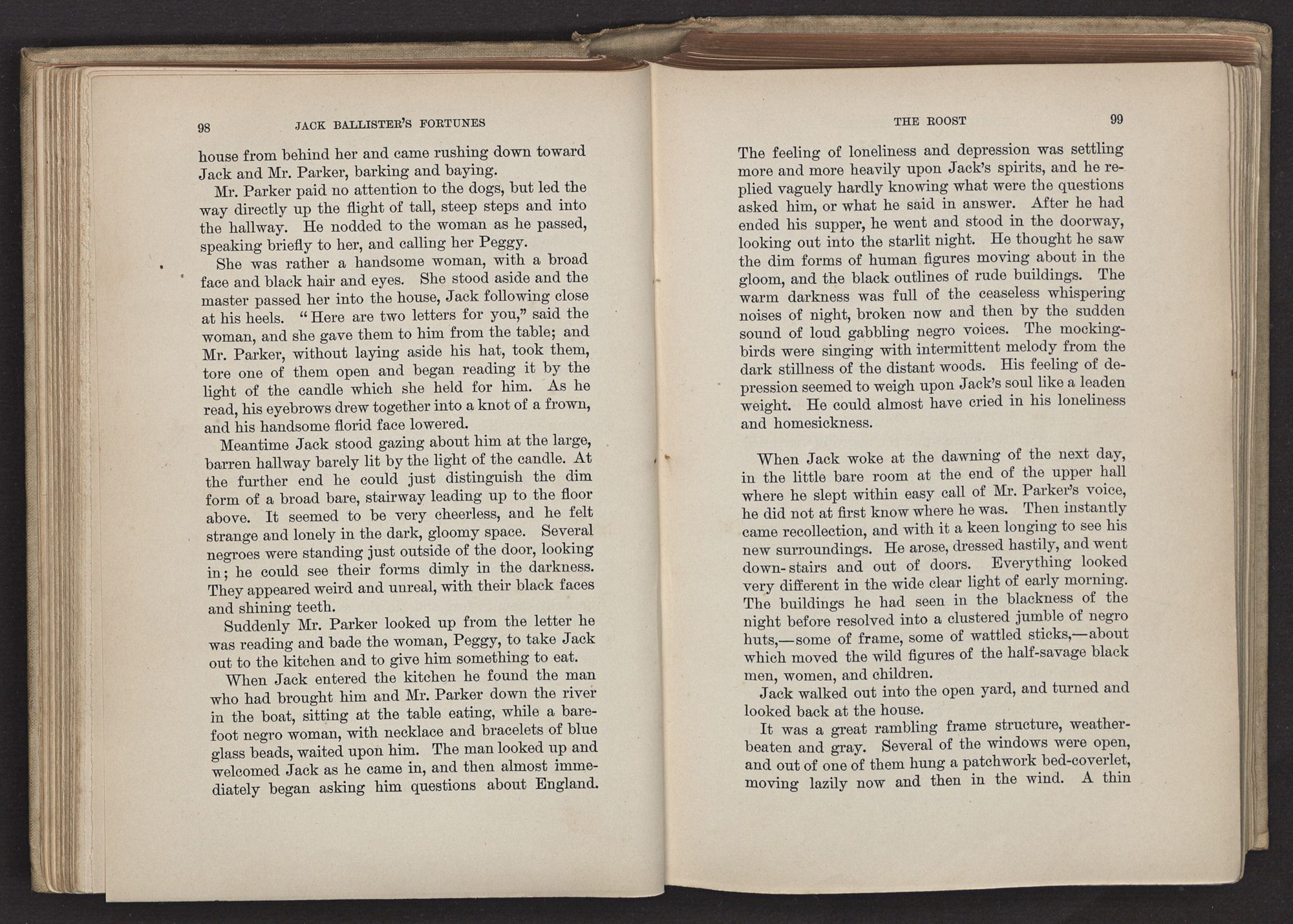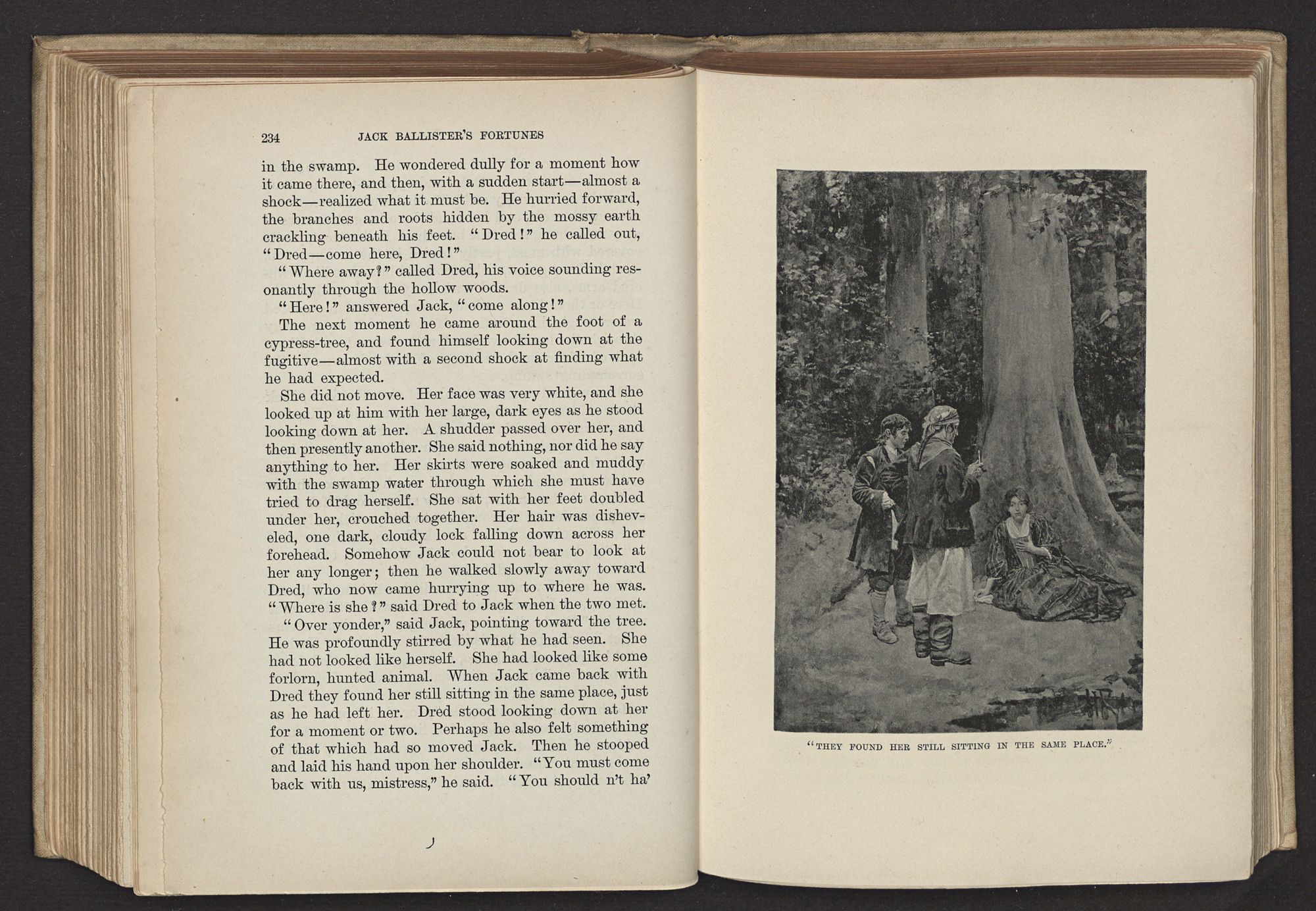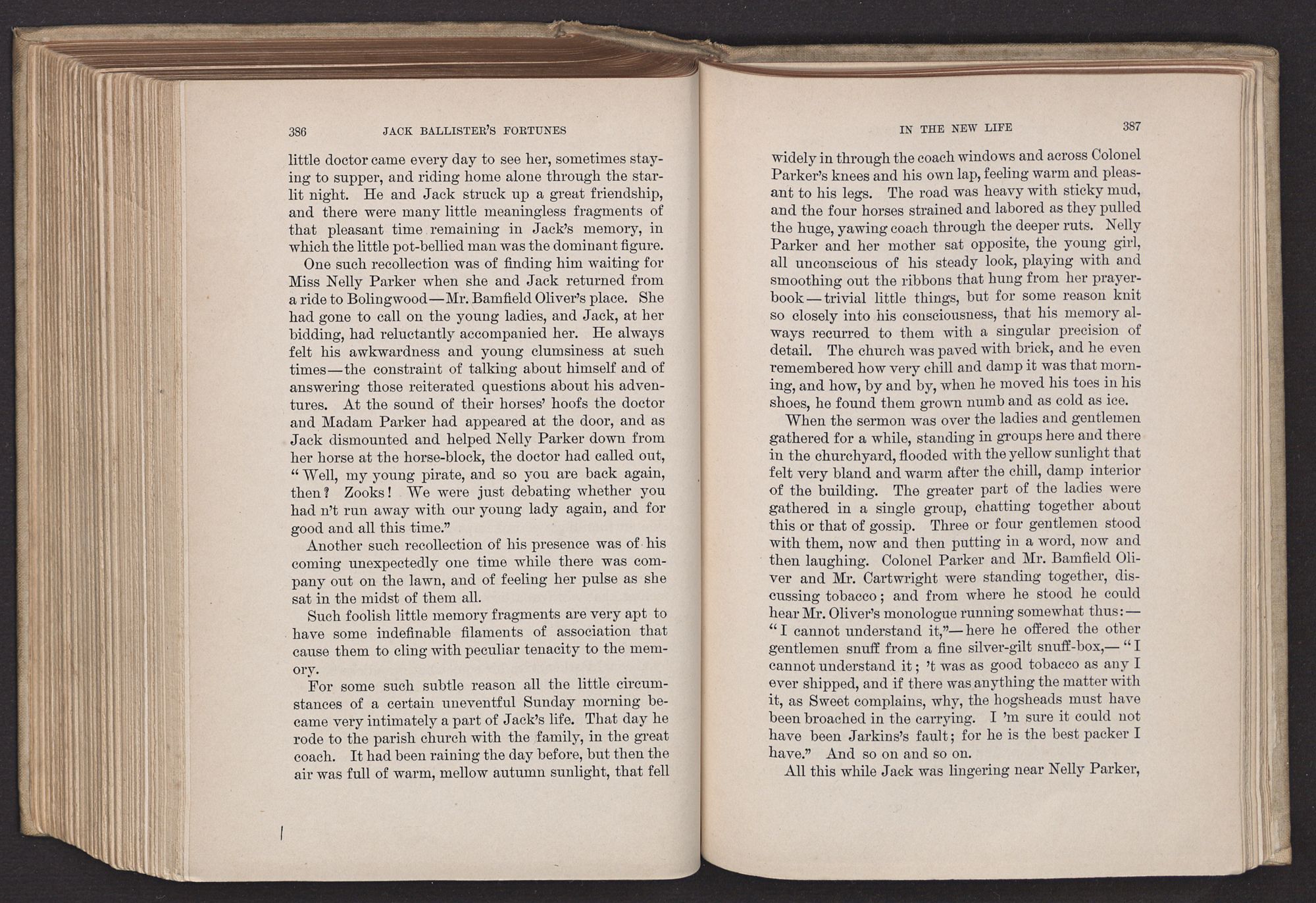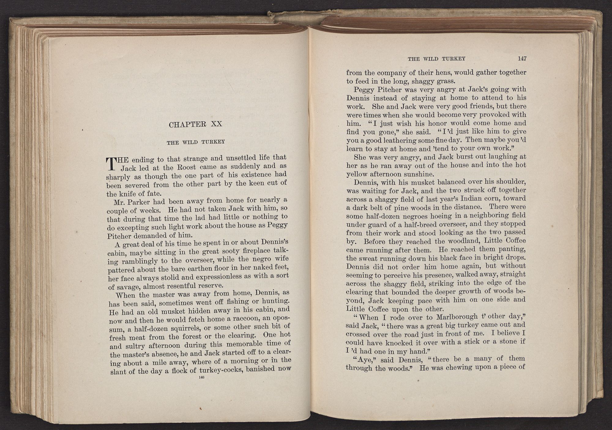 mountainous heap of clothes and personal belongings yet waiting to be packed away in them. The negro women-servants were hurrying continually up and down stairs upon this errand and upon that, and there was a ceaseless calling and countermanding of orders. Madam Parker, leaning over the banister, and calling:—“Jack! Jack! Where is Jack? Did you see Master Jack, Chloe?”—“Iss, missy. Him in de office with hes honor.”—“Well, run and ask him where he put those two lace cravats and the lawn sleeves, for we can't find them anywhere.” “Mamma, mamma!” this from Nelly Parker from the room within, “if that is what you ’re looking for, I know where they are; they were put into the little chest. I saw Dinah pack them there this morning.”