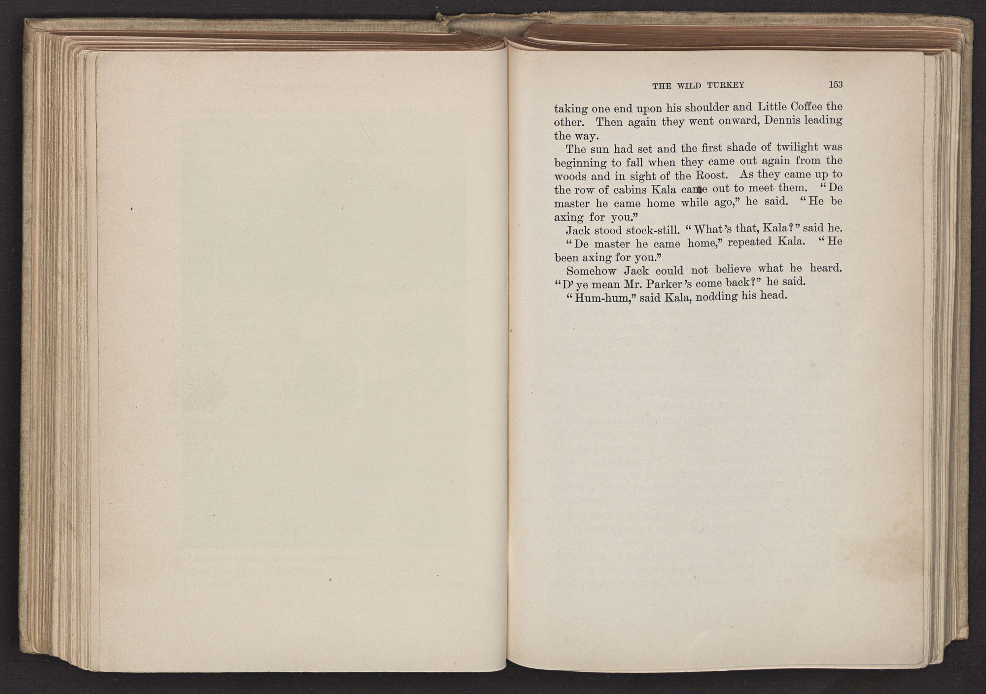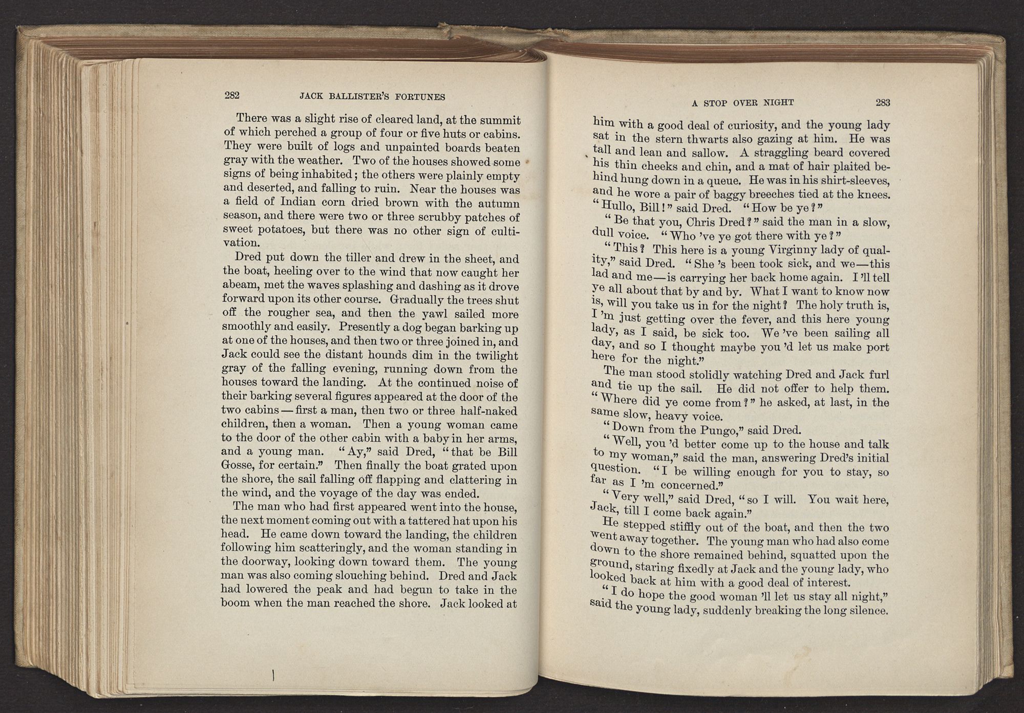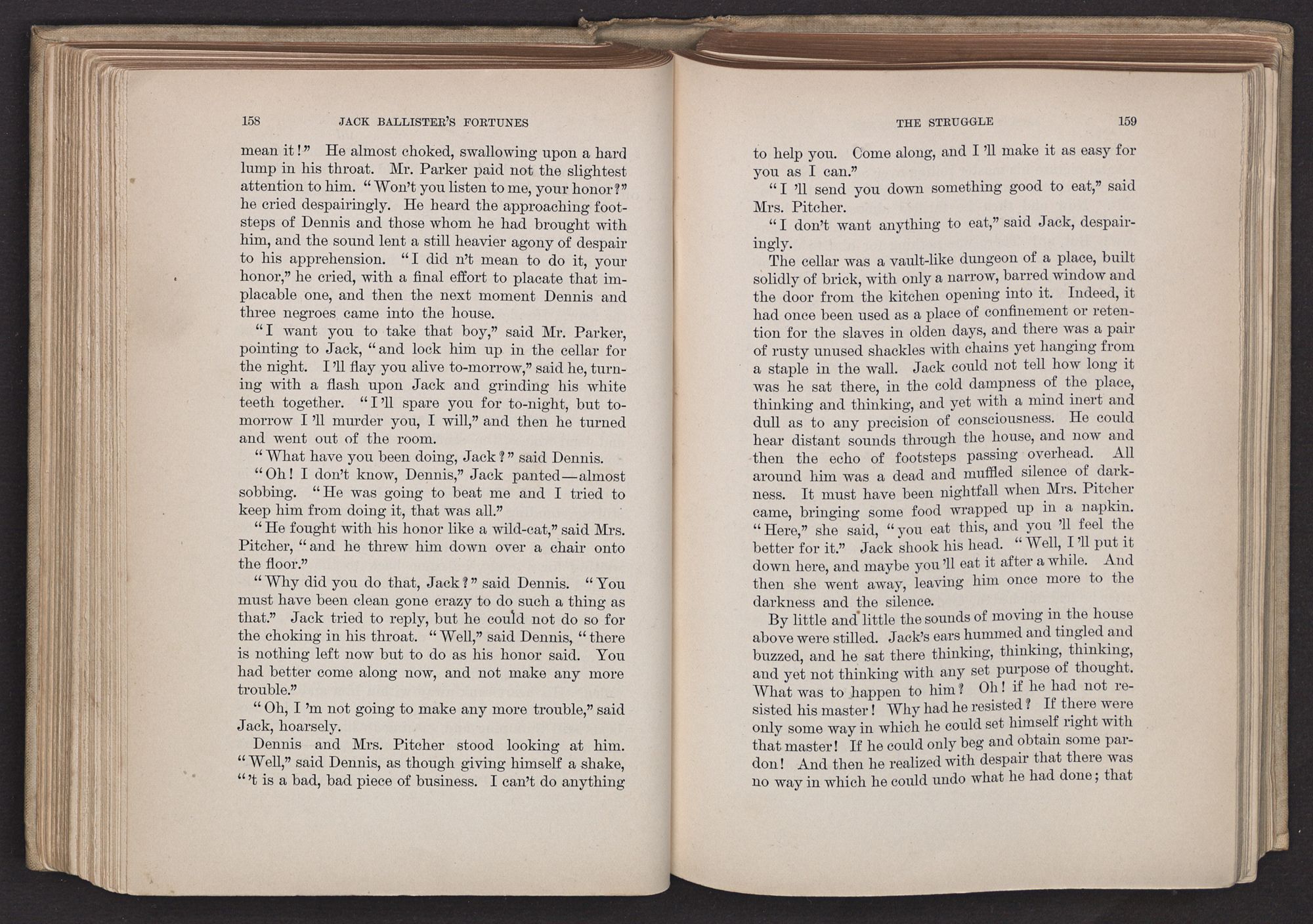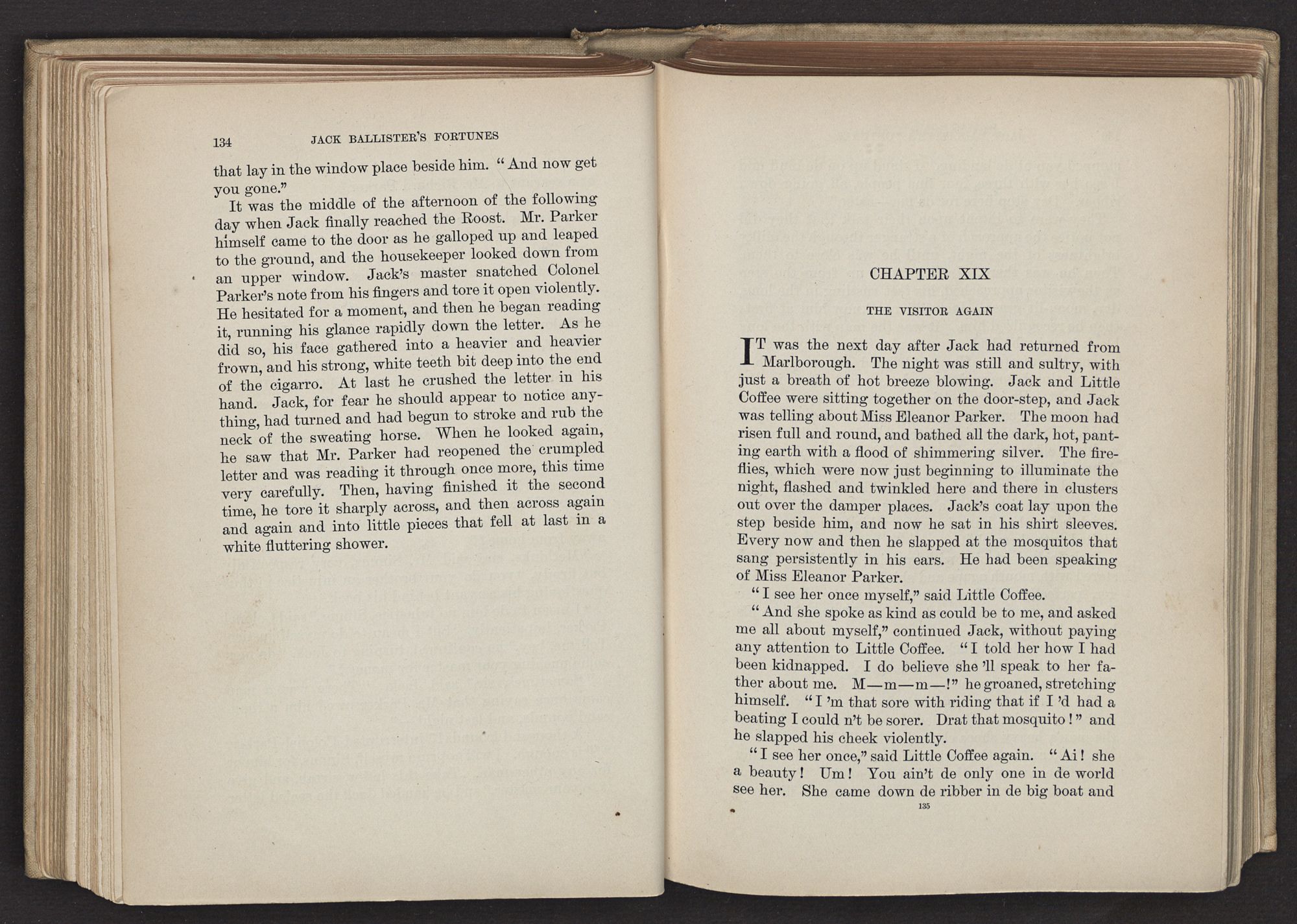 mountainous heap of clothes and personal belongings yet waiting to be packed away in them. The negro women-servants were hurrying continually up and down stairs upon this errand and upon that, and there was a ceaseless calling and countermanding of orders. Madam Parker, leaning over the banister, and calling:—“Jack! Jack! Where is Jack? Did you see Master Jack, Chloe?”—“Iss, missy. Him in de office with hes honor.”—“Well, run and ask him where he put those two lace cravats and the lawn sleeves, for we can't find them anywhere.” “Mamma, mamma!” this from Nelly Parker from the room within, “if that is what you ’re looking for, I know where they are; they were put into the little chest. I saw Dinah pack them there this morning.”