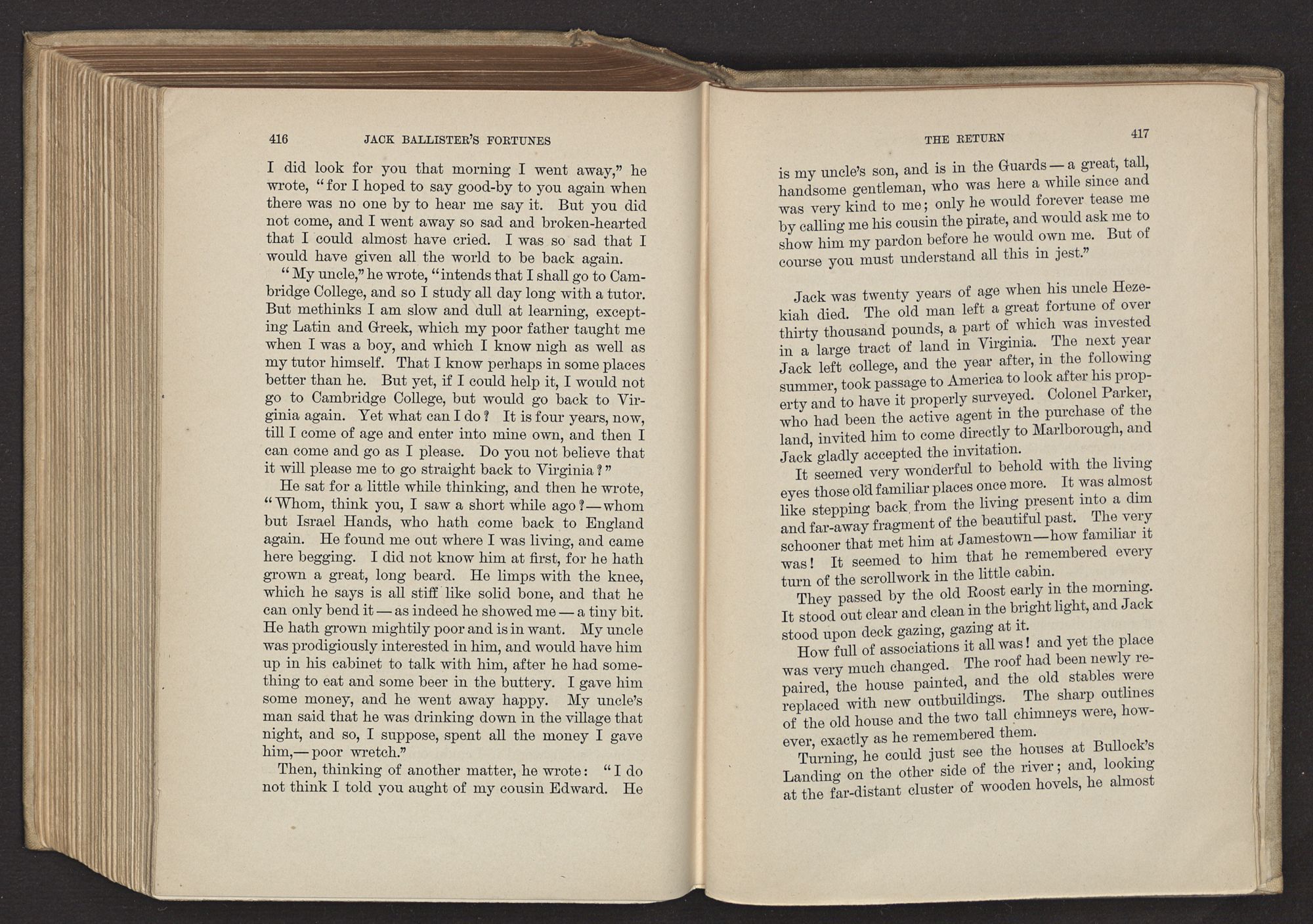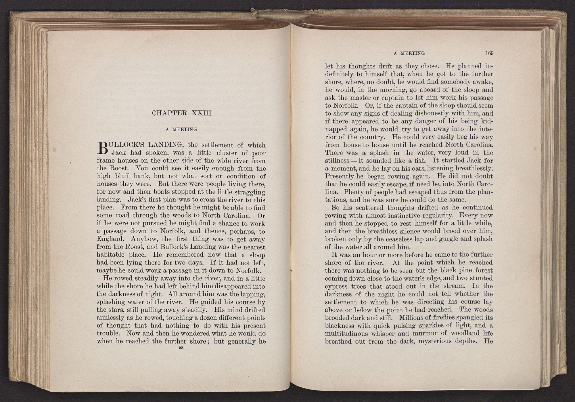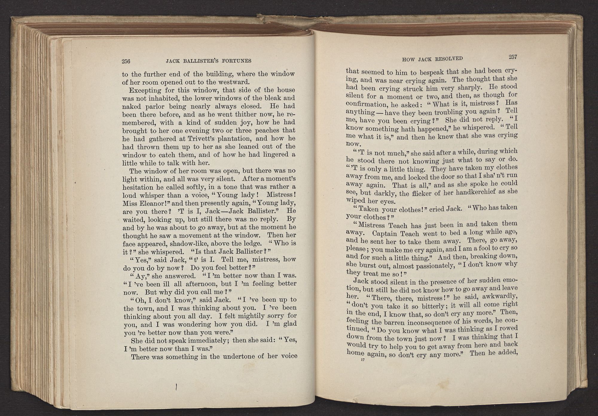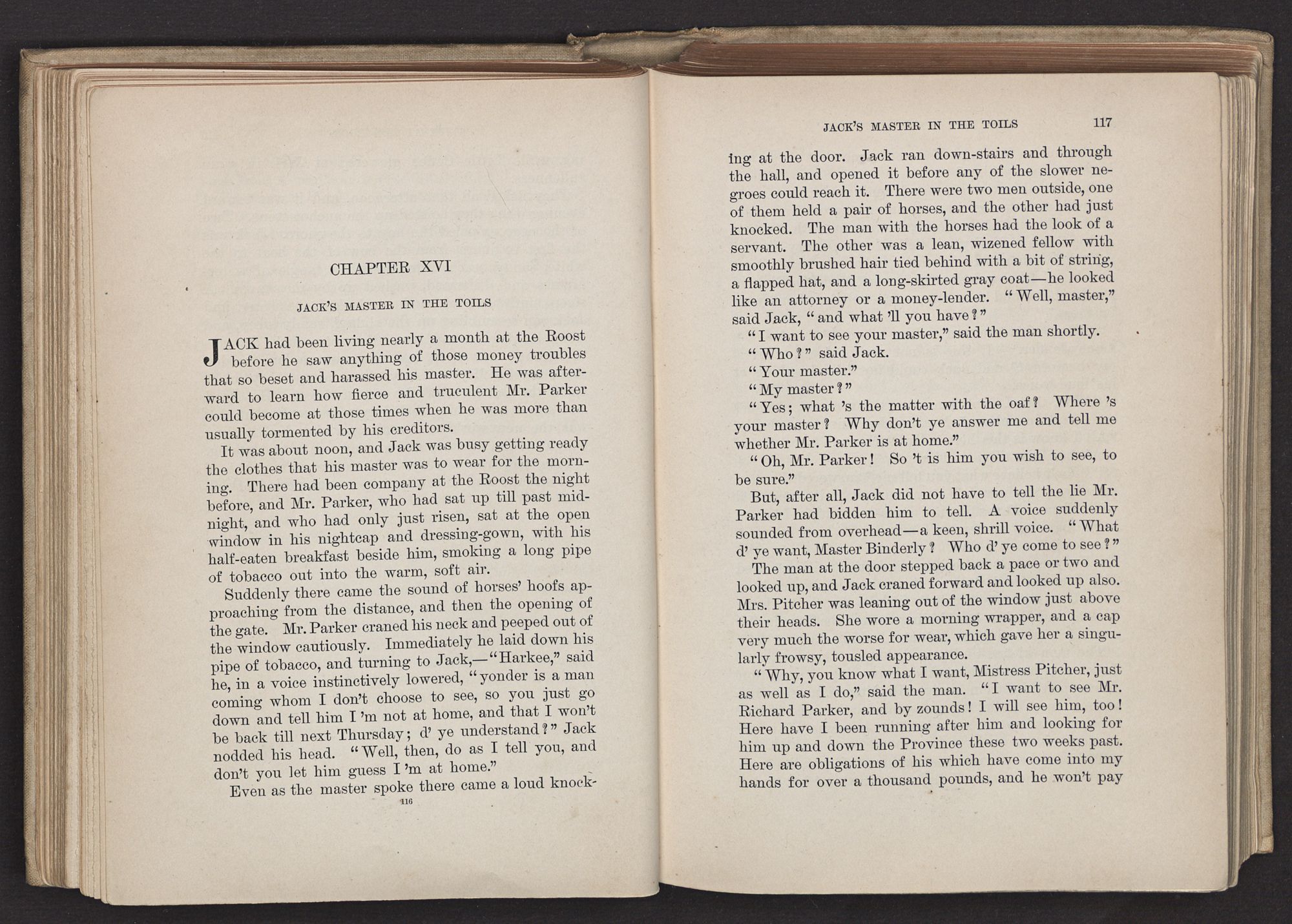 “We have had a great deal of company for the last two weeks,” said a fragment of the letter. “There was an aunt Polly from the eastern shore of the bay who brought my three cosins with her. And then my uncle James came afterward with my other cosin, a boy of thirteen and mightily spoiled, who will talk at table and give his opinion to my father, who, as you know, can bare no man's opinion but his own, much less a boy's of thirteen. But my cosins are dear, sweet girls whom I have not seen for nigh four years,” and so on and so on. “The ‘Lyme,’ ” hath come back from Jamaca, too, and so Mr. Maynard was here and brought two young gentlemen who are cadits along with him. You know them very well, for they are Master Delliplace and Master Monk. And so everything very gay. Well, I am gay, too, and do enjoy myself, but indeed think oftener than I choose to tell you of some one a great ways off in England.” And here Jack felt a strong yearning toward the writer of the innocent, inconsequent words. There seemed to be a tender pathos even in the misspelling here and there. Continuing, the letter said: “Indeed and indeed I was truly sorry that I did not wake to see you go away, for so I did entend to do, and so I ment to tell you I would do. And indeed I could have boxed Cloe's ears that she did not wake me, for so she promiessed to do. But she did not wake herself, so how could she wake me? I did not wake for a good long time after the boat had gone, and when I waked the boat was way down the river at the bend. Alack! I could have cried my eyes out. Do you beleve that? Well, I did