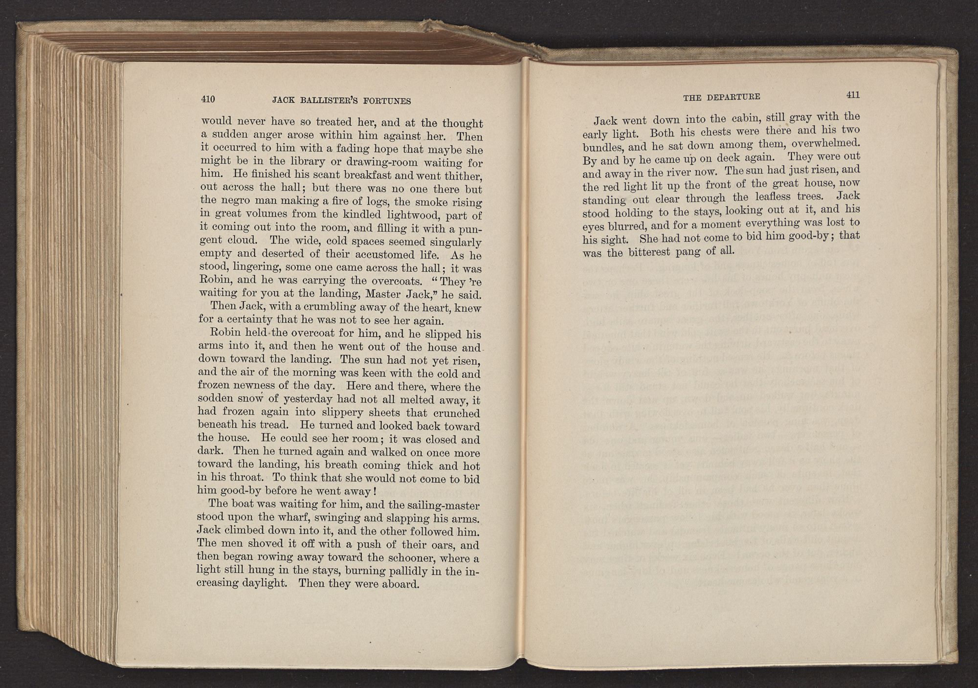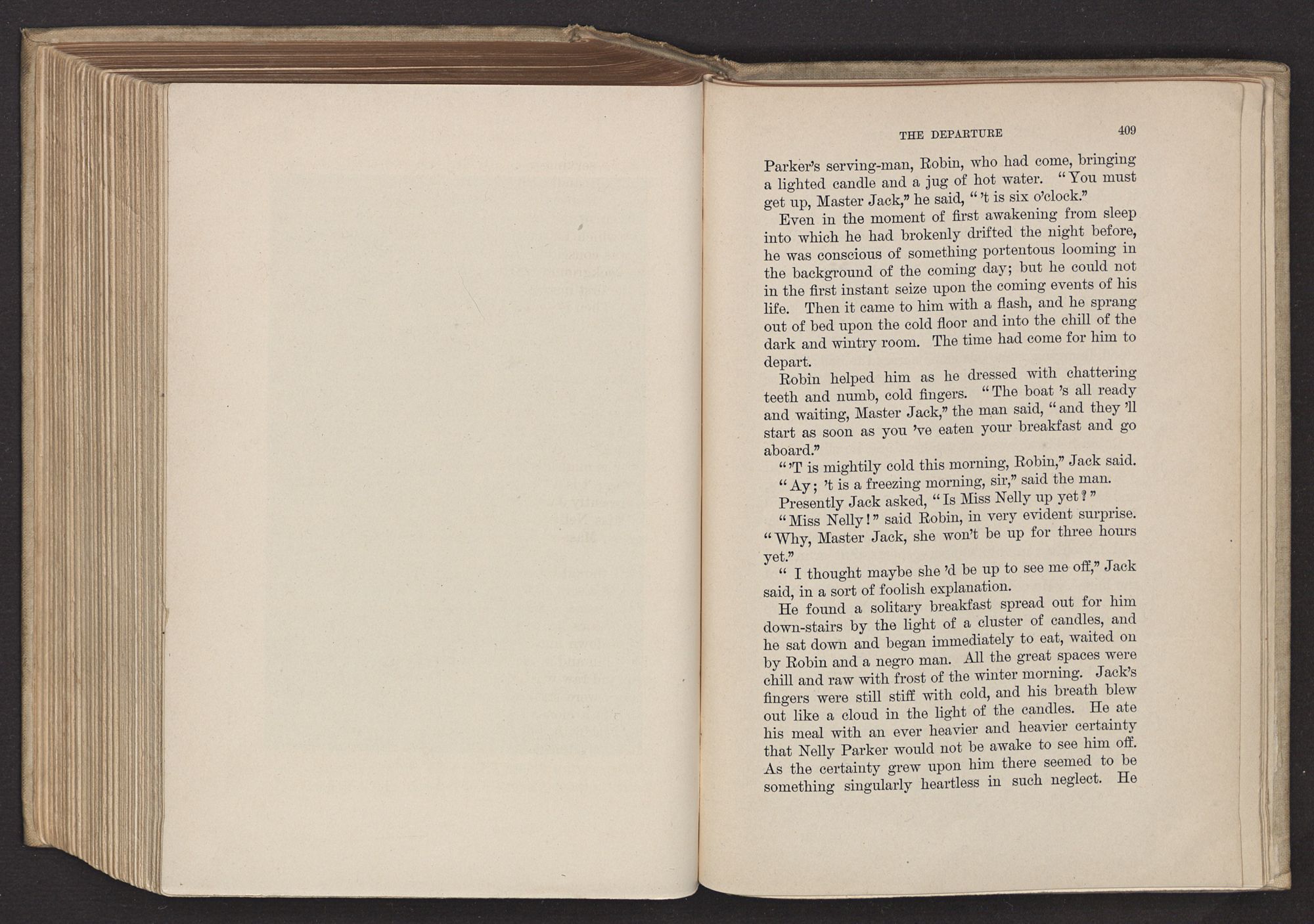 Jack went down into the cabin, still gray with the early light. Both his chests were there and his two bundles, and he sat down among them, overwhelmed. By and by he came up on deck again. They were out and away in the river now. The sun had just risen, and the red light lit up the front of the great house, now standing out clear through the leafless trees. Jack stood holding to the stays, looking out at it, and his eyes blurred, and for a moment everything was lost to his sight. She had not come to bid him good-by; that was the bitterest pang of all.