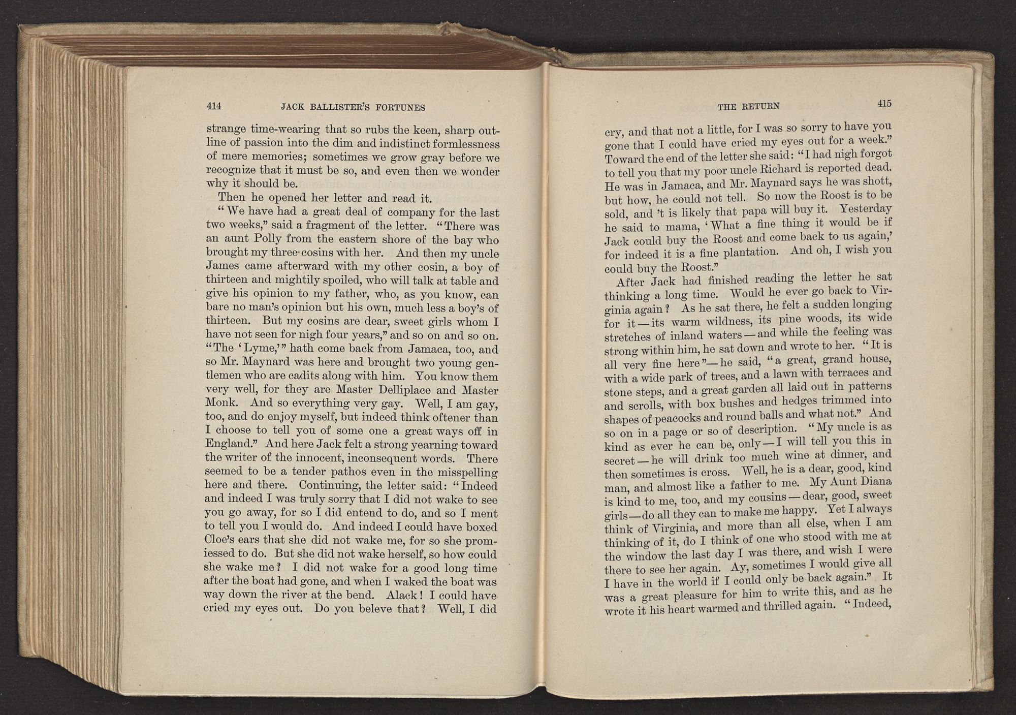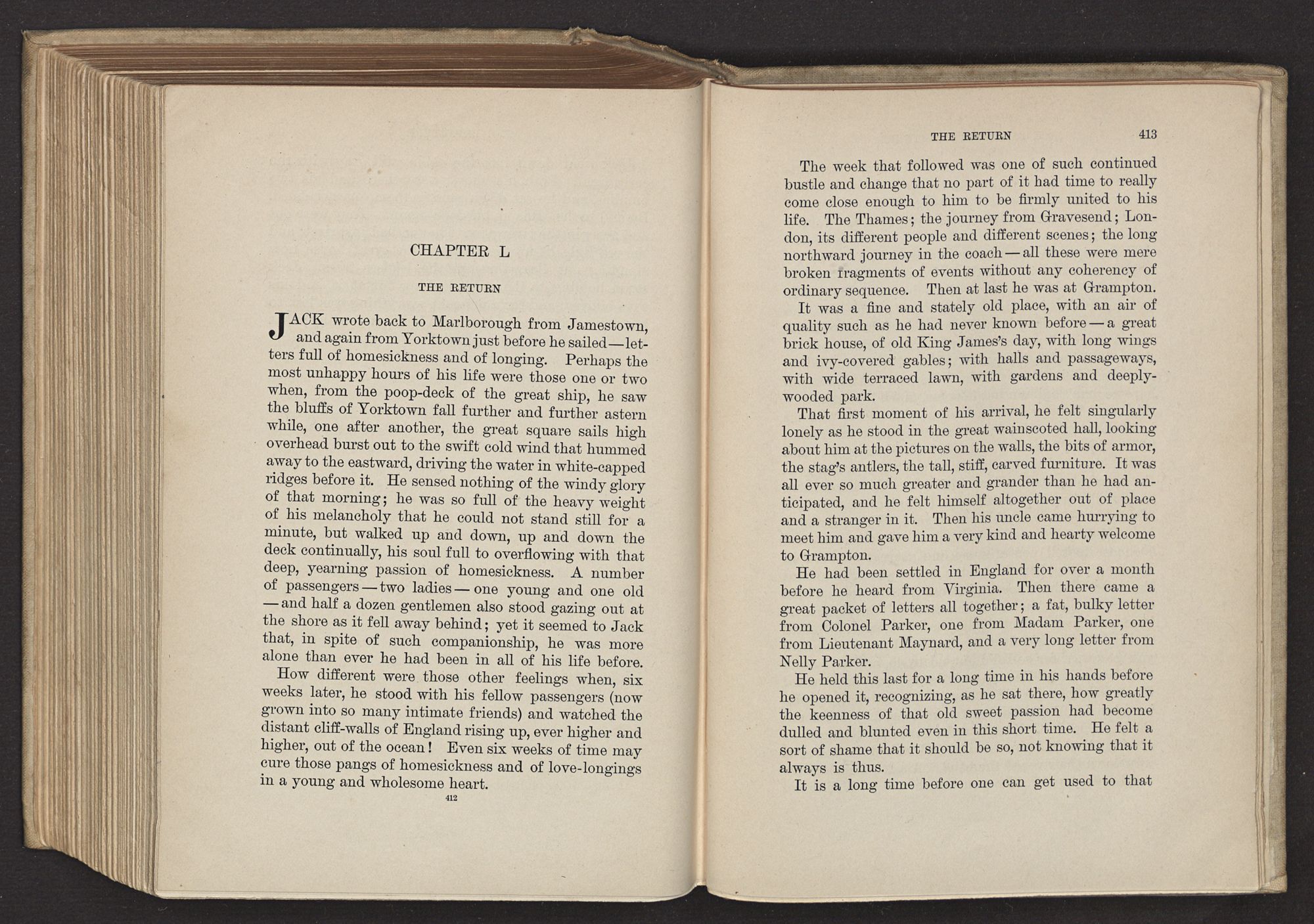 After Jack had finished reading the letter he sat thinking a long time. Would he ever go back to Virginia again? As he sat there, he felt a sudden longing for it—its warm wildness, its pine woods, its wide stretches of inland waters—and while the feeling was strong within him, he sat down and wrote to her. “It is all very fine here”—he said, “a great, grand house, with a wide park of trees, and a lawn with terraces and stone steps, and a great garden all laid out in patterns and scrolls, with box bushes and hedges trimmed into shapes of peacocks and round balls and what not.” And so on in a page or so of description. “My uncle is as kind as ever he can be, only—I will tell you this in secret—he will drink too much wine at dinner, and then sometimes is cross. Well, he is a dear, good, kind man, and almost like a father to me. My Aunt Diana is kind to me, too, and my cousins—dear, good, sweet girls—do all they can to make me happy. Yet I always think of Virginia, and more than all else, when I am thinking of it, do I think of one who stood with me at the window the last day I was there, and wish I were there to see her again. Ay, sometimes I would give all I have in the world if I could only be back again.” It was a great pleasure for him to write this, and as he wrote it his heart warmed and thrilled again. “Indeed,