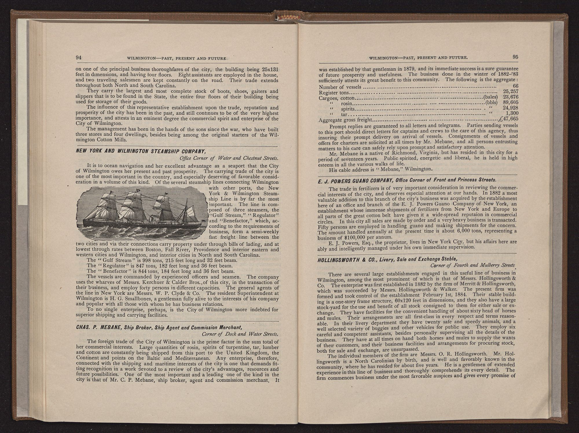 This extensive establishment was started in this city during the year 1883, since which time it has been in continuous and successful operation. The building occupied is located at No. 114 North Front street, having two floors, and is 25×190 feet in dimensions. They are supplied with all the requisite facilities for doing business successfully, and employ only first-class mechanics and exercising special care to have on hand only material of the best quality. They are enabled, therefore, to turn out work that cannot be excelled by any of their competitors in the State for strength, durability and finish. They are prepared to receive and execute promptly orders for the manufacture of every article in their line of business on the most satisfactory terms. They employ sixteen persons and keep on hand a stock of carriages, harness, &c., of an average value of $14,000. While their trade is very large locally, they also have numerous customers throughout both North and South Carolina, their annual transactions aggregating from $30,000 to $40,000. The individual members of the firm are Messrs. R. P. McDougall and H. M. Bowden. The former is a Canadian by birth, but has resided here for twelve years; the latter is a native of this city. Each member of the firm is an active, enterprising business man, and occupies a prominent position in the industrial and mercantile circles of this community. Their enterprise is a most creditable and useful one, in every way deserving of the extended patronage and consideration of the public.