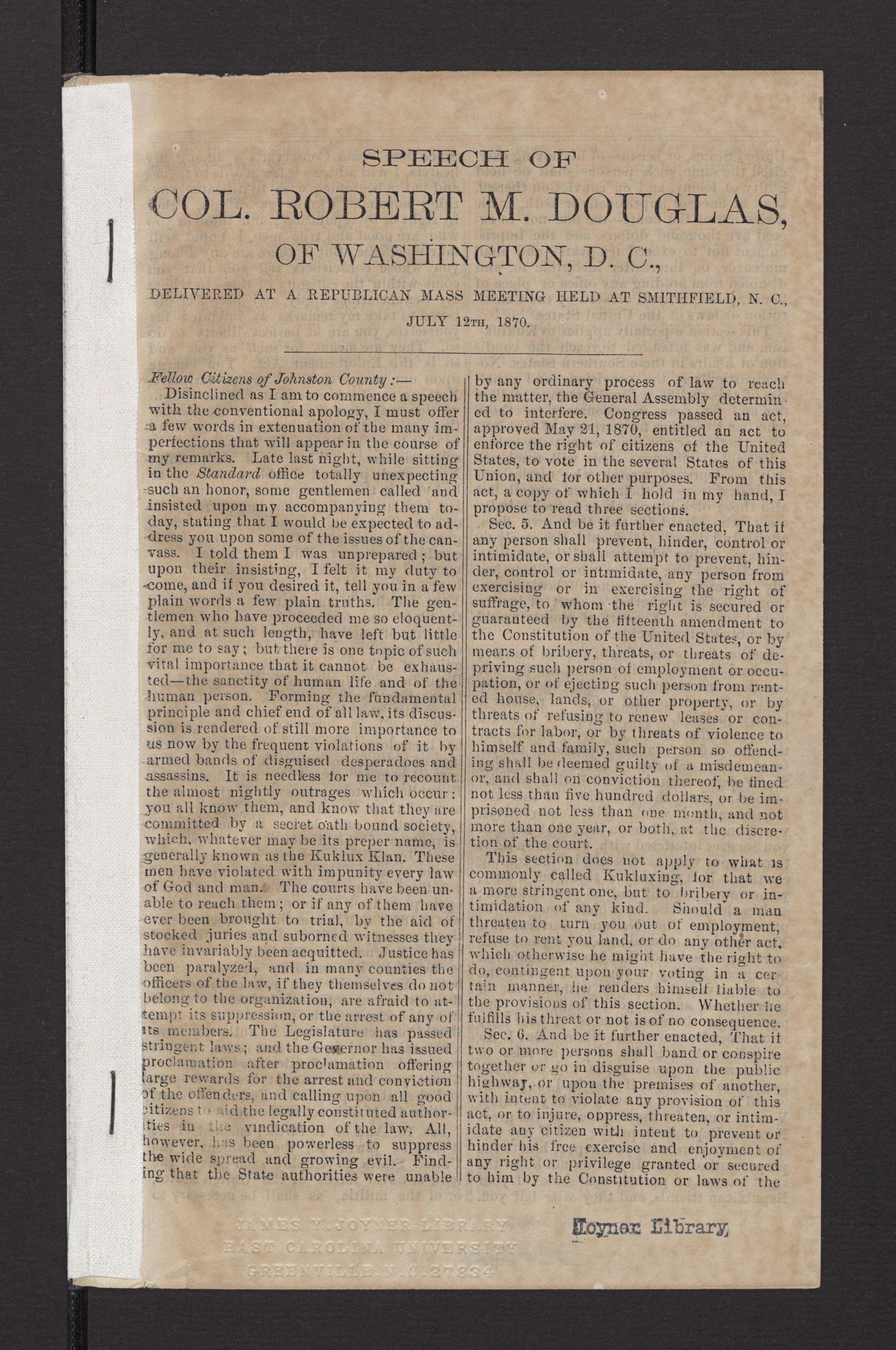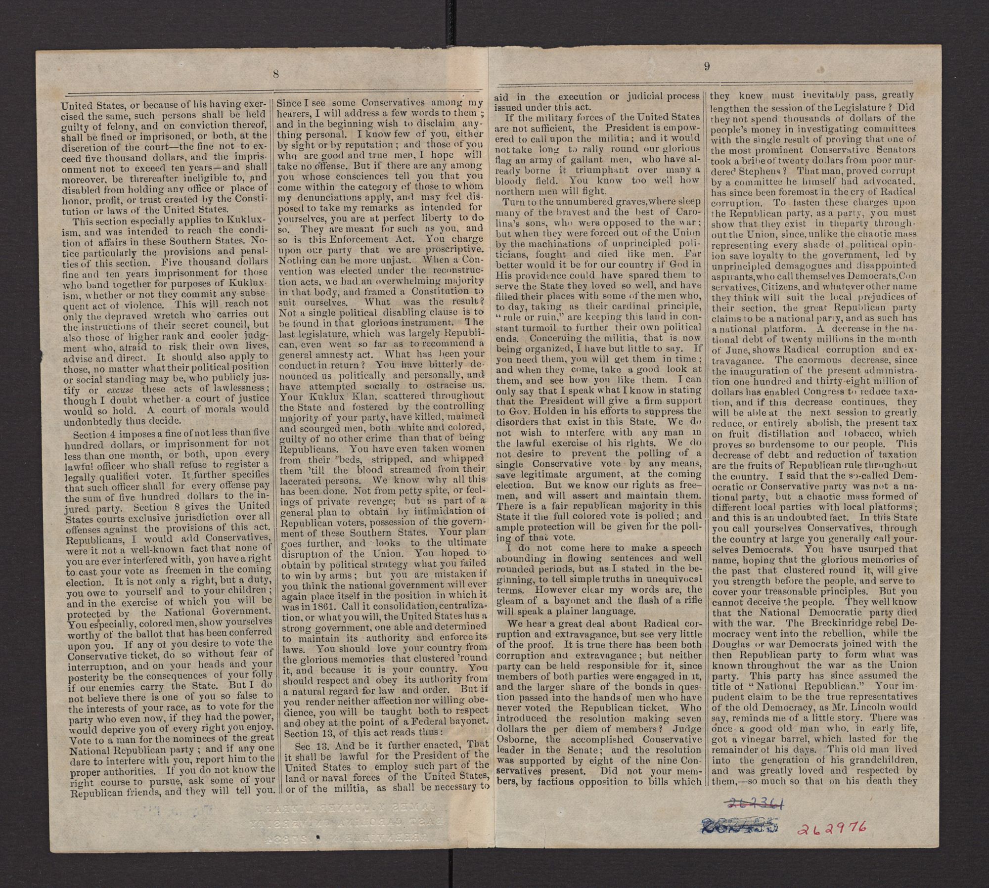Section 4 imposes a fine of not less than five hundred dollars, or imprisonment for not less than one month, or both, upon every lawful officer who shall refuse to register a legally qualified voter. It further specifies that such officer shall for every offense pay the sum of five hundred dollars to the injured party. Section 8 gives the United States courts exclusive jurisdiction over all offenses against the provisions of this act. Republicans, I would add Conservatives, were it not a well-known fact that none of you are ever interfered with, you have a right to cast your vote as freemen in the coming election. It is not only a right, but a duty, you owe to yourself and to your children; and in the exercise of which you will be protected by the National Government. You especially, colored men, show yourselves worthy of the ballot that has been conferred upon you. If any of you desire to vote the Conservative ticket, do so without fear of interruption, and on your heads and your posterity be the consequences of your folly if our enemies carry the State. But I do not believe there is one of your so false to the interests of your race, as to vote for the party who even now, if they had the power, would deprive you of every right you enjoy. Vote to a man for the nominees of the great National Republican party; and if any one dare to interfere with you, report him to the proper authorities. If you do not know the right course to pursue, ask some of your Republican friends, and they will tell you. Since I see some Conservatives among my hearers, I will address a few words to them; and in the beginning wish to disclaim anything personal. I know few of you, either by sight or by reputation; and those of you who are good and true men, I hope will take no offense. But if there are any among you whose consciences tell you that you come within the category of those to whom my denunciations apply, and may feel disposed to take my remarks as intended for yourselves, you are at perfect liberty to do so. They are meant for such as you, and so is this Enforcement Act. You charge upon our party that we are proscriptive. Nothing can be more unjust. When a Convention was elected under the reconstruction acts, we had an overwhelming majority in that body, and framed a Constitution to suit ourselves. What was the result? Not a single political disabling clause is to be found in that glorious instrument. The last legislature, which was largely Republican, even went so far as to recommend a general amnesty act. What has been your conduct in return? You have bitterly denounced us politically and personally, and have attempted socially to ostracise us. Your Kuklux Klan, scattered throughout the State and fostered by the controlling majority of your party, have killed, maimed and scourged men, both white and colored, guilty of no other crime than that of being Republicans. You have even taken women from their beds, stripped, and whipped them ’till the blood streamed from their lacerated persons. We know why all this has been done. Not from petty spite, or feelings of private revenge; but as part of a general plan to obtain by intimidation of Republican voters, possession of the government of these Southern States. Your plan goes further, and looks to the ultimate disruption of the Union. You hoped to obtain by political strategy what you failed to win by arms; but you are mistaken if you think the national government will ever again place itself in the position in which it was in 1861. Call it consolidation, centralization, or what you will, the United States has a strong government, one able and determined to maintain its authority and enforce its laws. You should love your country from the glorious memories that clustered ’round it, and because it is your country. You should respect and obey its authority from a natural regard for law and order. But if you render neither affection nor willing obedience, you will be taught both to respect and obey at the point of a Federal bayonet. Section 13, of this act reads thus: