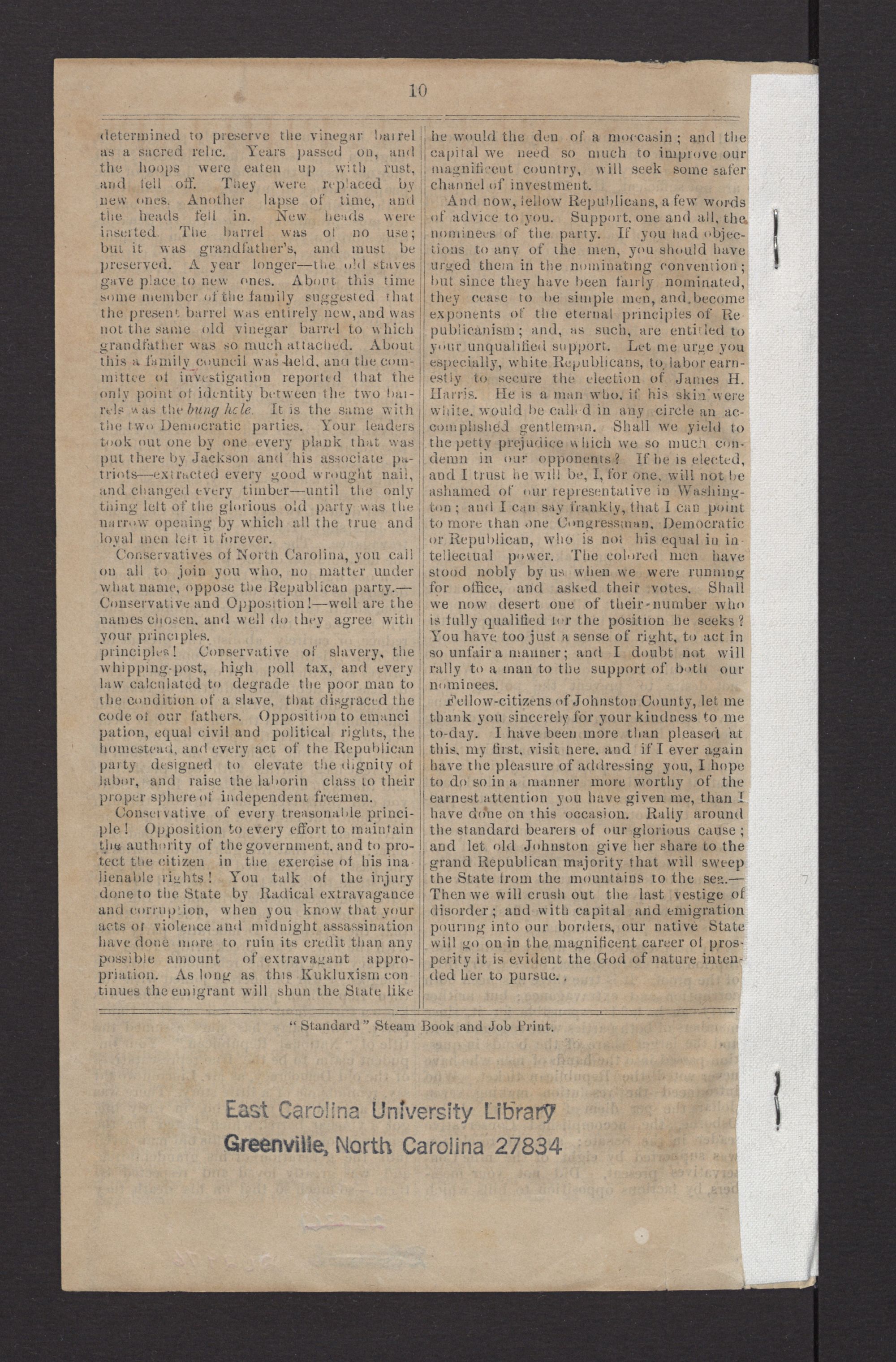 Fellow-citizens of Johnston County, let me thank you sincerely for your kindness to me to-day. I have been more than pleased at this, my first, visit here, and if I ever again have the pleasure of addressing you, I hope to do so in a manner more worthy of the earnest attention you have given me, than I have done on this occasion. Rally around the standard bearers of our glorious cause; and let old Johnston give her share to the grand Republican majority that will sweep the State from the mountains to the sea.—Then we will crush out the last vestige of disorder; and with capital and emigration pouring into our borders, our native State will go on in the magnificent career of prosperity it is evident the God of nature intended her to pursue.