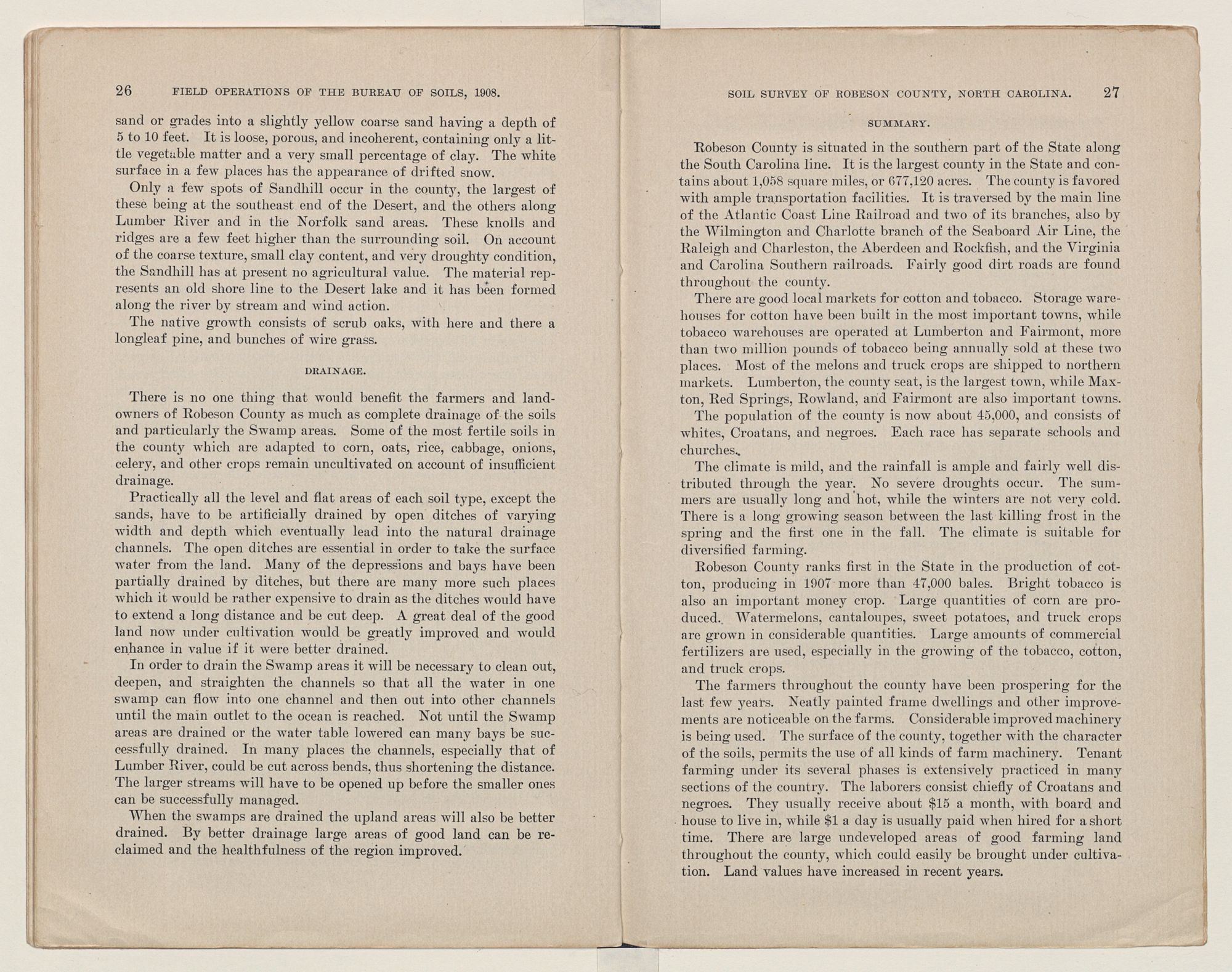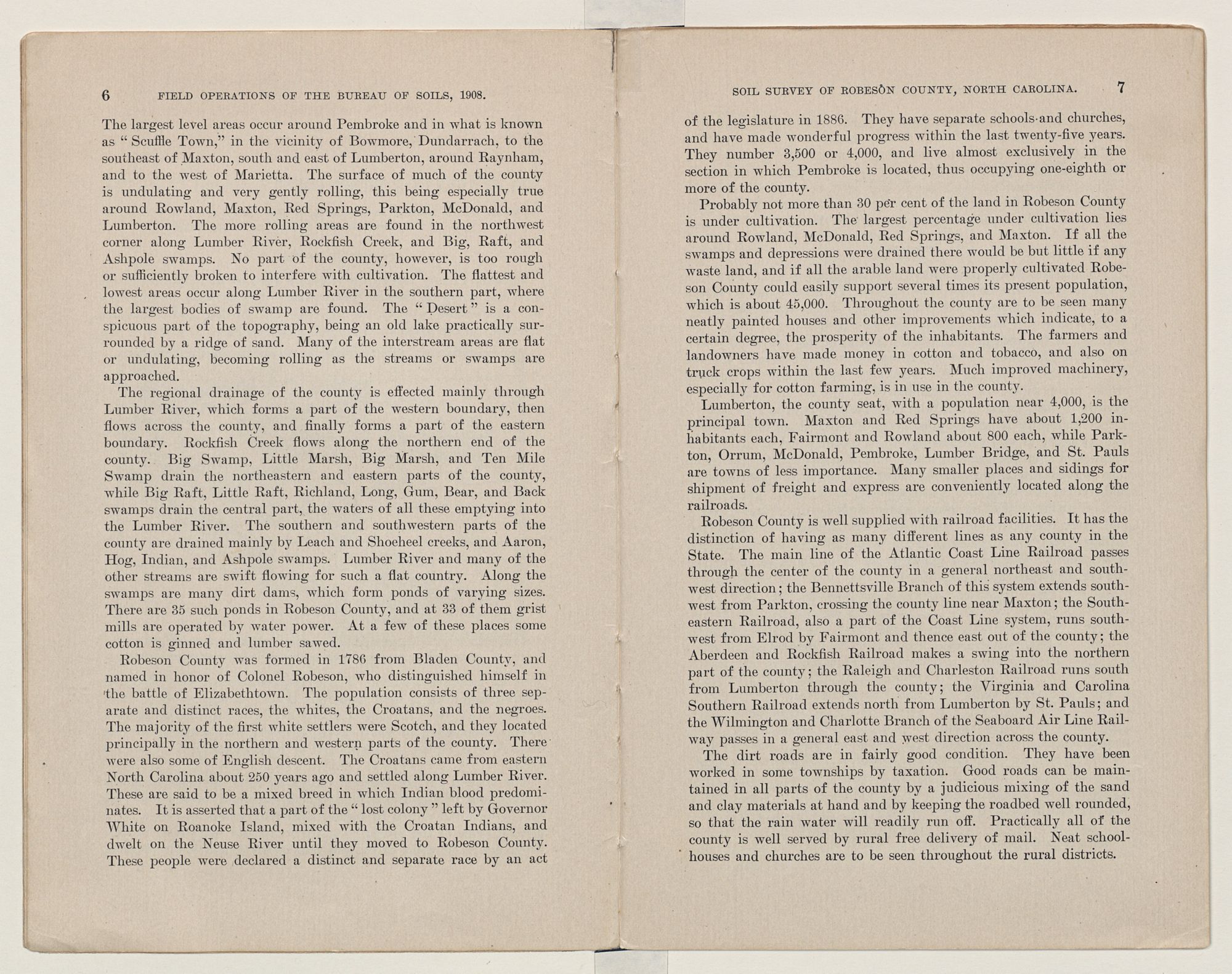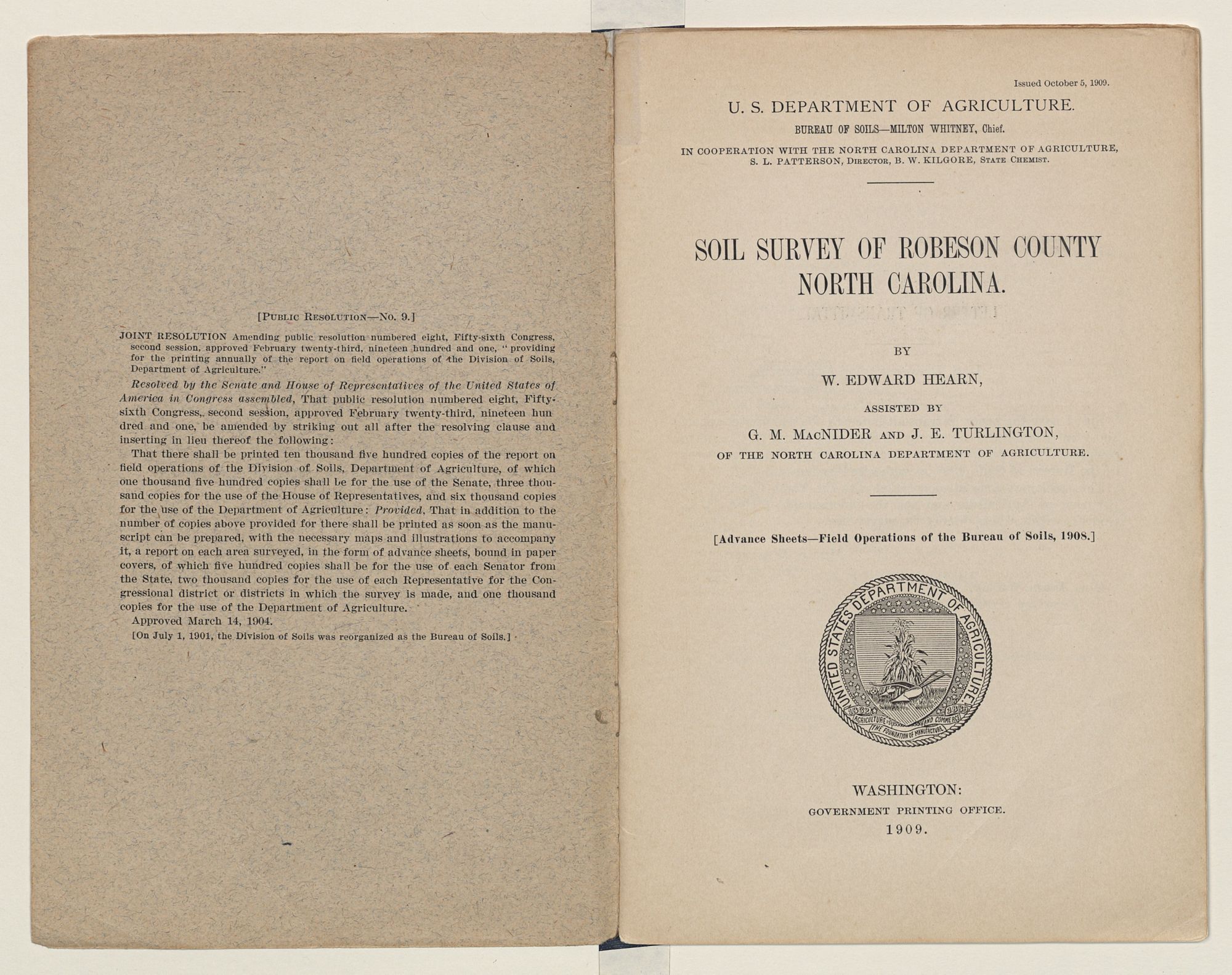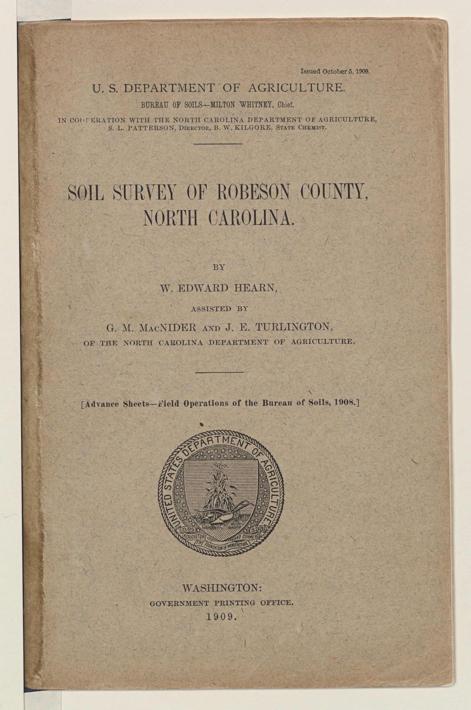 Soil survey of Robeson County, North Carolina. By W. Edward Hearn [and others] Washington : U.S. Government Printing Office, 1909. 28 p. 2 maps (1 fold.) 23 cm. (Advance Sheets - Field operations of the Bureau of Soils, 1908)