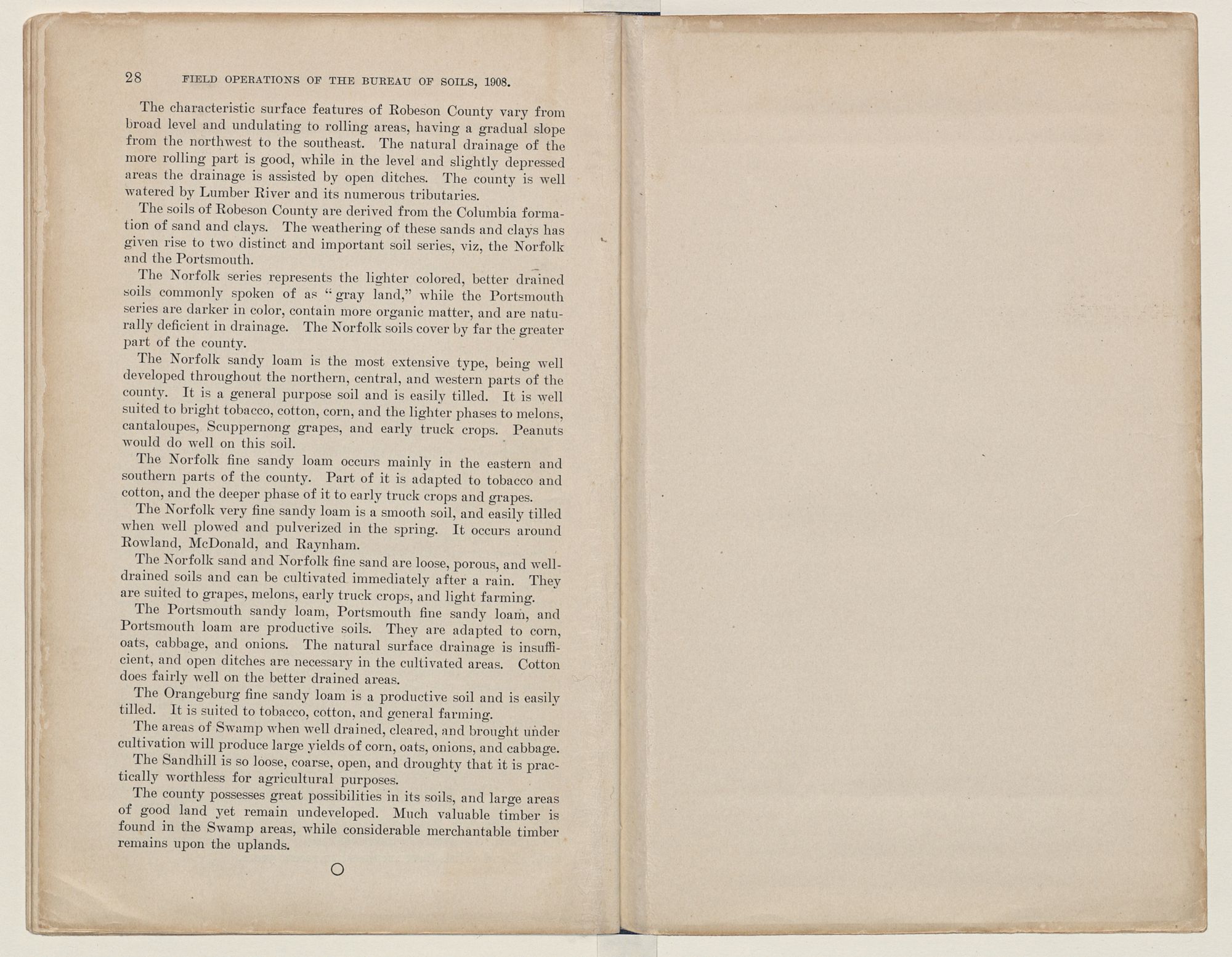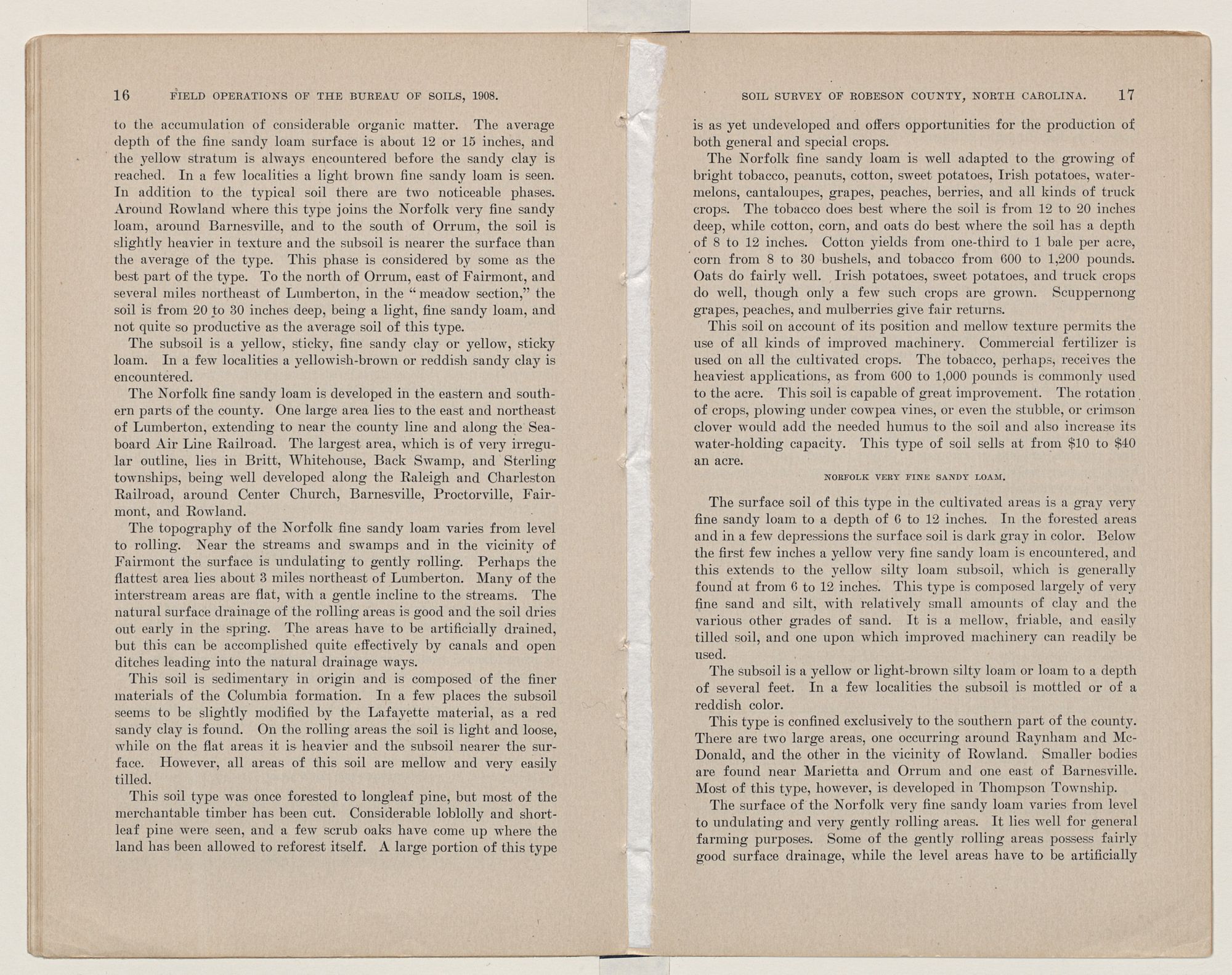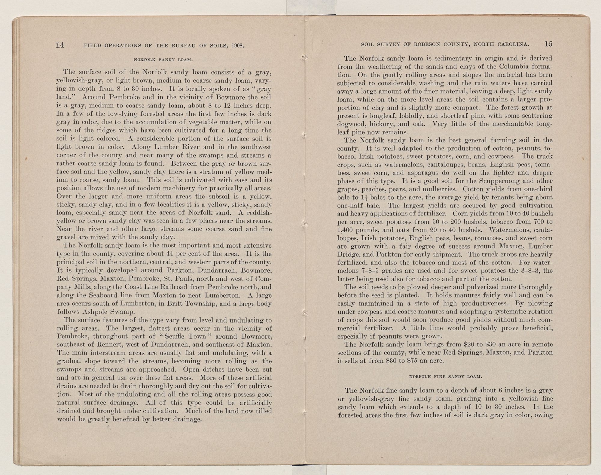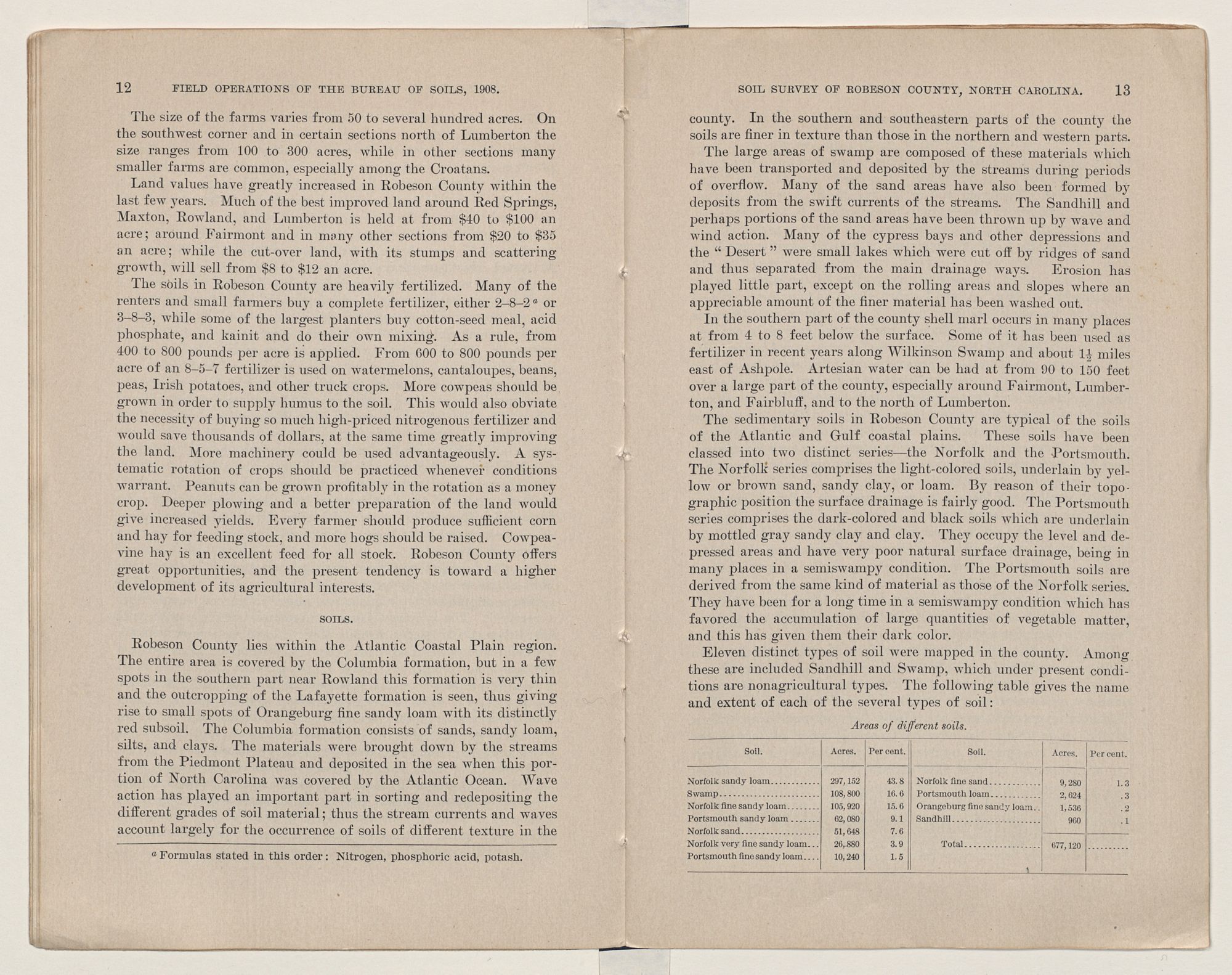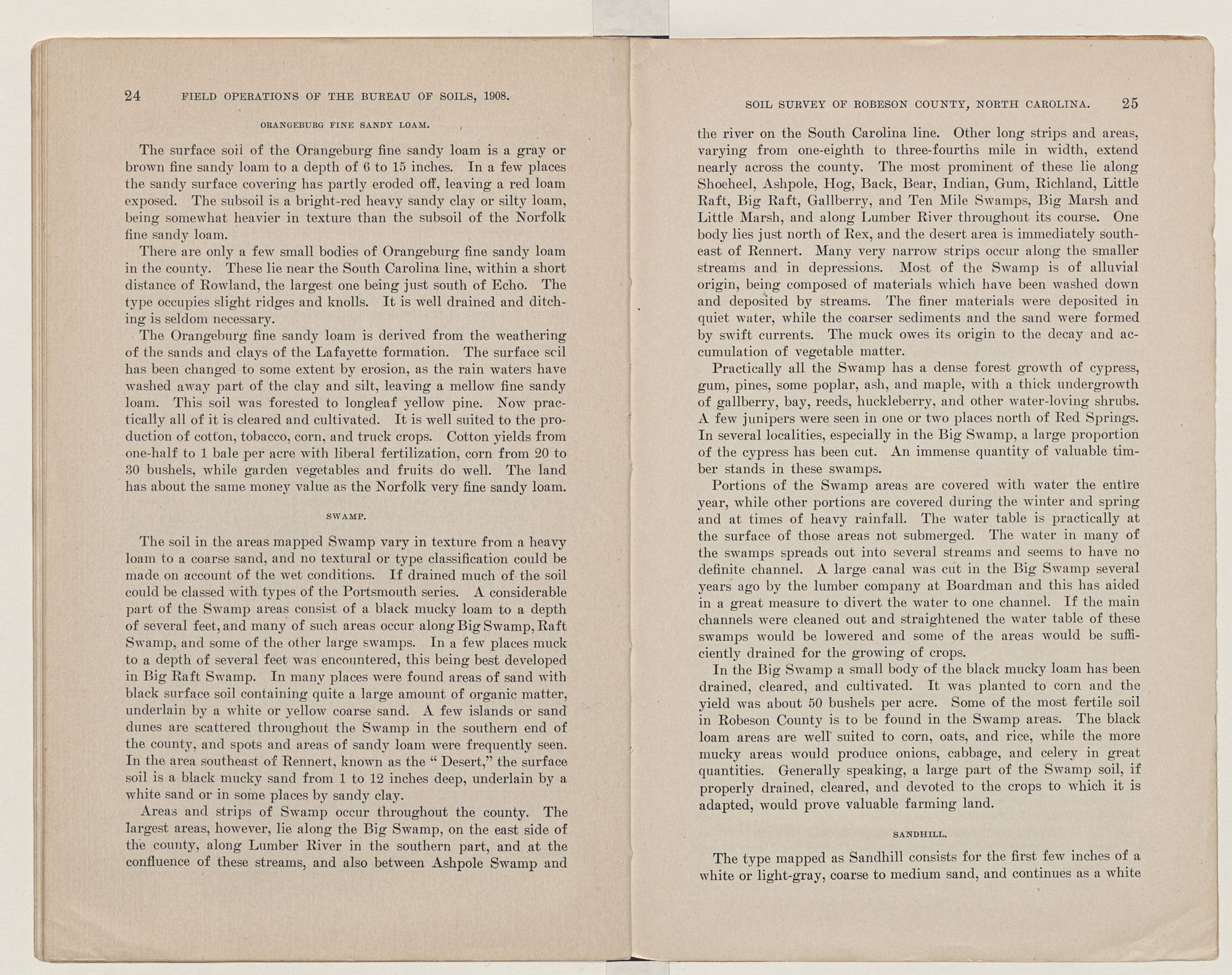 Soil survey of Robeson County, North Carolina. By W. Edward Hearn [and others] Washington : U.S. Government Printing Office, 1909. 28 p. 2 maps (1 fold.) 23 cm. (Advance Sheets - Field operations of the Bureau of Soils, 1908)