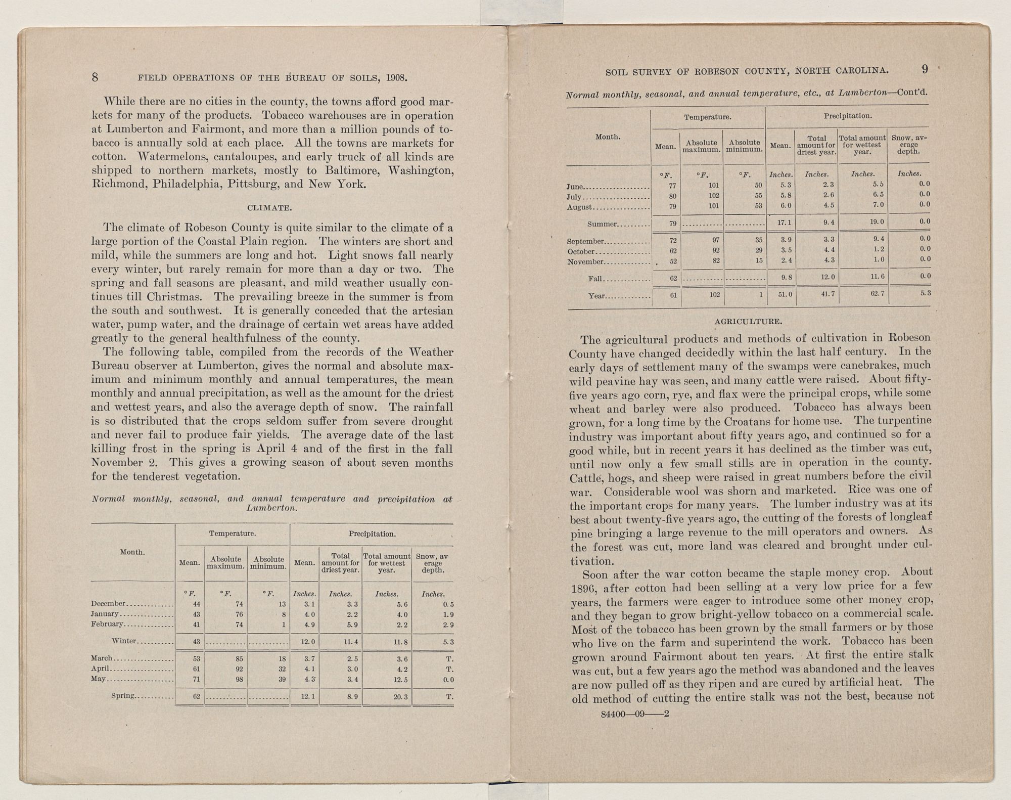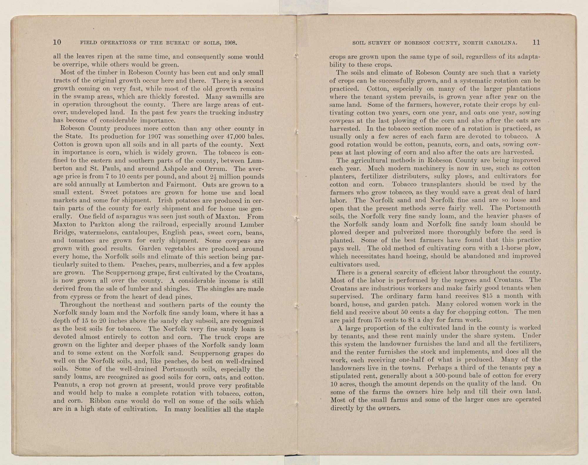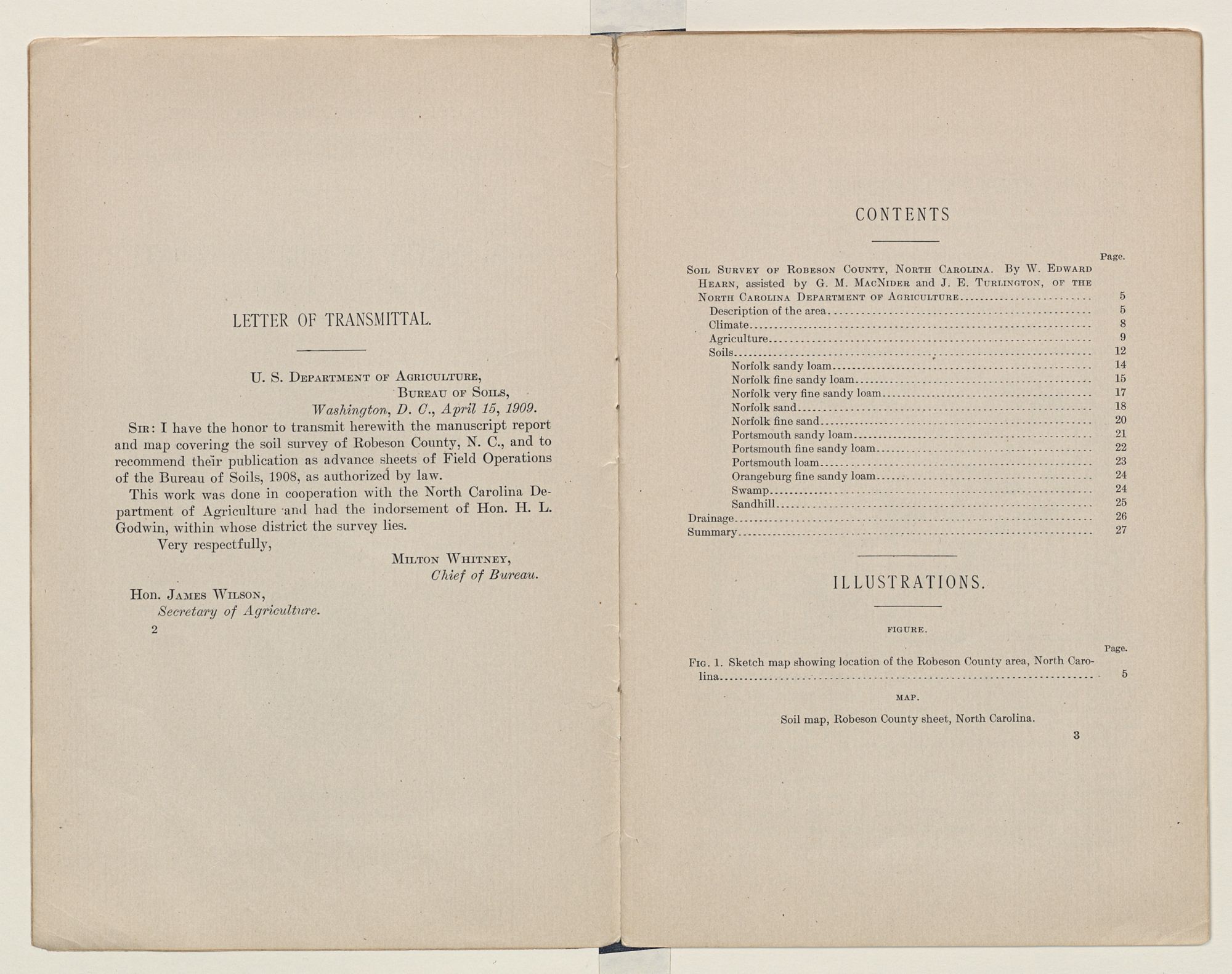 Issued October 5, 1909. U. S. DEPARTMENT OF AGRICULTURE. BUREAU OF SOILS—MILTON WHITNEY, Chief. IN COOPERATION WITH THE NORTH CAROLINA DEPARTMENT OF AGRICULTURE, S. L. PATTERSON, DIRECTOR, B. W. KILGORE, STATE CHEMIST.SOIL SURVEY OF ROBESON COUNTY NORTH CAROLINA.BY W. EDWARD HEARN,ASSISTED BY G. M. MACNIDER AND J. E. TURLINGTON, OF THE NORTH CAROLINA DEPARTMENT OF AGRICULTURE. [Advance Sheets—Field Operations of the Bureau of Soils, 1908.]United States Department of Agriculture 1862 Agriculture is the Foundation of Manufacture and Commerce 1889