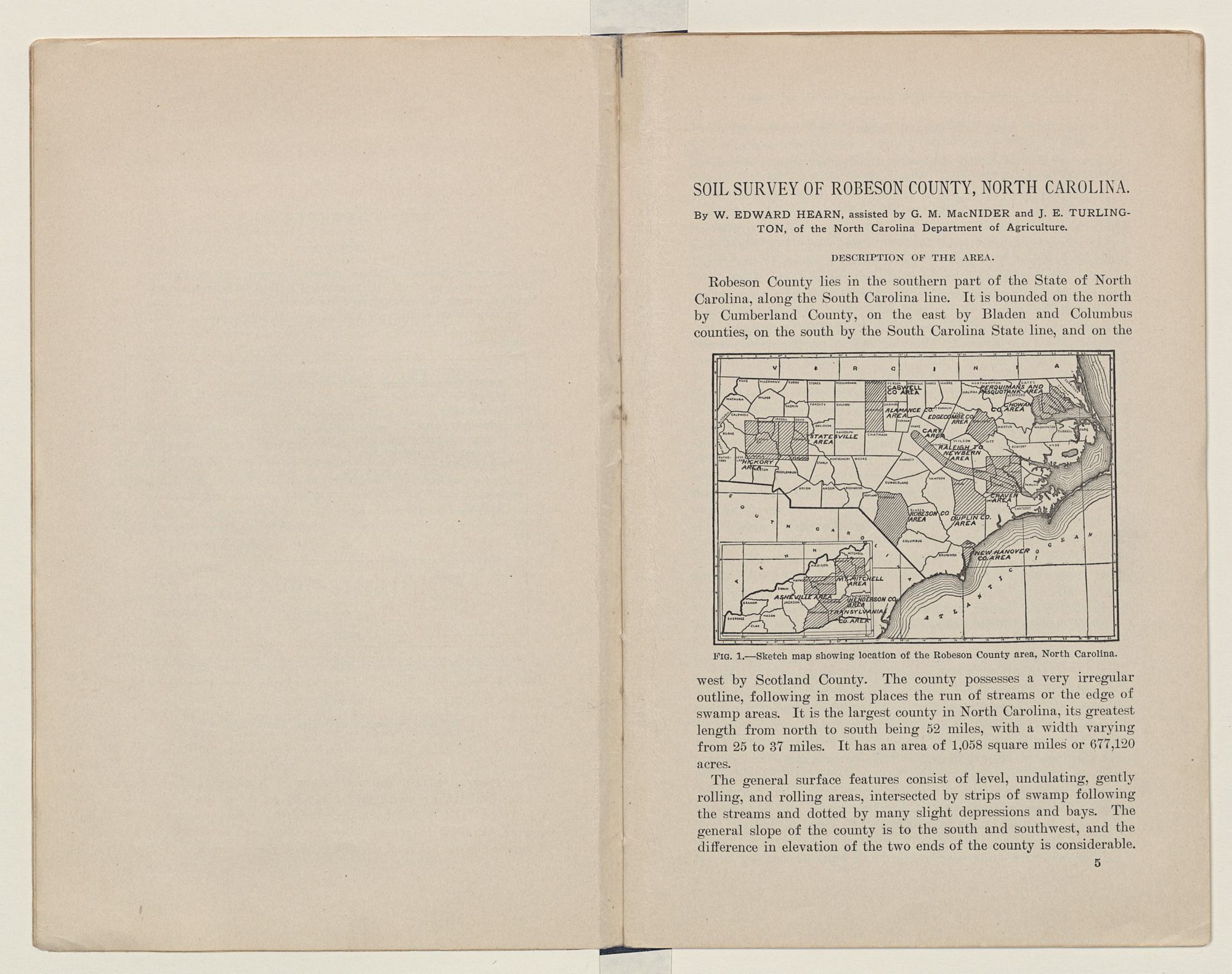 SOIL SURVEY OF ROBESON COUNTY, NORTH CAROLINA. By W. EDWARD HEARN, assisted by G. M. MACNIDER and J. E. TURLINGTON, OF THE NORTH CAROLINA DEPARTMENT OF AGRICULTURE5