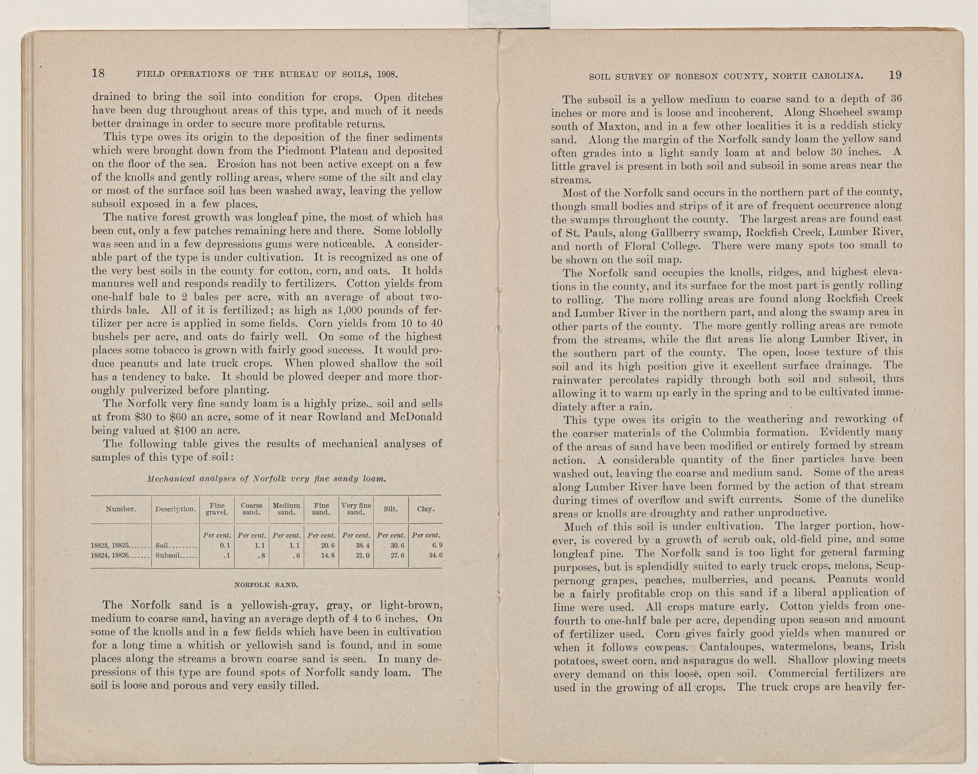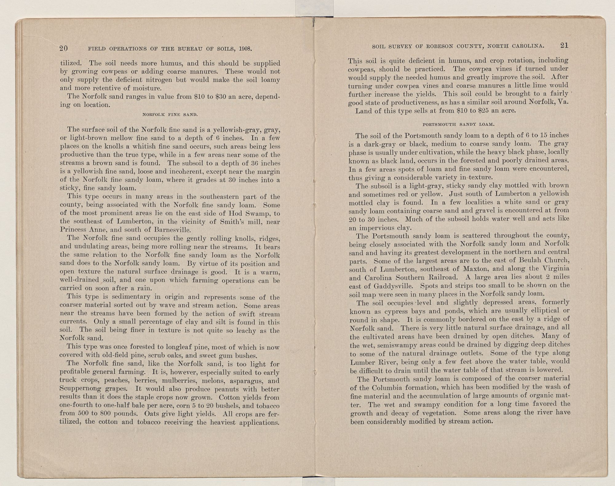 The soils of Robeson County are derived from the Columbia formation of sand and clays. The weathering of these sands and clays has given rise to two distinct and important soil series, viz, the Norfolk and the Portsmouth.