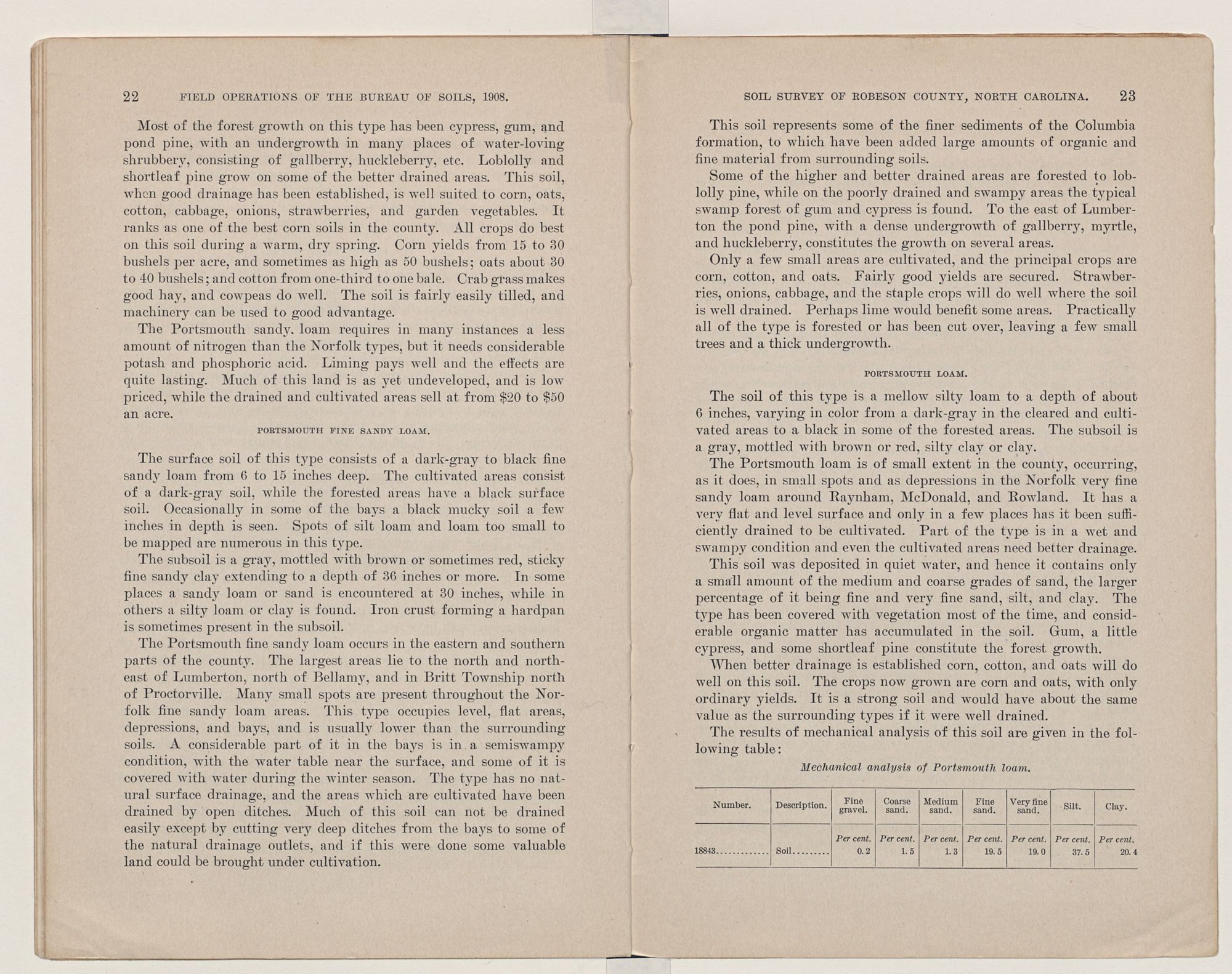 The Portsmouth loam is of small extent in the county, occurring, as it does, in small spots and as depressions in the Norfolk very fine sandy loam around Raynham, McDonald, and Rowland. It has a very flat and level surface and only in a few places has it been sufficiently drained to be cultivated. Part of the type is in a wet and swampy condition and even the cultivated areas need better drainage.