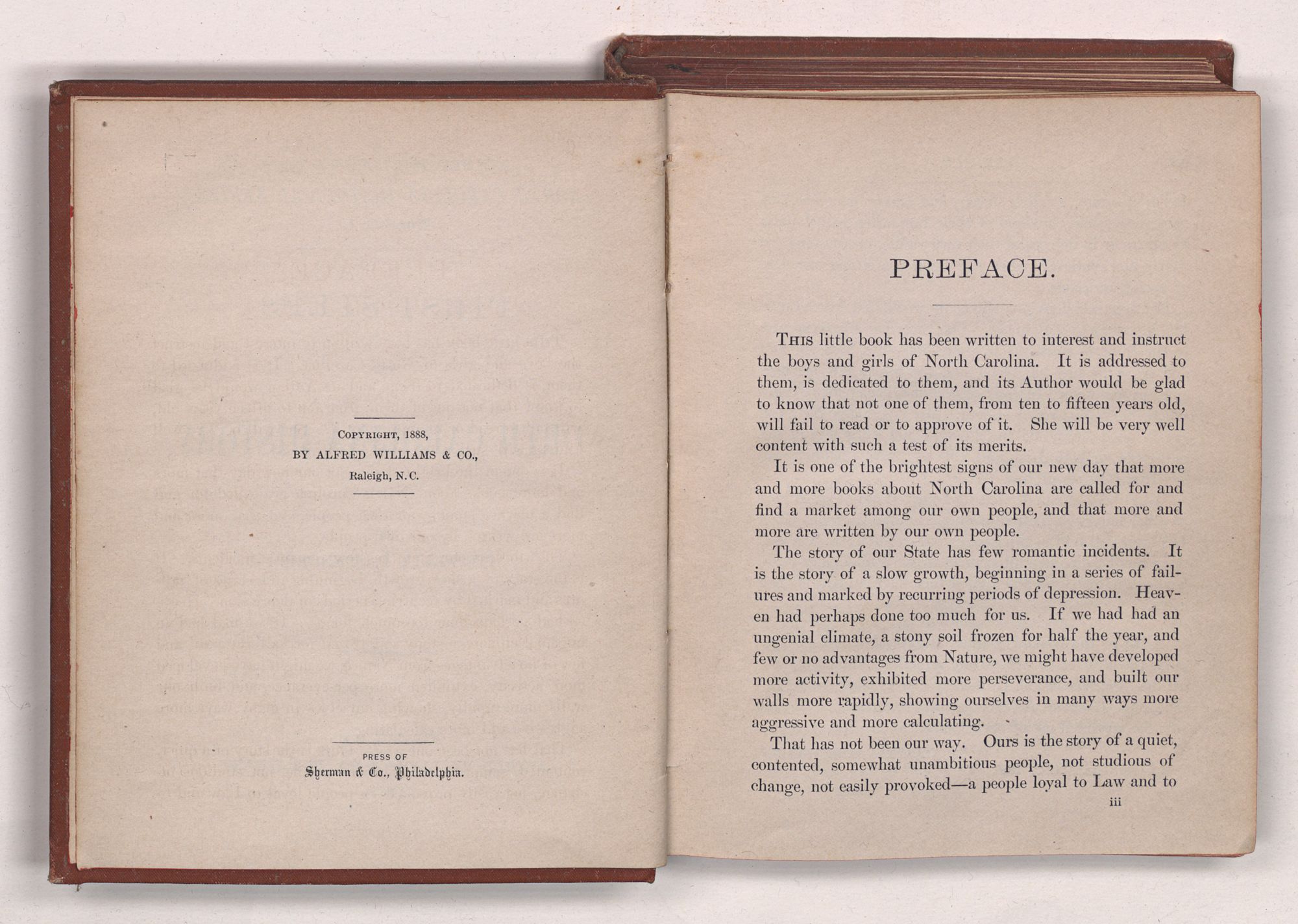 PREFACE.This little book has been written to interest and instruct the boys and girls of North Carolina. It is addressed to them, is dedicated to them, and its Author would be glad to know that not one of them, from ten to fifteen years old, will fail to read or to approve of it. She will be very well content with such a test of its merits.