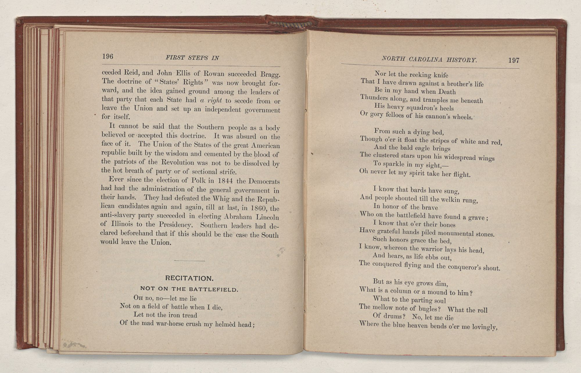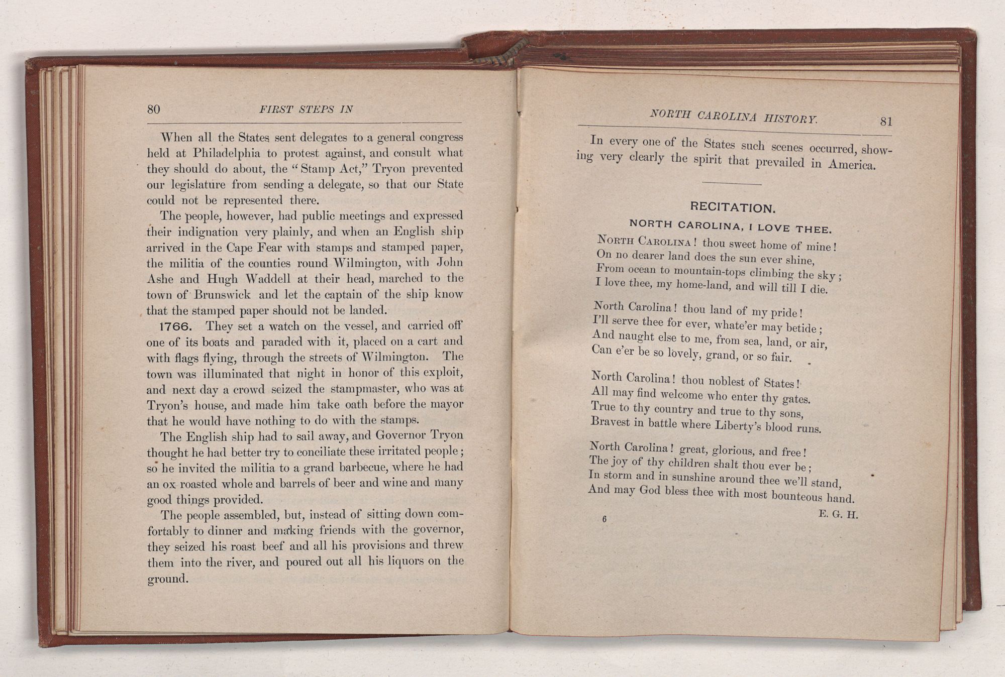 Wake while our flag in splendor floatsThy poet's dream, thy minstrel's notes.Where Freedom, Truth, and Peace abound,Such, men may well call hallowed ground;No dearer boon from Heaven we craveThan here our home and here our grave.O Carolina! well we loveThe murmur of thy dark pine grove,Thy yellow sands beside the sea,Thy lake beneath the cypress tree.We love thy stately groves of oak,Thy vines that hang o'er broad Roanoke;Thy mountains from whose rugged steepCatawba's rushing fountains leap;Bright, bright, thy beacon-fires shall burn,A sacred charge from sire to son,And here for aye we swear to crownWith laurels fresh thy old renown.Dear old North State! We greet thee hereFrom wild Watauga to Cape Fear;On thousand hills like brothers we will stand,And keep our watch for thee, our own dear land.