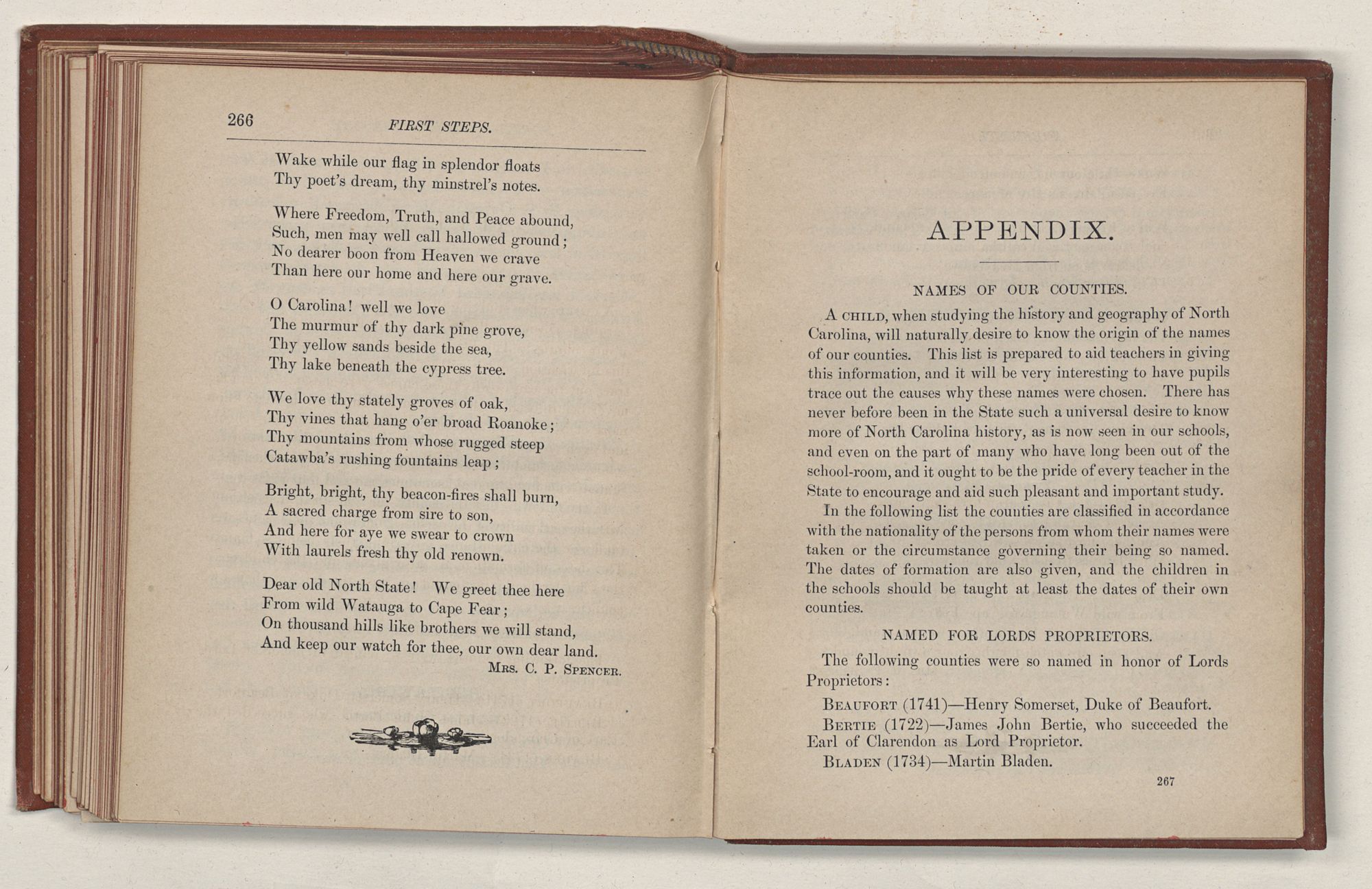 A child, when studying the history and geography of North Carolina, will naturally desire to know the origin of the names of our counties. This list is prepared to aid teachers in giving this information, and it will be very interesting to have pupils trace out the causes why these names were chosen. There has never before been in the State such a universal desire to know more of North Carolina history, as is now seen in our schools, and even on the part of many who have long been out of the school-room, and it ought to be the pride of every teacher in the State to encourage and aid such pleasant and important study.